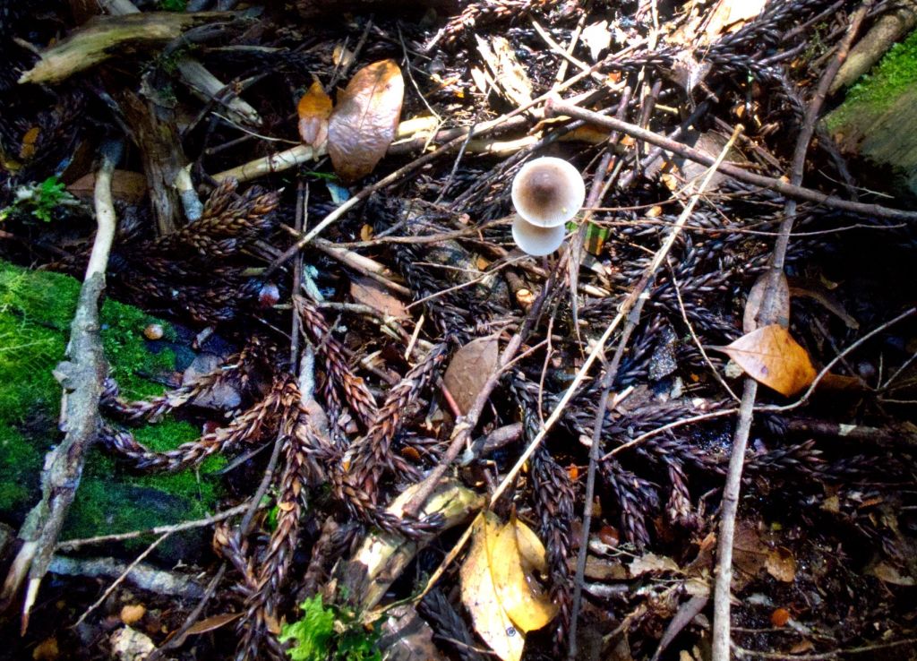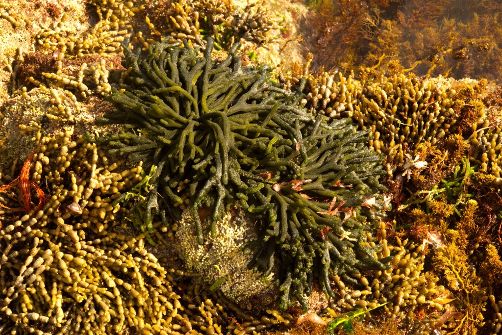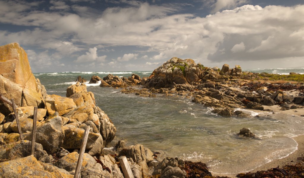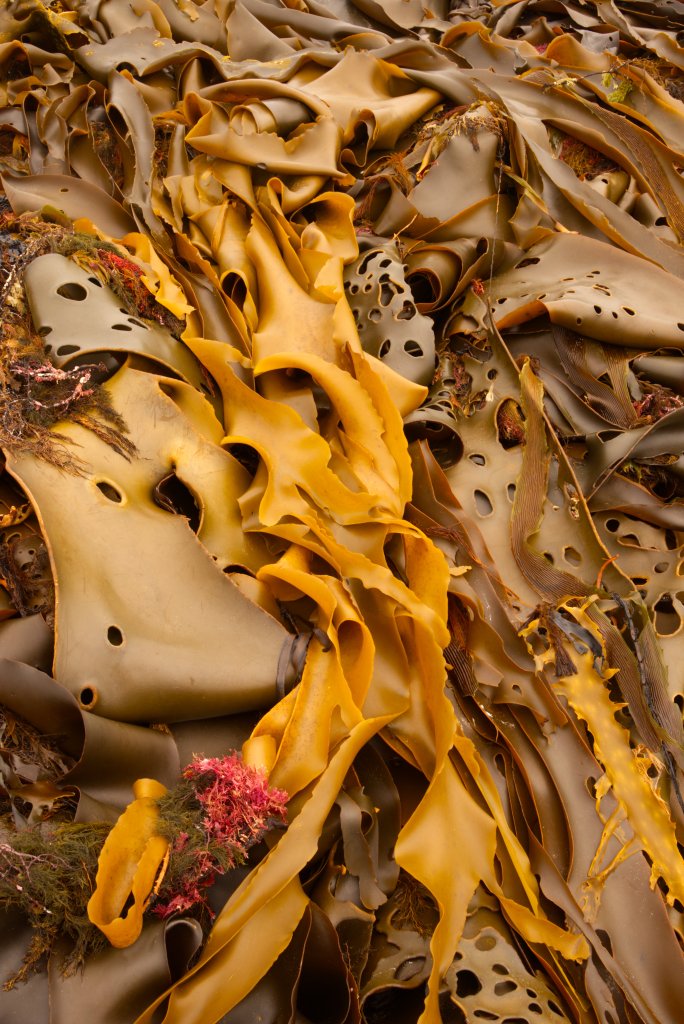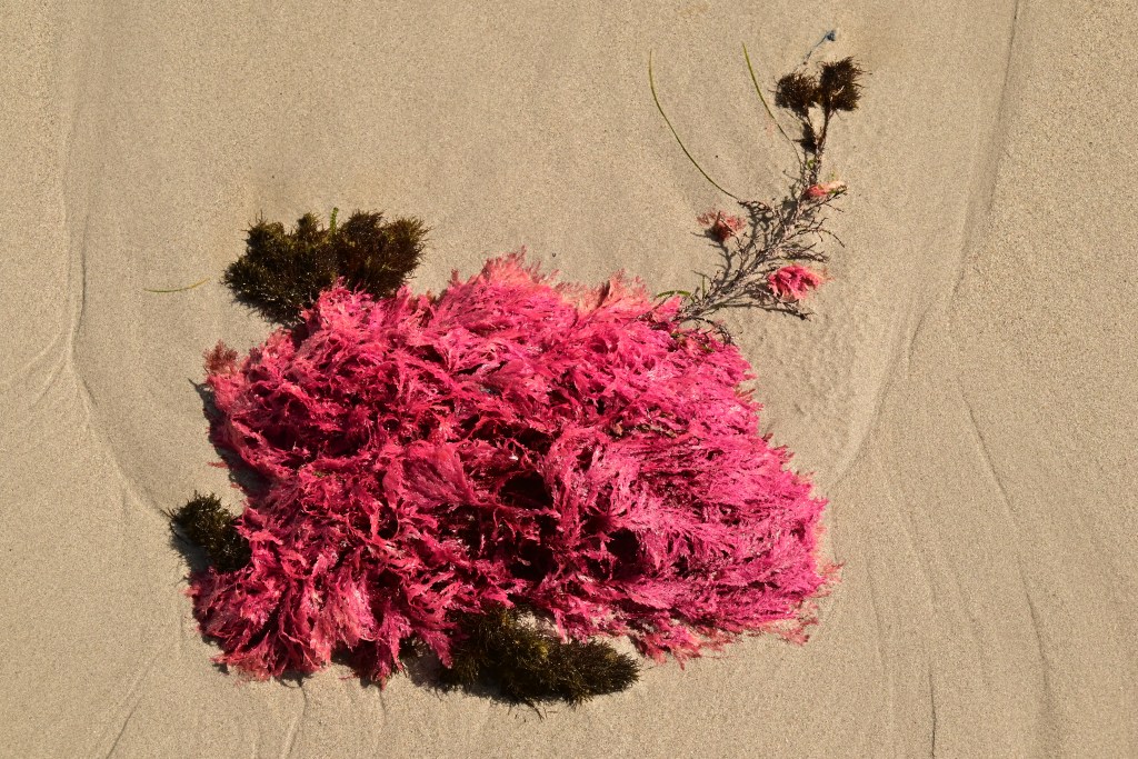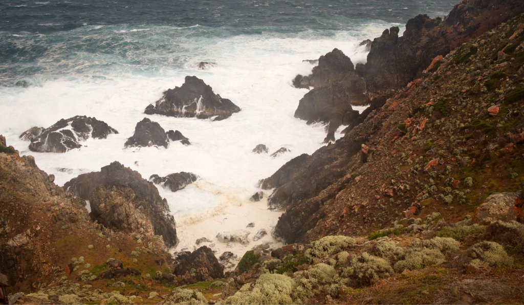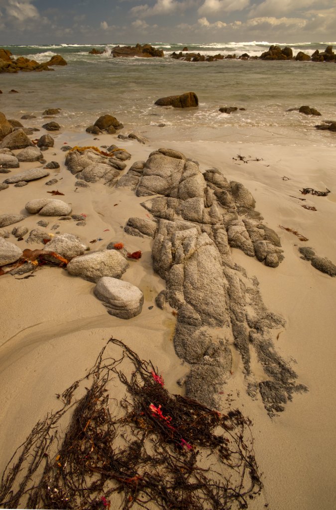 There are a host of Islands to the south and southeast. Their dark blue contours suspended on a sea, the colour and light of reflected steel. Water surrounded mossy wet rocks providing an uninspired foreground for photographs. The darkness from thick cloud stealing any faithful colours away. At first, there appears not much to see on the island, the rocky seashore, the small patches of native grass and wind stunted shrubs. Mary Anne called me over to look at some things on the ground. As soon as my eyes became tuned to the small and not the large, here were miniature gardens, composed of fine shards of tiny shells, purple scallop shells like Chinese fans, flecks of coloured seaweed and fragments of coral. Tiny and very beautiful. Now I could see, everywhere these tiny theatres of marine life. While they were nestled in sheltered clefts. Orange lichen flamboyantly covered any exposed boulders above the tideline.