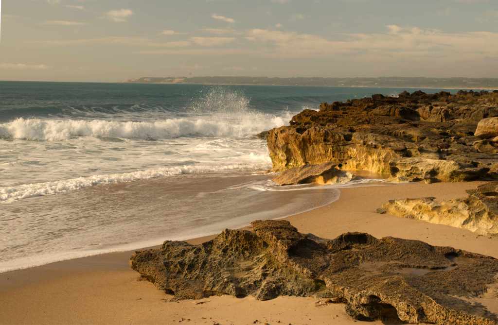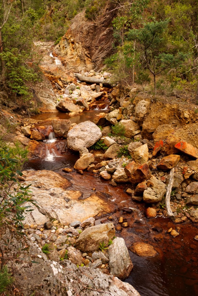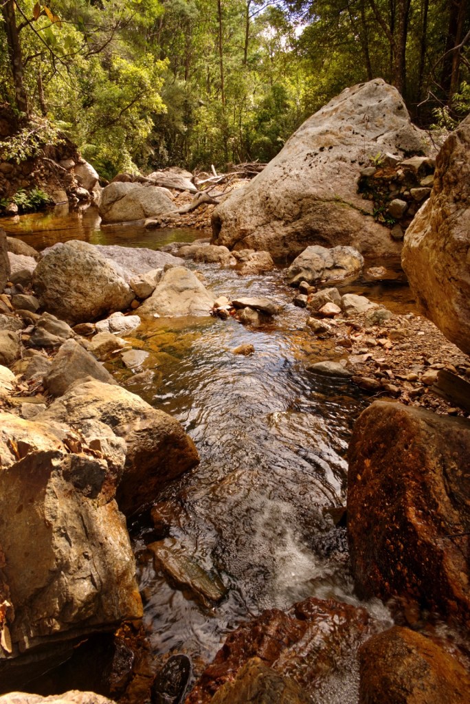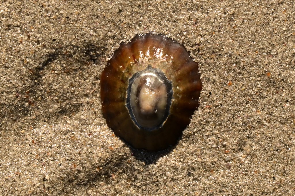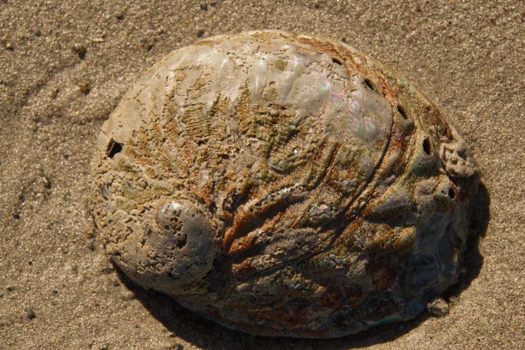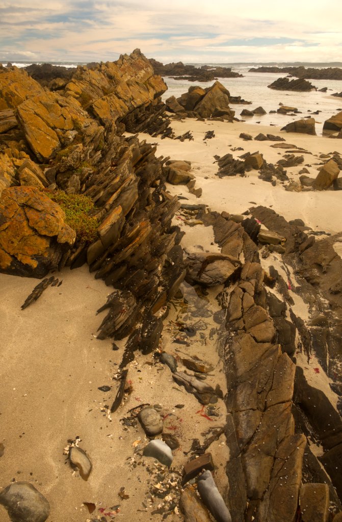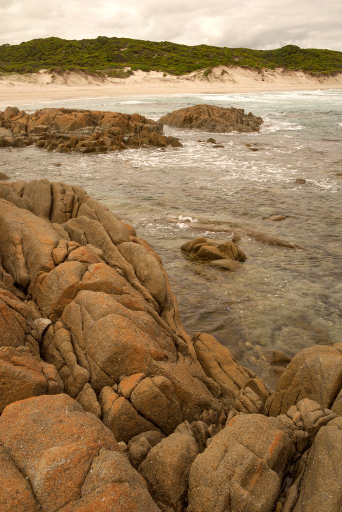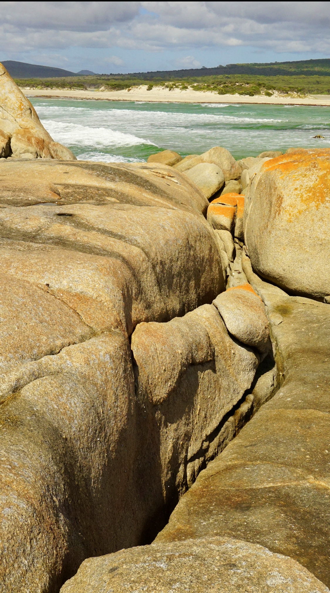 Boulders, smoothed by the sea, quixotic shapes; broad pillars carved narrow at their base to stand as inverted roughhewn pyramids. I see caves deep enough for permanent darkness despite a sunlight sky. The most vivid orange stains on the boulders are from lichen. The lichen is most abundant on any sunlit side, and any surface sheltered from the tides. To wind, sand, spray and storms, these tiny living things, give no heed at all. Lower down on each boulder, where water covers the stone much longer each day, the lichen is absent. It is replaced by slimy, translucent moss. Small black seashells (? nerites) and Pipis crowding the surface, waiting for the incoming tide.