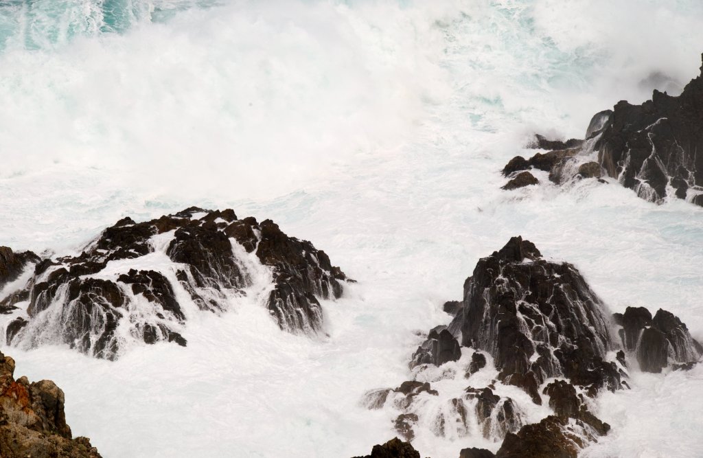Initially all was calm, and the wind was soft, until we passed the northern tip of Blyth Point, and left the shelter of land. Here the currents and winds were at odds, and the water and wind grew more challenging. The depths and heights, and the force of the swell had greatly increased, large waves, white caps broke near to us suggesting a nearby reef. The prow of the kayak barrelled into the rising black of a wave, then launched upwards from a mixture of momentum and buoyancy, sending white sea water streaming along the foredeck and over my spray skirt. Superimposed on the greater battle, dark wavelets darted up and down with nowhere to go.