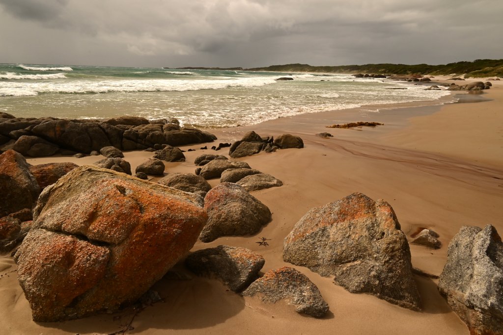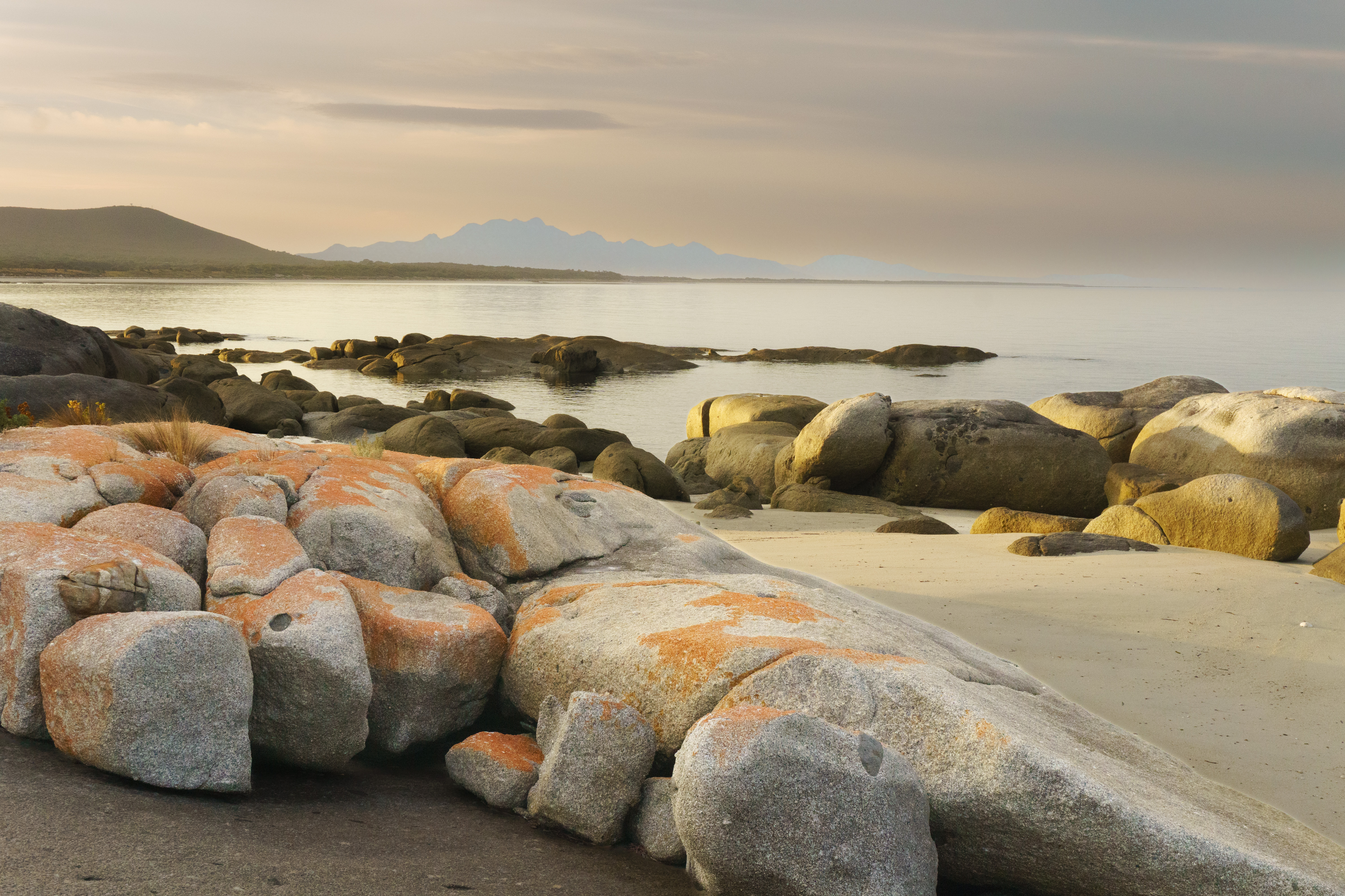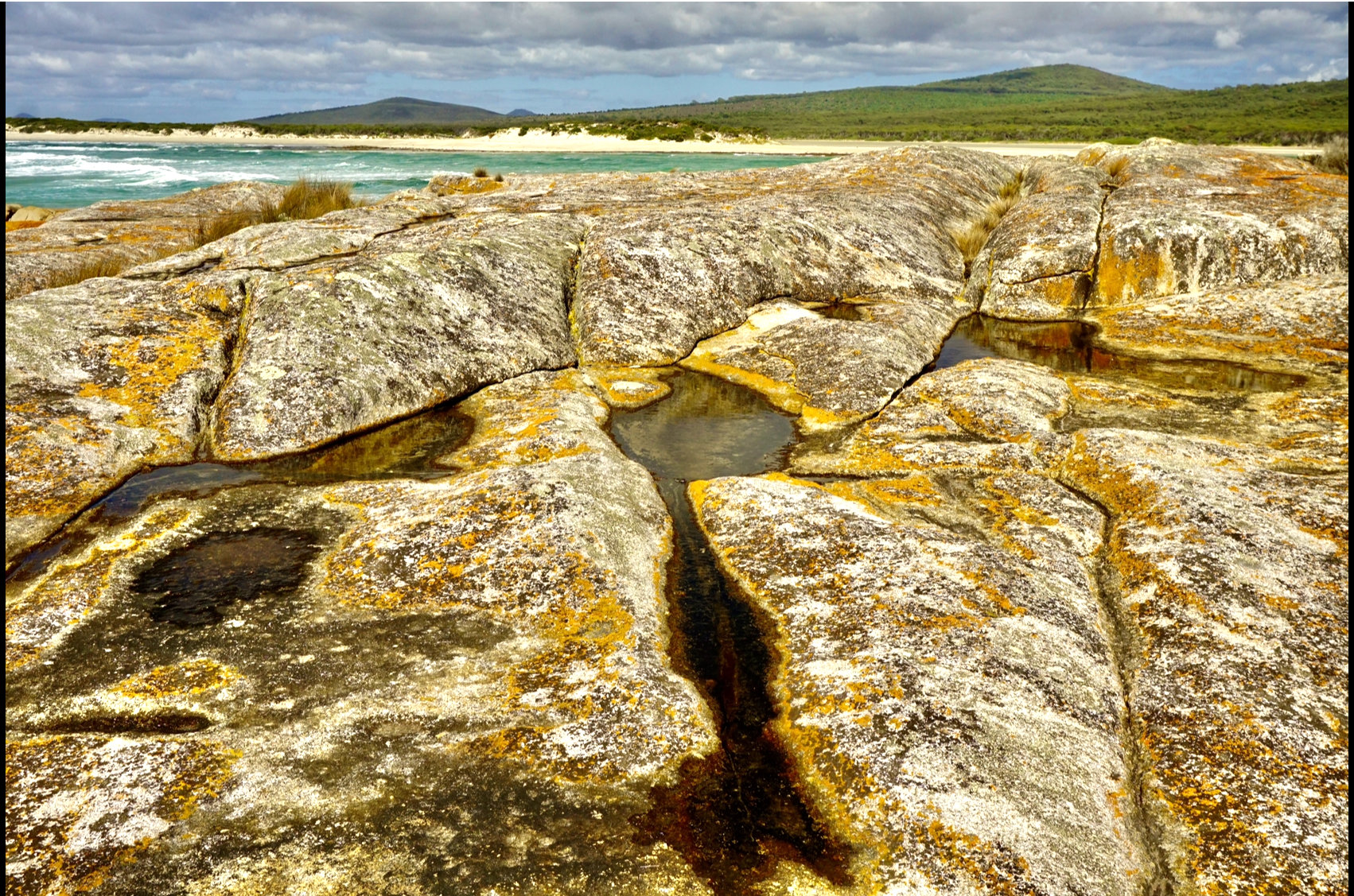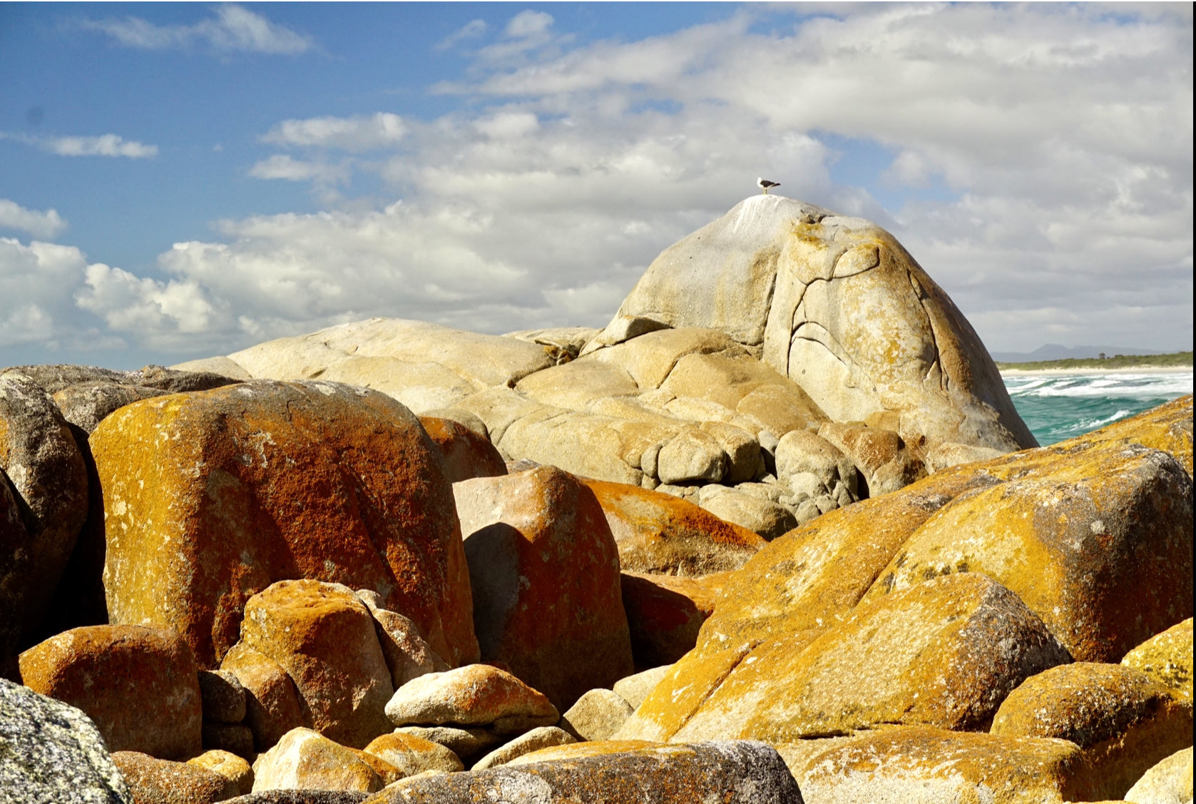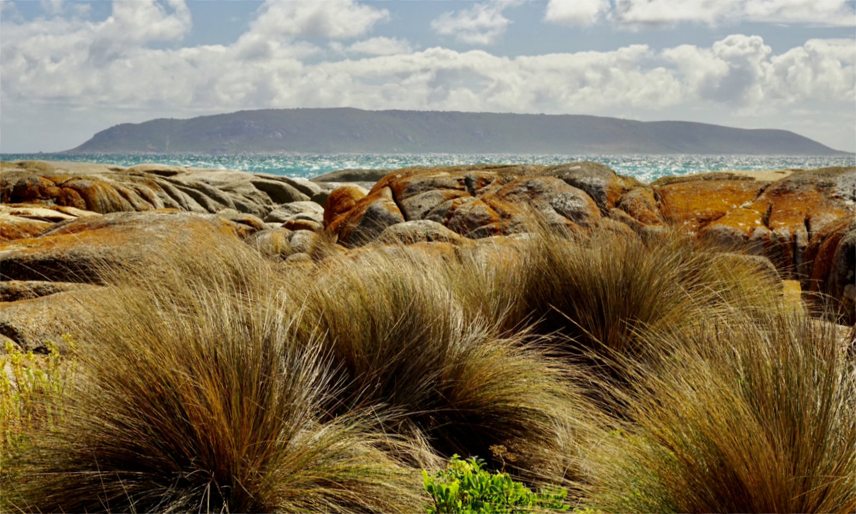 We landed at Whitemark Airfield, after a 40-minute flight. At the airfield, the bus was parked, waiting patiently for us to store our gear and then climb in. Mads drove us to Lillies Beach. There was no one else on the beach. A beautiful long beach, garlanded with red, dried out sea grass tumbled onto long swathes to well above the water line. We had our first sight of the granite boulders which are ubiquitous, extending from mountains to beach and to water. Richly coloured by extensive, by touch imperceptible, orange lichens. Now mute, these sand blown and water carved sentinels seem to guard the beaches. The sea water is translucent, its colour is a limpid green in the shallows and a steely blue away from the oceans edge. Wooden pillars of an ancient jetty, stand witness as white and grey ghosts of a time when sealing and whaling demanded easy access to the coast.