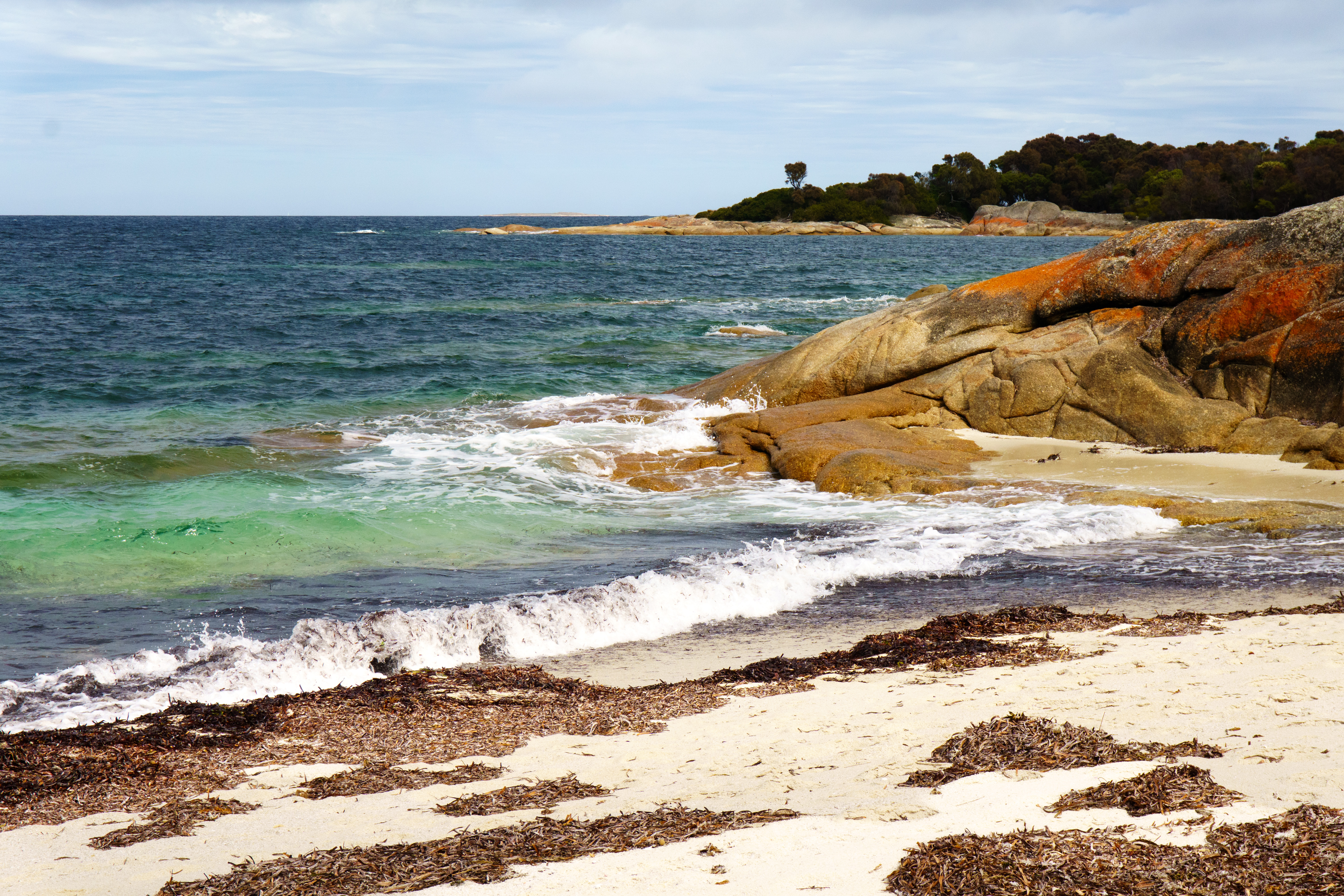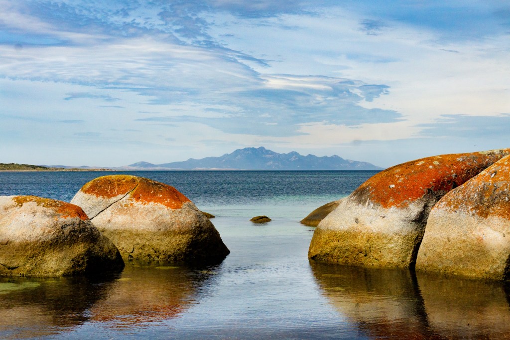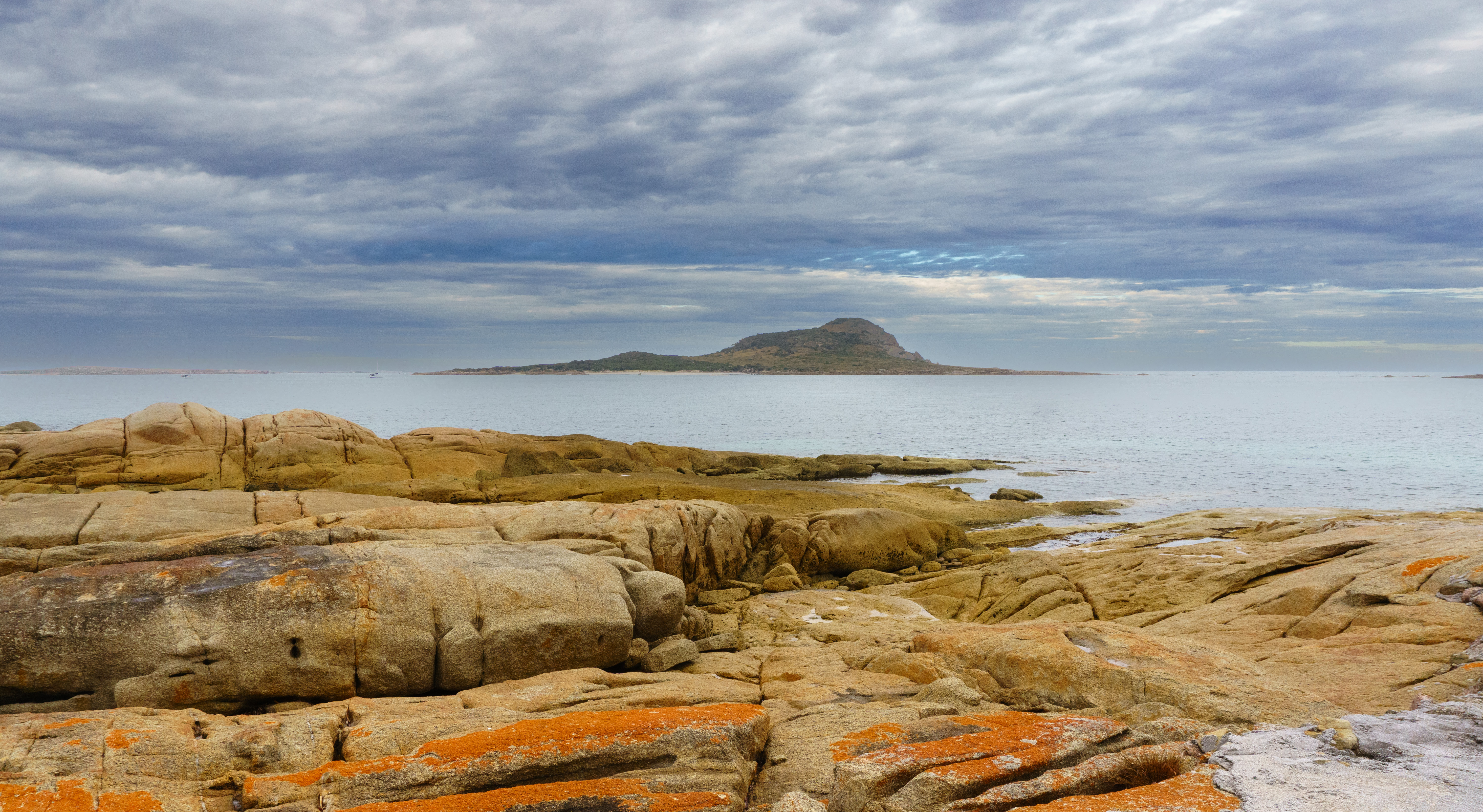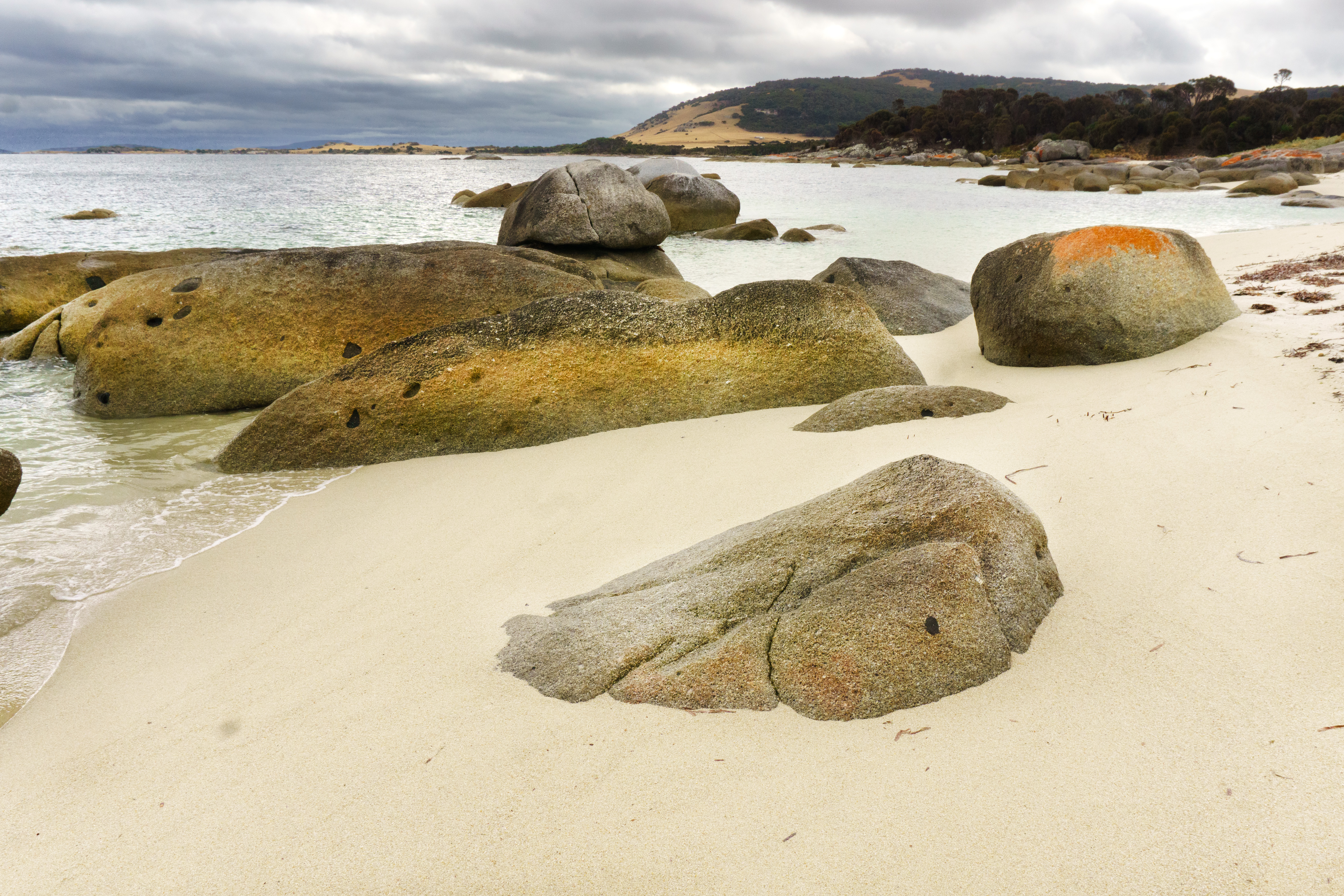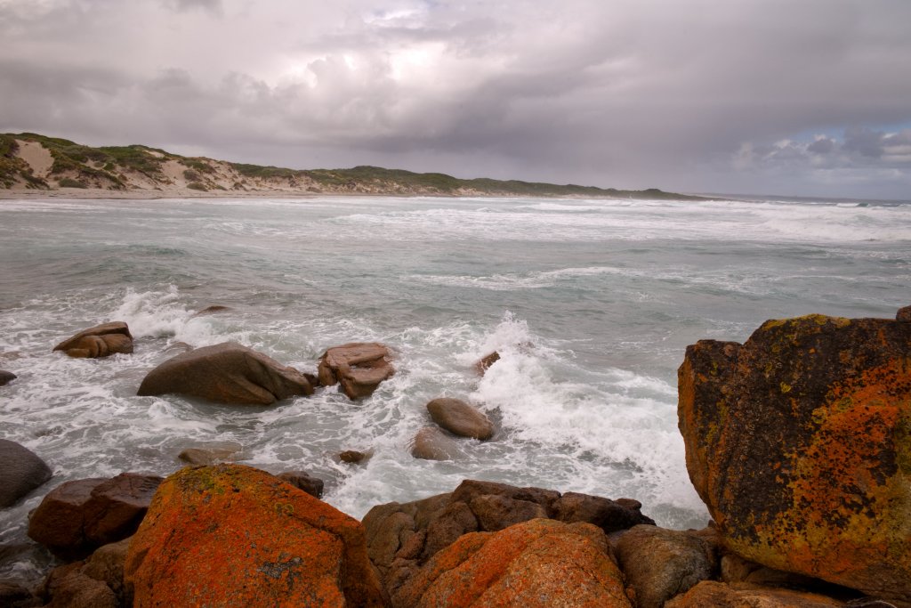 We landed at Whitemark Airfield, after a 40-minute flight. At the airfield, the bus was parked, waiting patiently for us to store our gear and then climb in. Mads drove us to Lillies Beach. There was no one else on the beach. A beautiful long beach, garlanded with red, dried out sea grass tumbled onto long swathes to well above the water line. We had our first sight of the granite boulders which are ubiquitous, extending from mountains to beach and to water. Richly coloured by extensive, by touch imperceptible, orange lichens. Now mute, these sand blown and water carved sentinels seem to guard the beaches. The sea water is translucent, its colour is a limpid green in the shallows and a steely blue away from the oceans edge. Wooden pillars of an ancient jetty, stand witness as white and grey ghosts of a time when sealing and whaling demanded easy access to the coast.