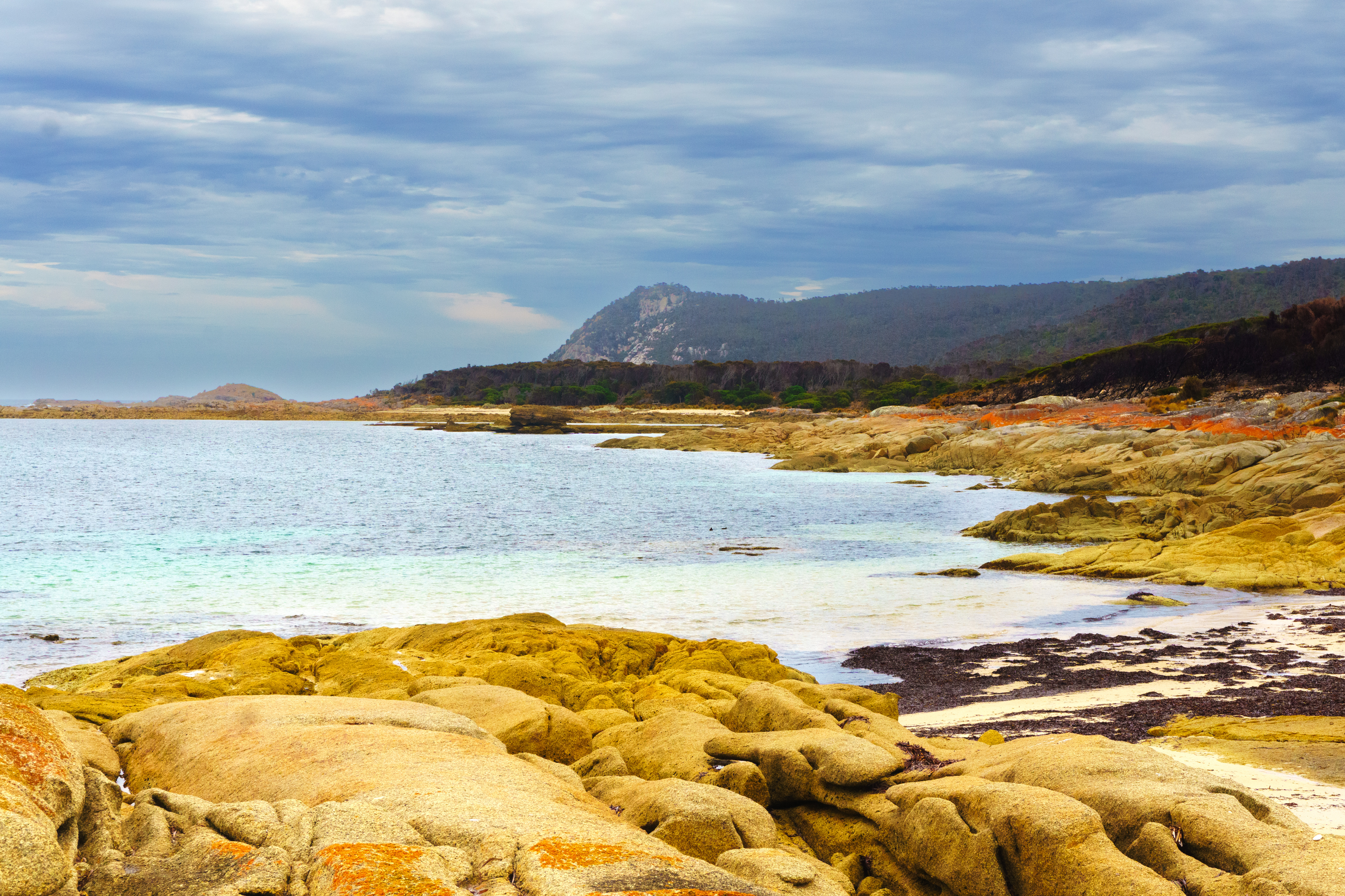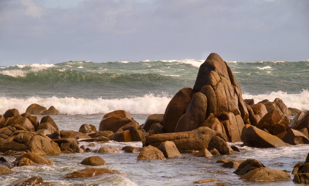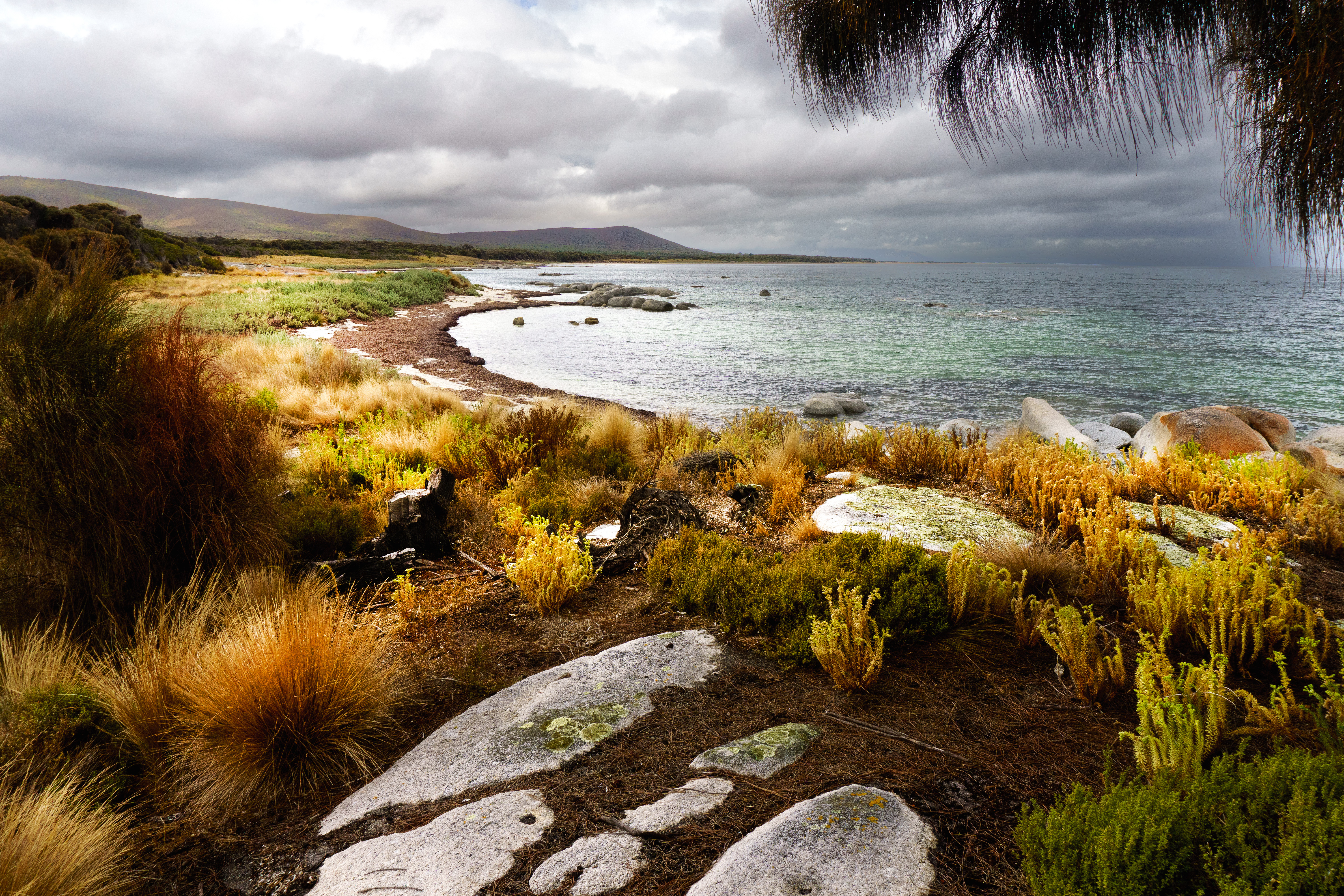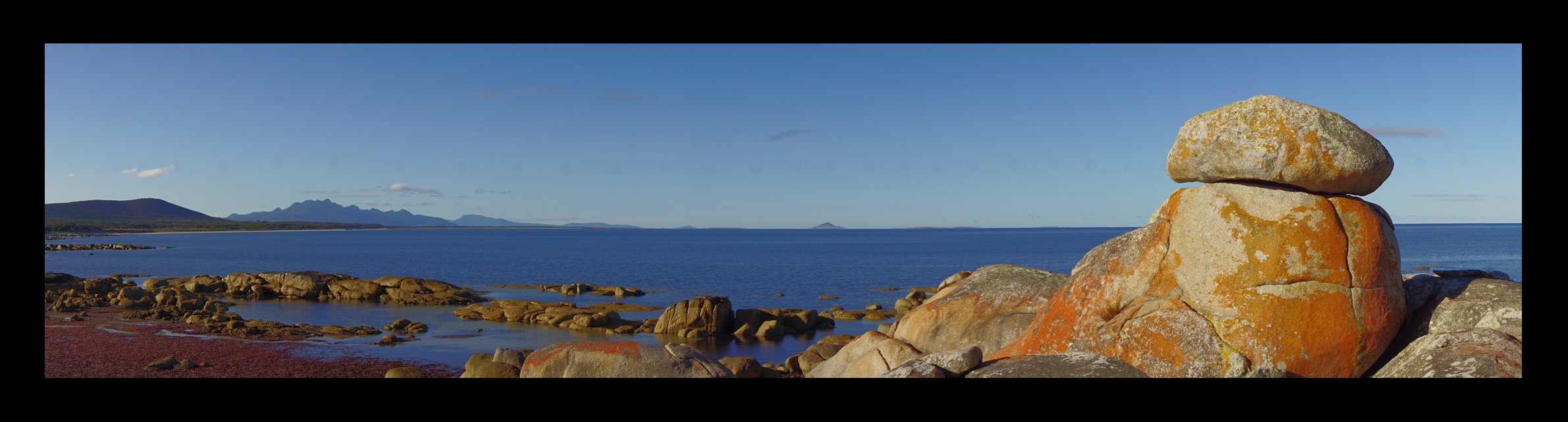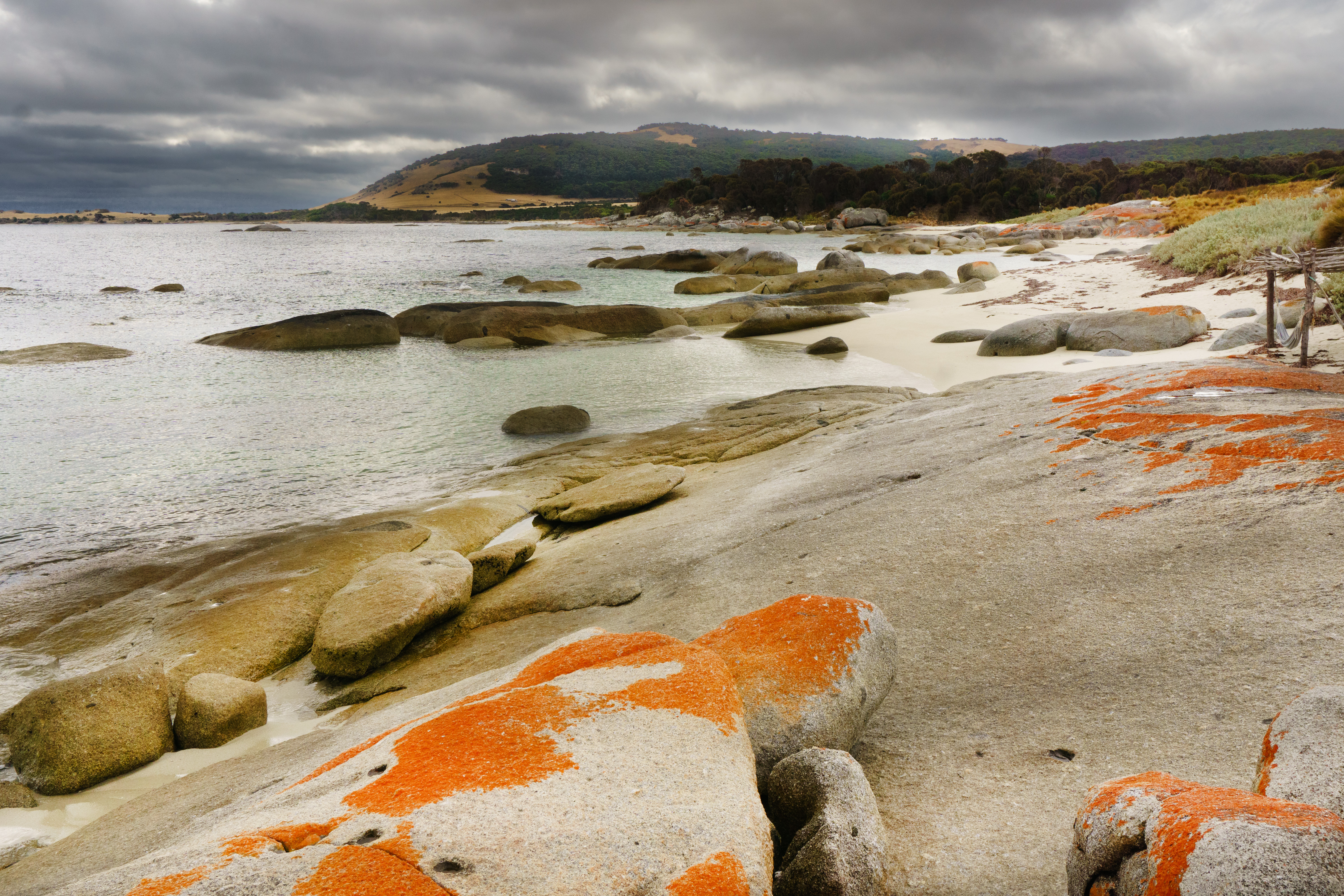 We landed at Whitemark Airfield, after a 40-minute flight. At the airfield, the bus was parked, waiting patiently for us to store our gear and then climb in. Mads drove us to Lillies Beach. There was no one else on the beach. A beautiful long beach, garlanded with red, dried out sea grass tumbled onto long swathes to well above the water line. We had our first sight of the granite boulders which are ubiquitous, extending from mountains to beach and to water. Richly coloured by extensive, by touch imperceptible, orange lichens. Now mute, these sand blown and water carved sentinels seem to guard the beaches. The sea water is translucent, its colour is a limpid green in the shallows and a steely blue away from the oceans edge. Wooden pillars of an ancient jetty, stand witness as white and grey ghosts of a time when sealing and whaling demanded easy access to the coast.