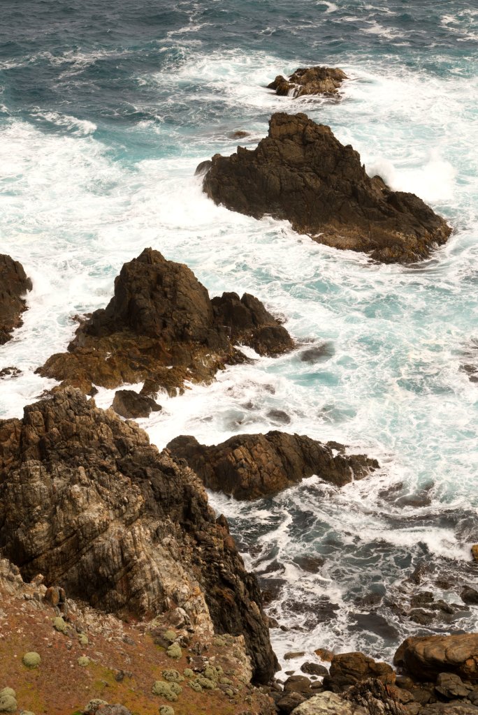 The water was rougher than on the previous trips with irregular waves atop the currents. These “confused” waves result from the different directions of wind, tide and current. Who wouldn’t be confused? We passed a small rocky island with its entourage of cormorants and pacific gulls. The cormorants drying themselves in the wind and the gulls peering out over the water from any vantage point high up on a peaked boulder.