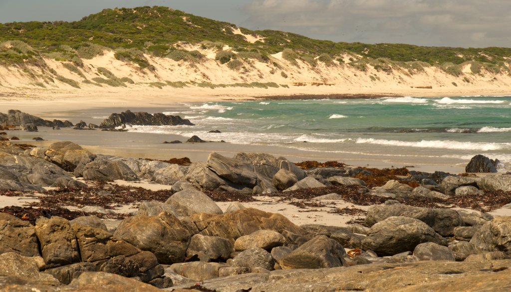 We soon entered the protection of Roydon Island, it’s main stony promontory shielding is from the wind driven waves. We passed beyond this, to see a beautiful, long sandy beach extending from the crests breaking along its shore to the thick scrub hugging the topmost sand dunes. This wide expanse of sand and shells runs between two rocky points. There were a group of brightly coloured kayaks already off the water. These paddlers had come from Melbourne and had island hopped across Bass Strait. Their longest stretch away from land had been 12 hours. Roydon Island is a recognised stop off for these crossers.