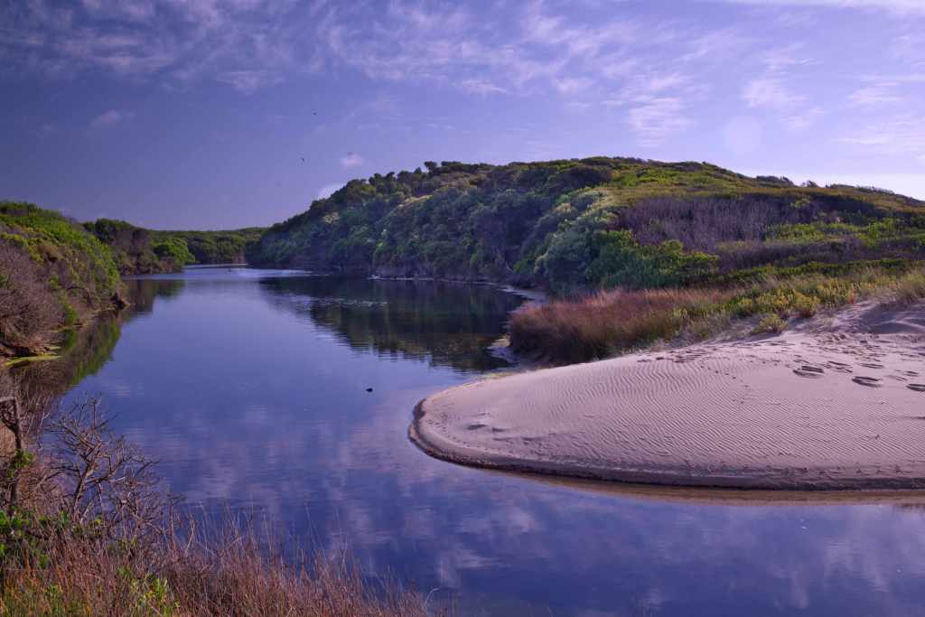 To our left, a thin spit of land, all of it just sand, separated the estuary from the sea, but it was enough to ensure a smooth paddle. Near the end as we were heading toward the shore to meet the trailer and bus, we crossed a sandbank, and stopped. I climbed out and pulled the stricken kayak with Jennifer in the stern to deeper water. I could not put the rudder back down and there was no one near enough to help, but we battled on, going right then left but finally getting to the shore. We may have flattened the batteries in our GPS watches.