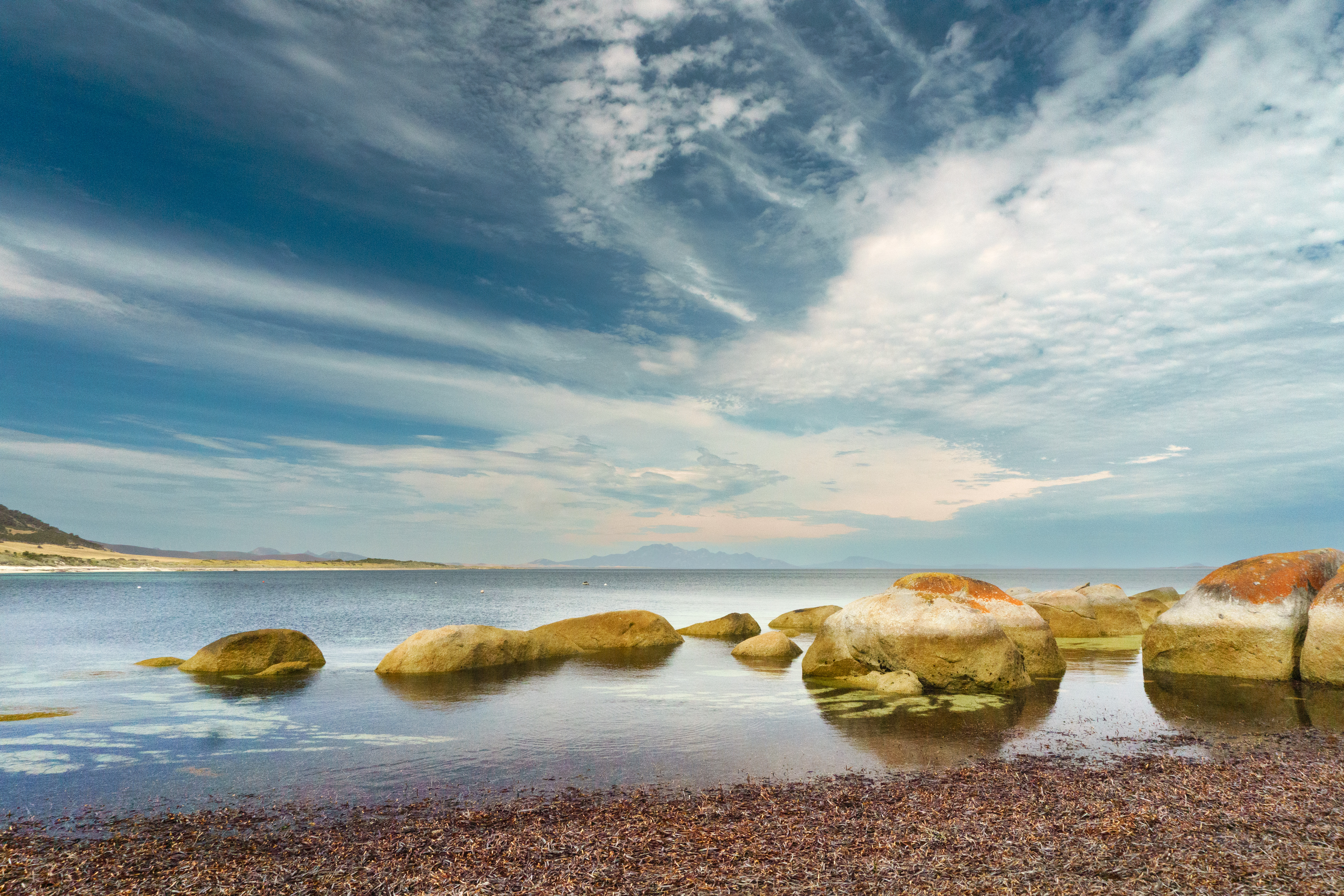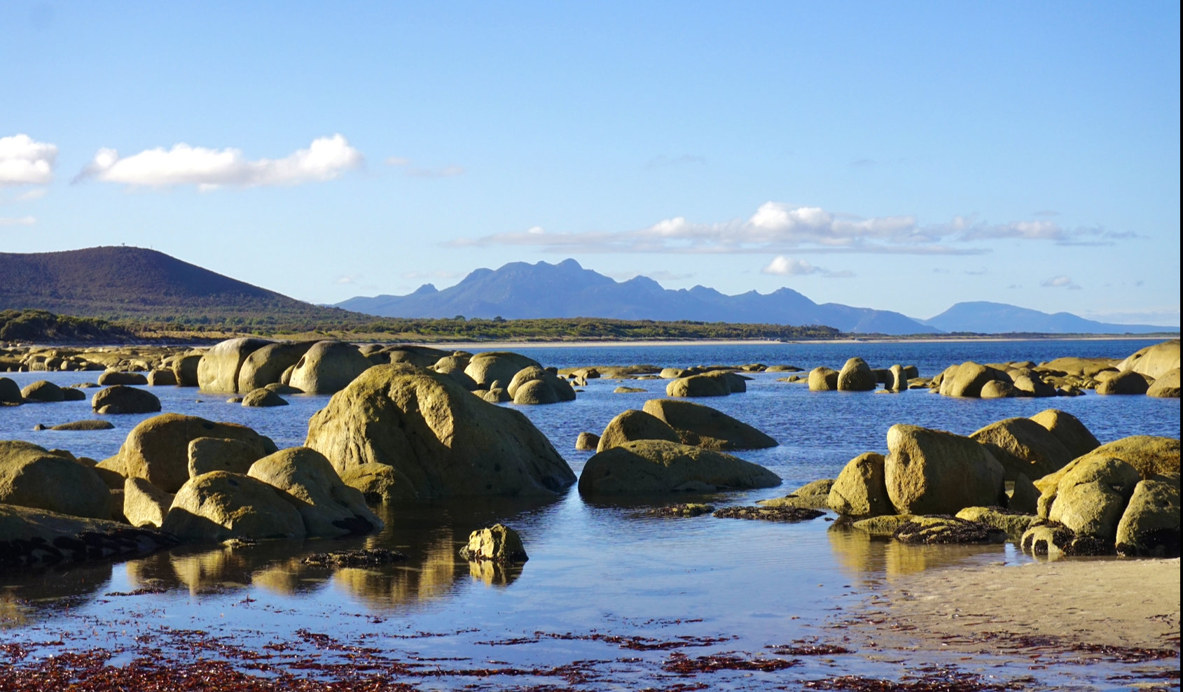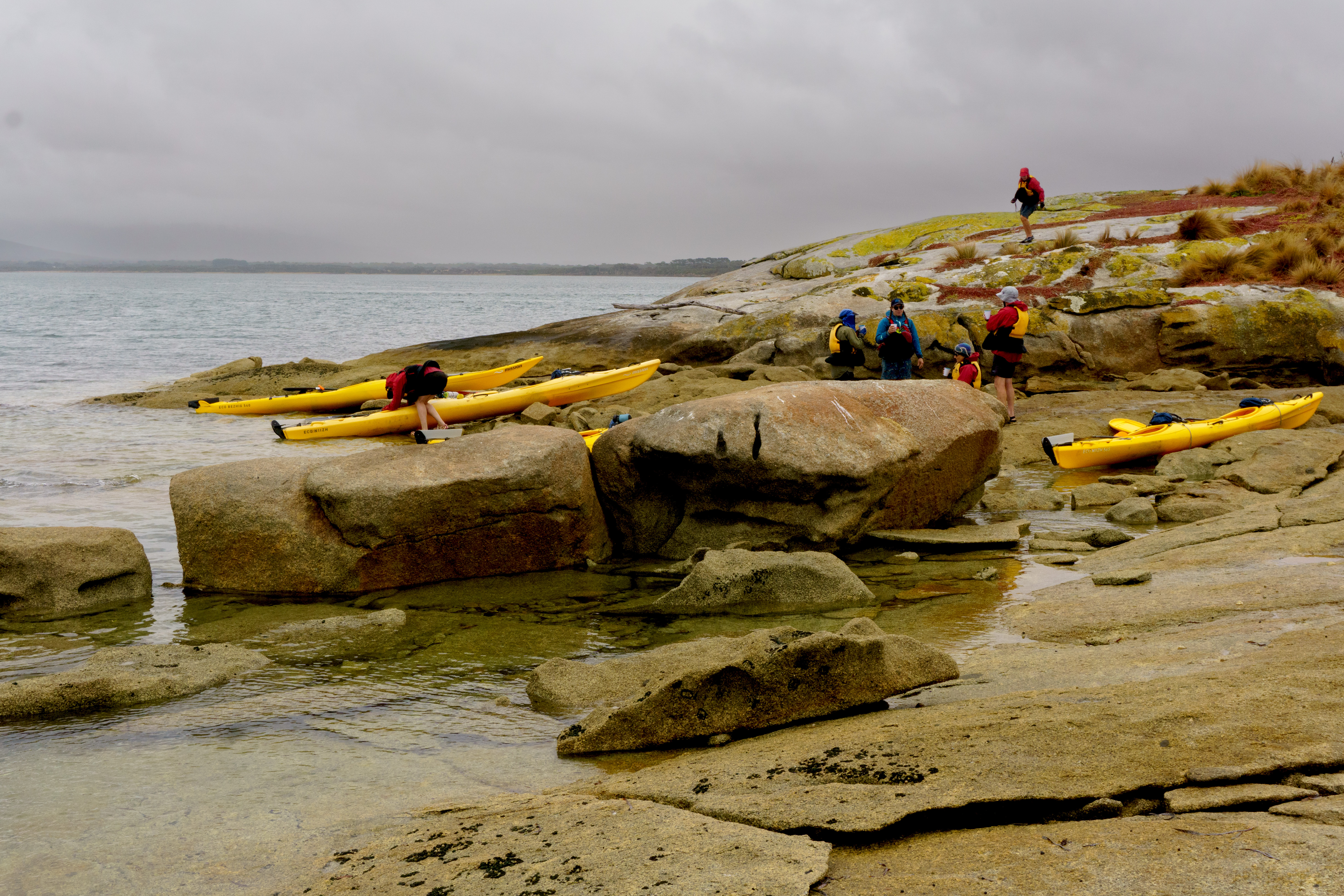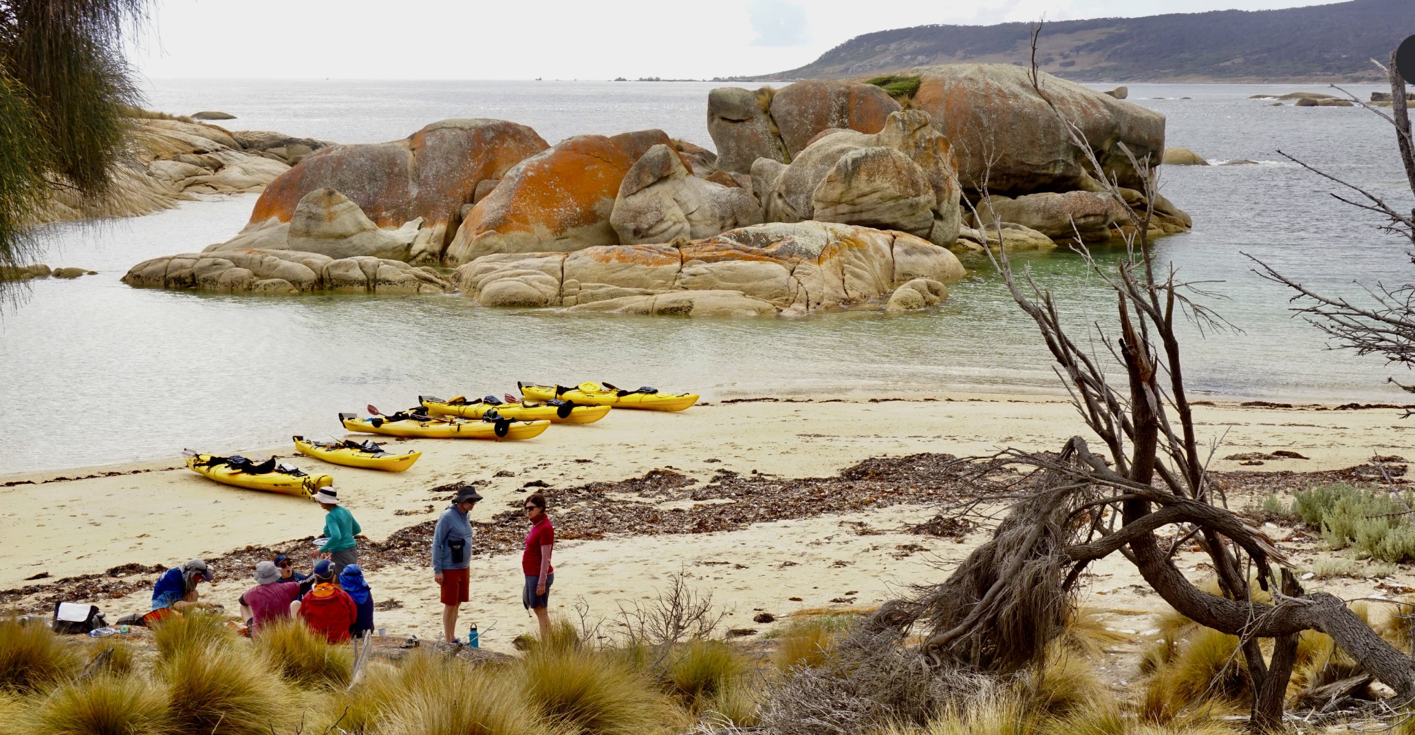 Another warm and sunny day, a few clouds blown listlessly over the horizon. We went in the bus to Allport’s Beach. A typical Flinders Island beach with sand curving across the bay, and boulders resting together at one end, adjacent to where we launched the kayaks. The water was calm, almost still, until broken by the rhythmic attack and draw back of each blade. As the blade propels, passing beside the hull, it creates a whoosh and thrum in the water. With each stroke, I can both hear, and feel this resonance in the kayaks shell.