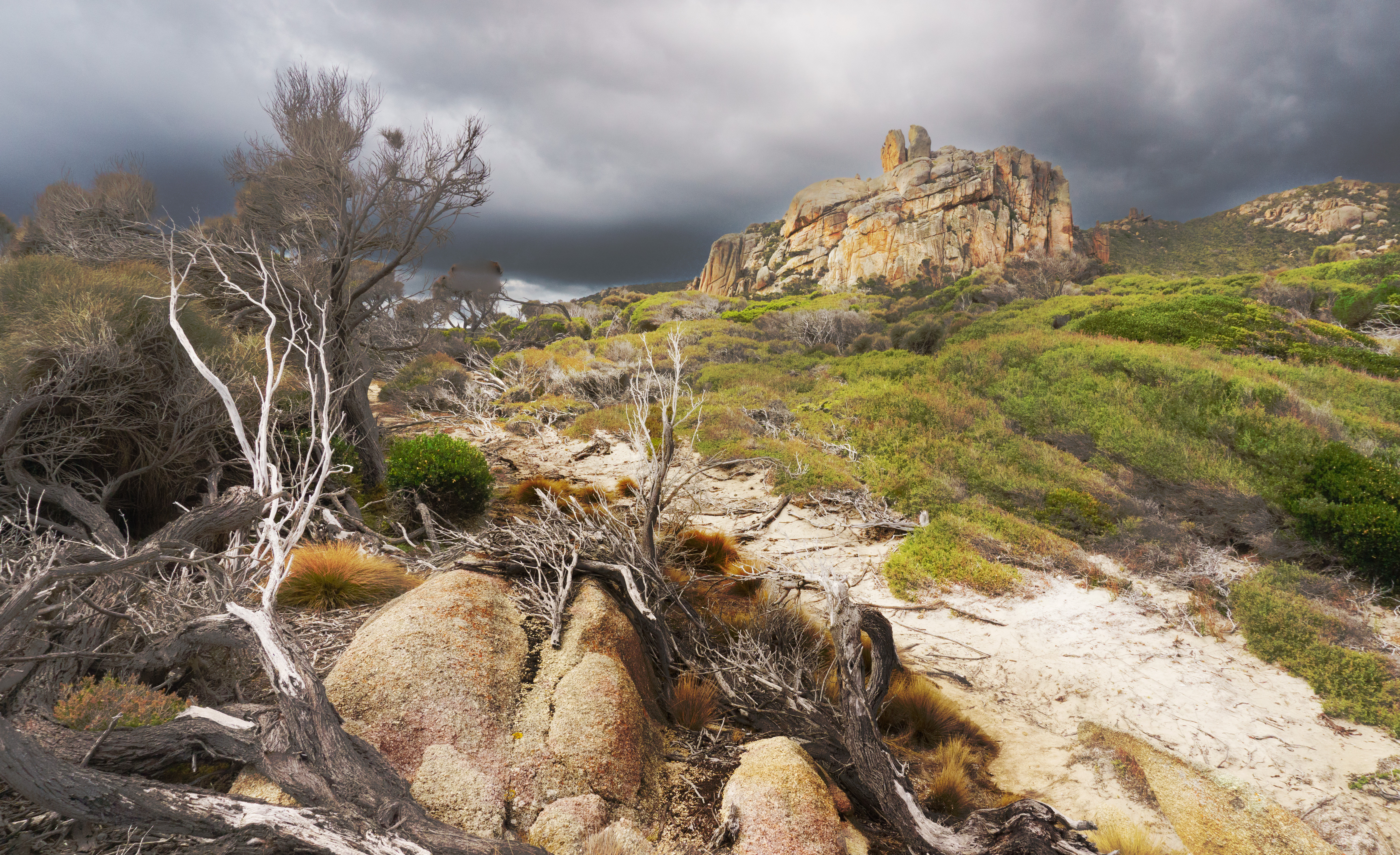 We leisurely paddled between these ocean marbles; boulders scattered by the ancient shattering of great columns of granite. Cormorants sunned themselves in small groups atop round boulders, covered in guano. We beached the boats at Limestone Bay for a toilet break. I climbed up the sand above the beach, through the low-lying scrub and toward a ridge, to view Mt Killicrankie. It was only a short paddle to the Dock, a long deep beach sheltered by a virtual labyrinth of boulder sand tiny islands. Above us was the mountain itself. This is a magnificent location and we had similarly magnificent weather. The mountain is steep, with immense granite cliffs. Eucalyptus forests, Melaleucas, and many native trees and shrubs, crowd the land between the beach and the low foothills. I saw where a mini cyclone had passed ripping out and smashing trees, their broken trunks scattered around me. I walked to and fro exploring and when walking up to one vantage point, I felt a sudden tear high in my left calf. For the rest of the trip, I was on boat securing duty rather than lifting the boats as it was painful to walk. It had no effect on my kayaking ability, modest to begin with in any case.