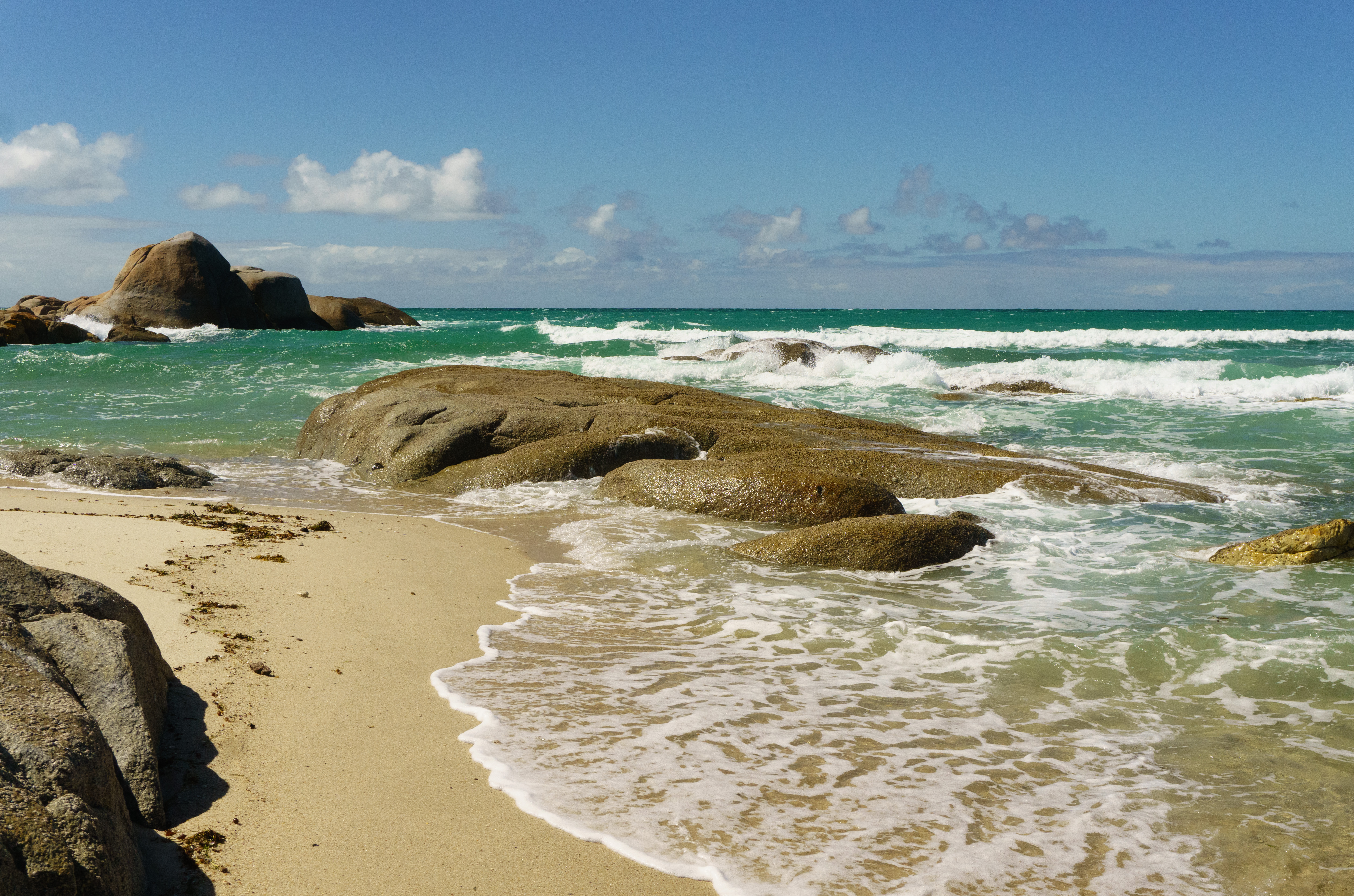 We left the beach with its inviting sand and water, and turned southeast toward Flinders Island, and soon were skirting another long and magnificent beach. We entered an archipelago of boulders and and tiny islands, waves pitching the kayaks up with the swell. The boats felt incredibly stable, only doing a subtle wiggle at the crest of each wave as it corrected itself for the descent.