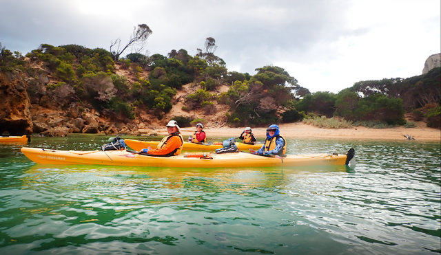 The first three days were sunny and hot, even on the water. I wore a tea shirt under my life jacket with liberal amounts of sun block down my arms. This paddle took two hours, and in generally calm water. We paddled past boulders, sand, and bushland, then around a point to see the length of Sawyers Beach. There were very few buildings to help our bearings. We certainly could not see the cabins, even when we were quite close to them.