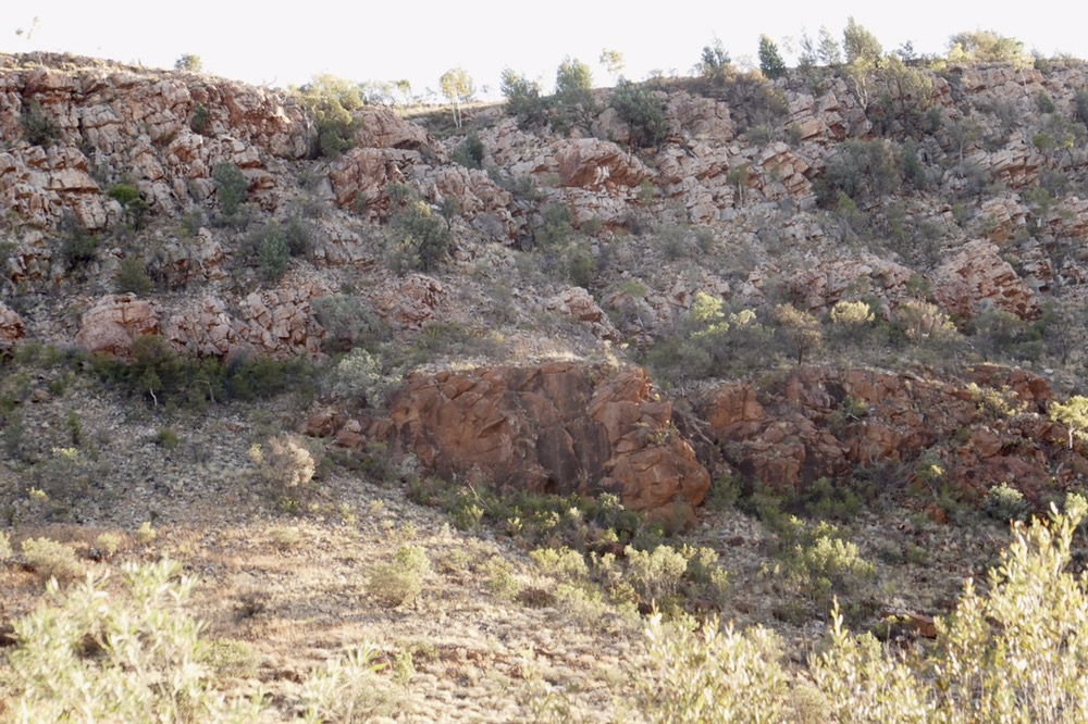 We drove eastwards, stopping then at Corroboree rock. There is a short walk about this formation. On on edge I could see how narrow it is, like half a coin sitting in the ground. Metamorphic sandstone, its sedimentary layers no longer horizontal but vertical. Each layer a layer of ancient sea floor. The history of central Australia goes back to not long after the formation of the earth itself. Great oceans formed and reformed nine times in all , but beginning two billion years ago. Mountains were eroded by ice, by great glaciers when Australia voyaged to the South Pole. Wind and water also eroded these ancient peaks. Their debris and stone, gravel and soil, filled the huge hollows between each mountain, all ocean washed and layered, over and over again producing ever thicker layers of sand then stone This became sandstone as the material above compressed that below. Then the very continent, twisted, contorted by the other great plates, created massive forces of stress and compression. New mountains formed, but twisted like the spines of fossilised dinosaurs. This what you see from planes as they fly overhead. In addition, these same forces spat minerals out of the mantle and from deep in the plate, forming intrusions of quartz, nickel and gold.