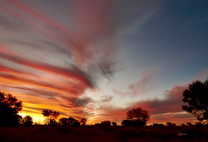 By now our track had joined the Halls Creek road, and we crossed Mission Creek at in more gentile style. The sun was setting apace now and the clouds formed huge folds of richly glowing colour. As we pulled up outside our house, we thanked Jabison profusely then walked across the sandy road to take photographs. We had seen Beryl, who is one of the nurses, standing on the road doing just that with her iPhone. We ignored the barking dogs and watched the sunset with its splendid desert colours light up the western sky. Wow!