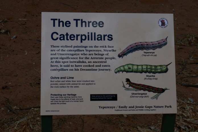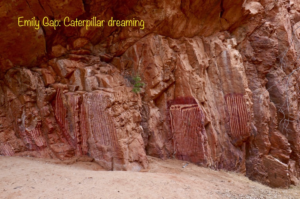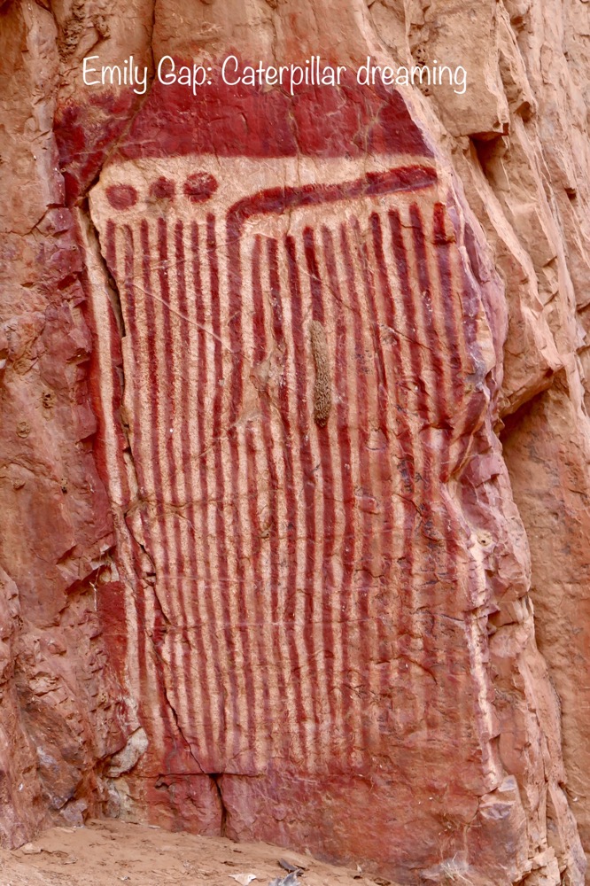 The paintings are part of the Caterpillar Dreaming, which is centred at the gap coming into Alice Springs, where two long ranges end, seeming to face each other. With some imagination, you can see a single eye at the end of each, the eye of a caterpillar perhaps. This is part of a song line, a path of Dreaming from one part of Australia to another, joined by natural features and Rock art, paintings like these and petroglyphs, carvings. On this pathway, the people can find and celebrate their country and most importantly, navigate confidently from place to place.