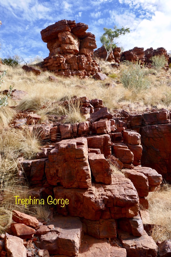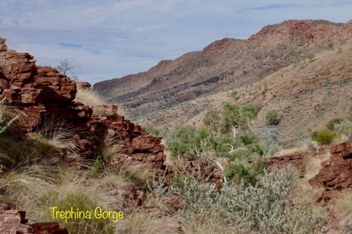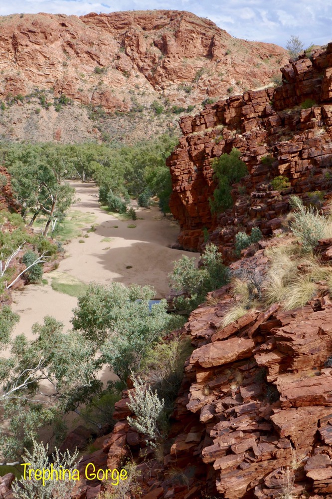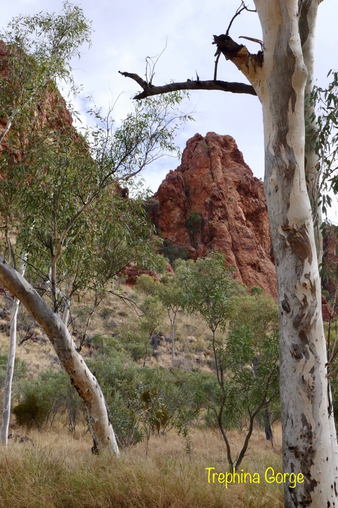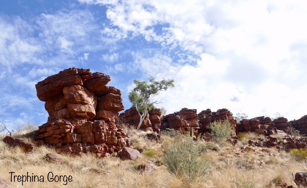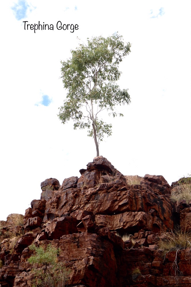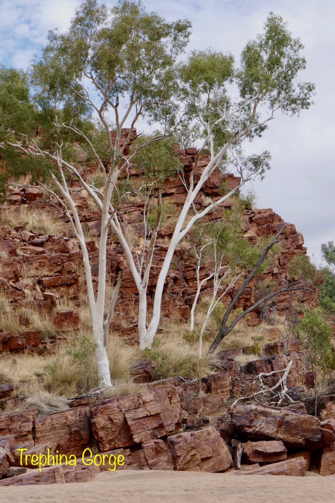 A feature of our trip are the many native birds. When parked on the road, suddenly a flock of iridescent green and yellow budgies darted in the air and landed en masses in a tree’s branches, a red breasted robin with its black jacket flew in to rest on a branch at afternoon tea near Trephina Gorge and Spinifex pigeons walking on river sand at Emily Gap.