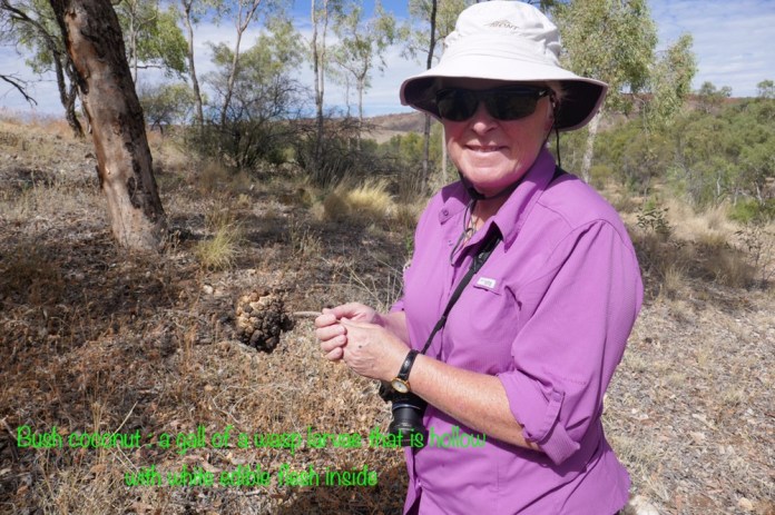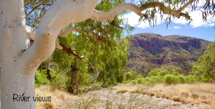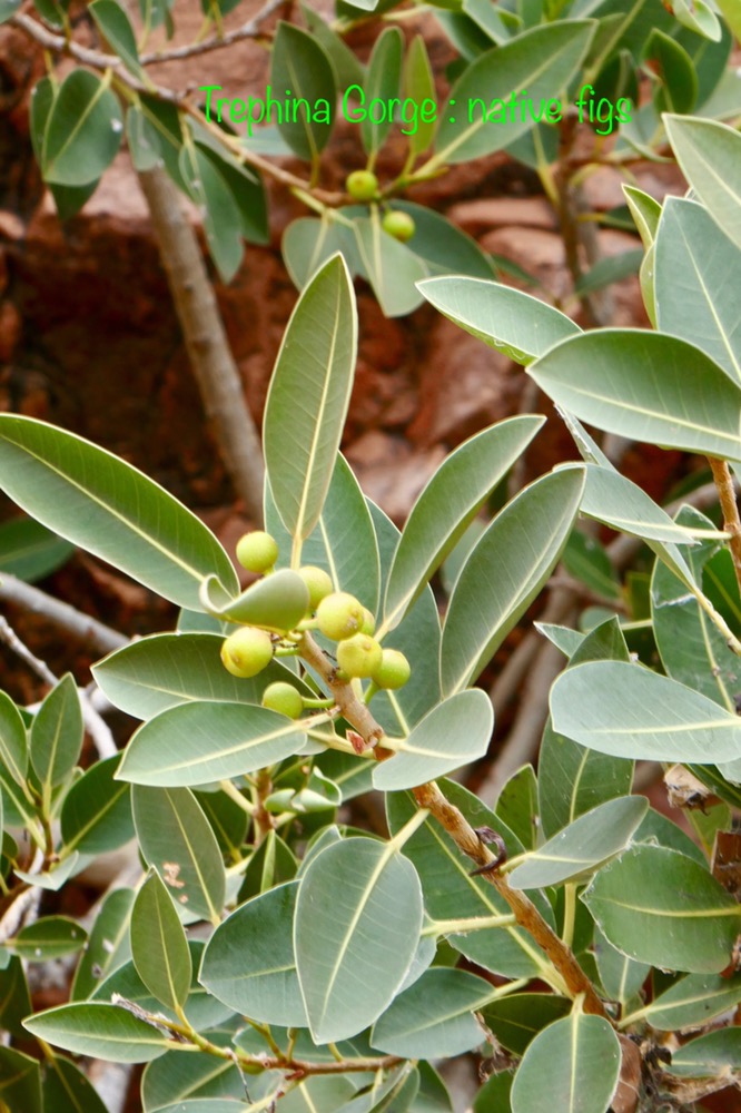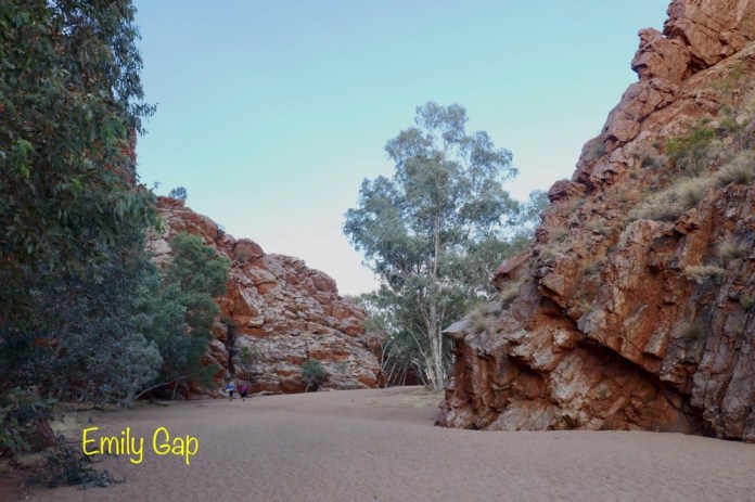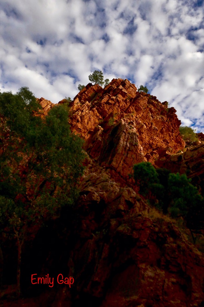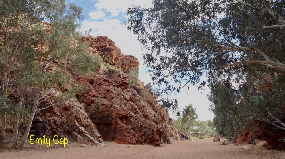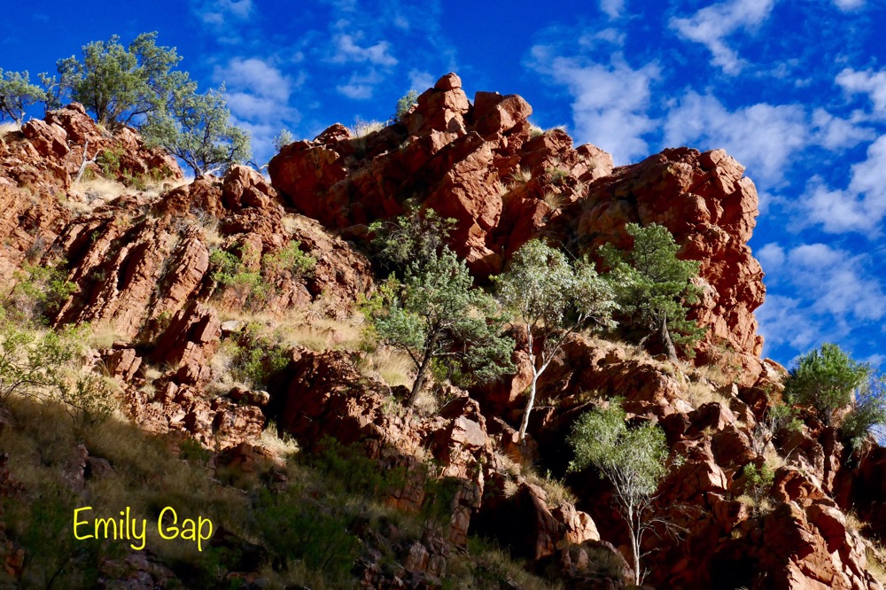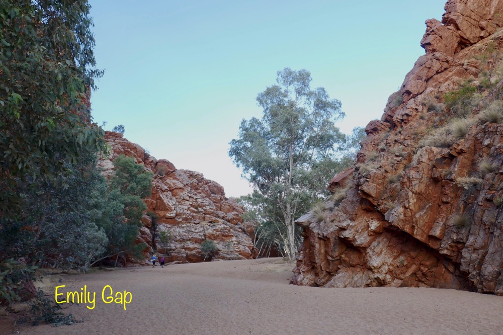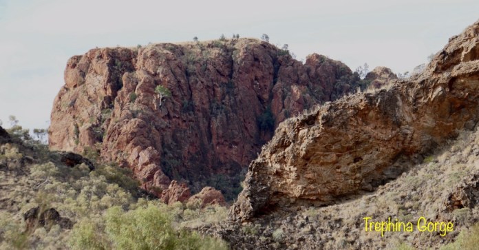 A feature of our trip are the many native birds. When parked on the road, suddenly a flock of iridescent green and yellow budgies darted in the air and landed en masses in a tree’s branches, a red breasted robin with its black jacket flew in to rest on a branch at afternoon tea near Trephina Gorge and Spinifex pigeons walking on river sand at Emily Gap.