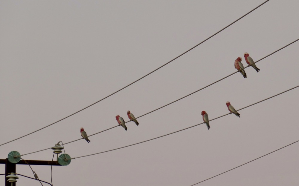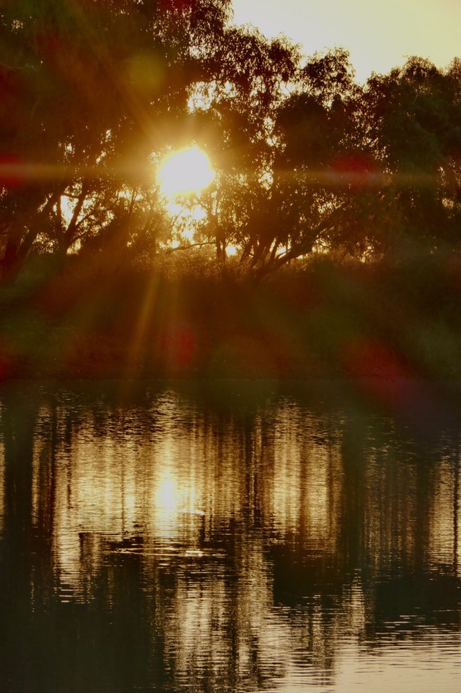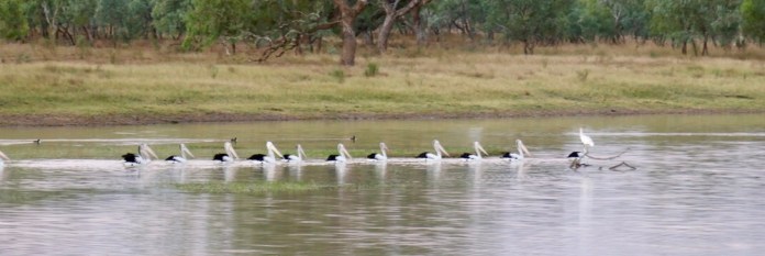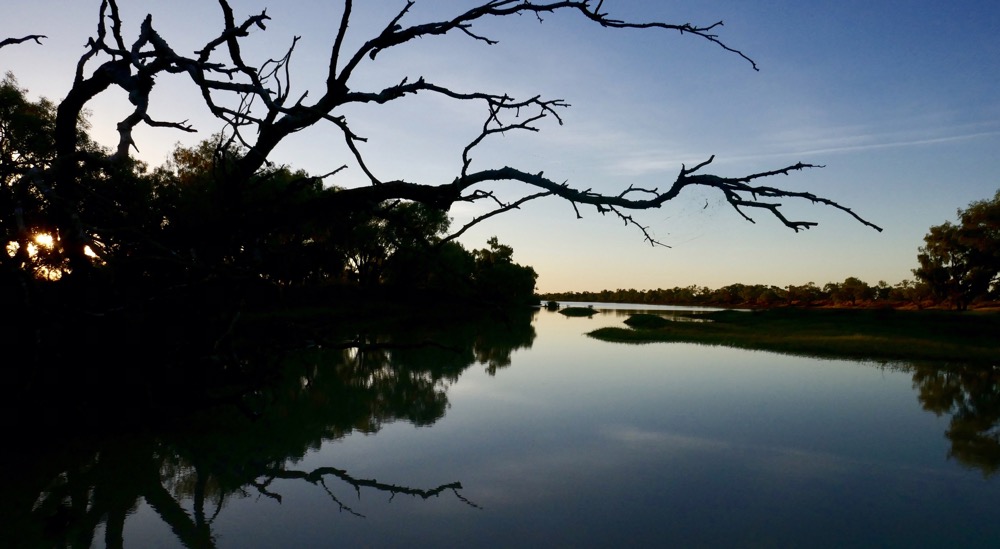 The Georgina can be up 200 meters or more across when in flood. The flood plains can be bigger than that and the effects on the land are visible from our RFDS plane as we circled over Lake Nash before landing. This temporary giant lake gives the station its name of Lake Nash. Even when the Georgina and the smaller creeks are flowing less vigorously, the roads are all cut and the community has no road access for months. Over late summer and then the dry, the Georgina exists as a series of huge waterholes, and these are wonderful places for a sunset stroll or a picnic. Pelicans, spoonbills, swans cruise while brolgas strut in the shallows. The brolgas are easily spooked as we drew near, stopped their loud singing and dancing on the bank, and launched into the air and flew out over the vast waterway. The pelicans were pretty relaxed about us, they were swimming in a long single file appearing as if to consult with a glossy, white spoonbill perched nonchalantly on a branch of a sunken tree. The scene reminded me of the opening lines of the children’s book “Madeline”.
