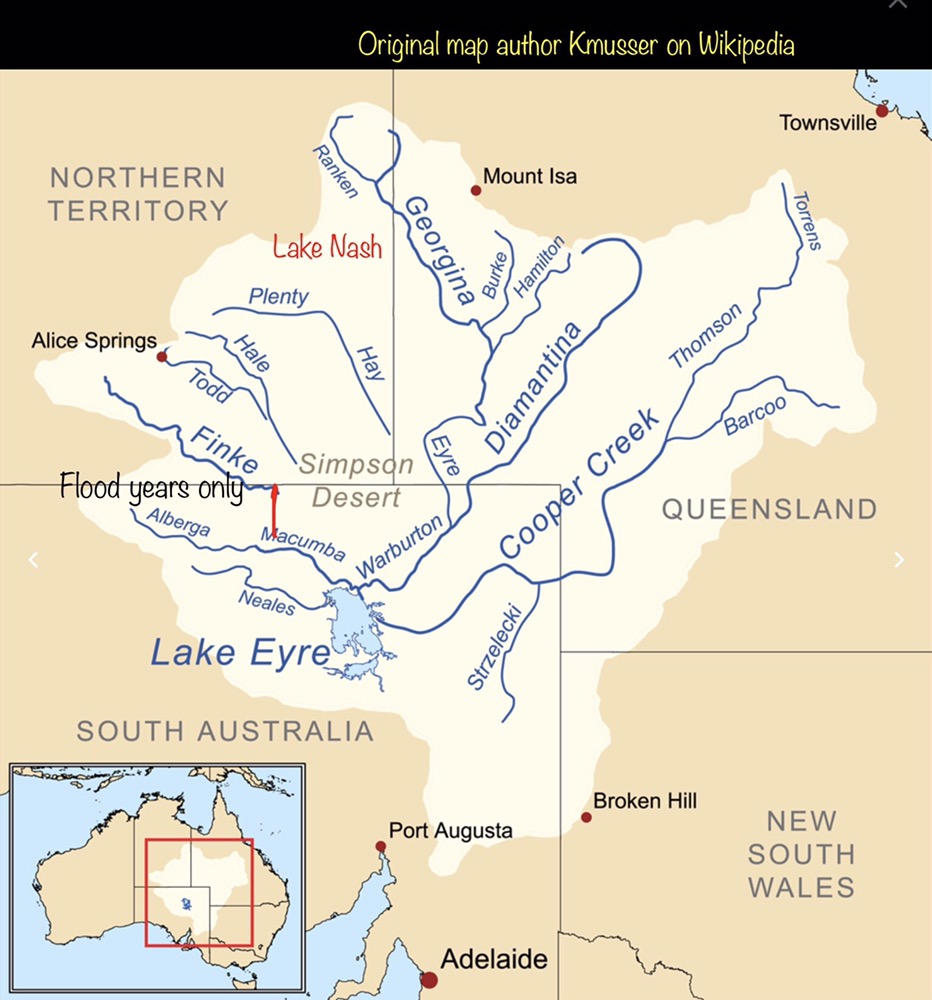 Lake Nash is a cattle station that covers 16,000 square kilometres, this is the size of the state of Victoria, and it is situated in the northern Barkly and abuts the border of the NT with Queensland. The nearest town is Mt Isa, the city of lead, about 200 kilometres away by gravel road. The station is bisected by the Georgina River. When the Georgina River flows, it joins the Diamantina River, and in those wet years, it helps fill Lake Eyre. The other rivers that contribute to the lake are the Warburton River and the infamous Cooper Creek. The Finke river usually peters out in the Simpson desert but when it is really going strong it connects with another river and ultimately ends up in, you guessed it, Lake Eyre.