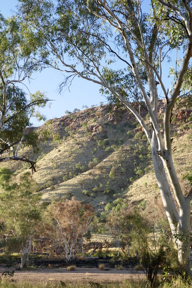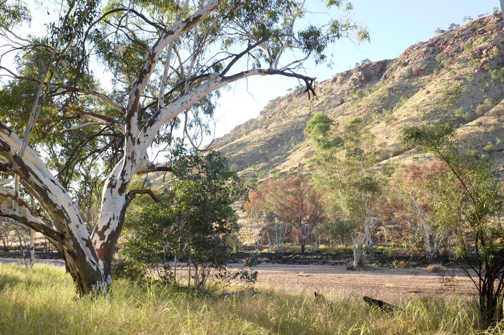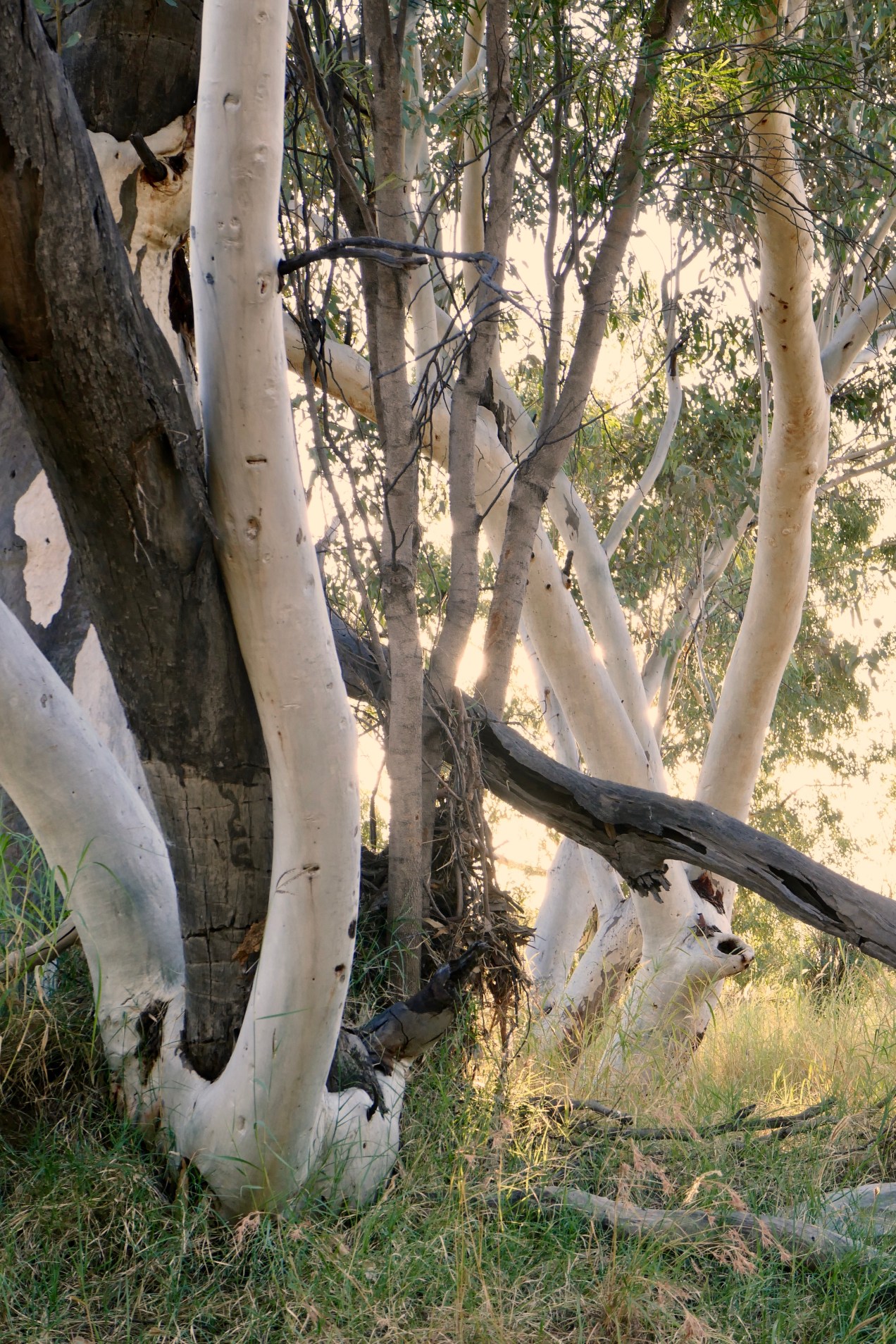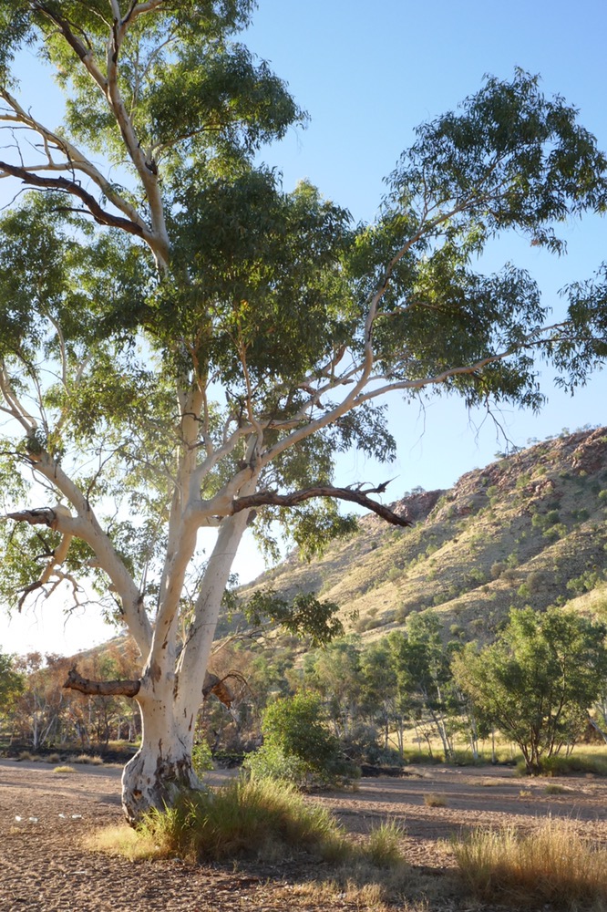 I went walking Tuesday night and then this morning, for the hour of sunset and sunrise, along the nearly dry Napperby Creek. It was about 30 meters wide when it was in flood earlier this year following the unusually high rainfall in January and February. It’s now mostly dry, sandy walking. There are a few lingering dark pools, mostly full of madly breeding mosquitos and insects. Yet sometimes they give wonderful reflections of the trees and grasses of the creek bed. The sandy floor of the creek has many undulations formed by the flow of water and eddies produced around islands, trees and shrubs. The ghost gums and river gums look especially beautiful at the extremes of the day, their multicoloured bark highlighted in patches by the oblique golden rays of the setting or rising sun. There are many birds enjoying the shade and water; zebra finches, ring necked parrots, galahs, cockatoos, budgerigars, crested pigeons, and even a wedge tail eagle was perched in a tree above me. It flew off, lumbering into the air with big lazy flaps of its immense wings; it must have been spooked by the sound of me trudging through the sand.