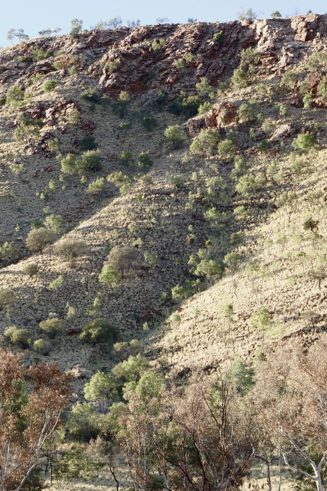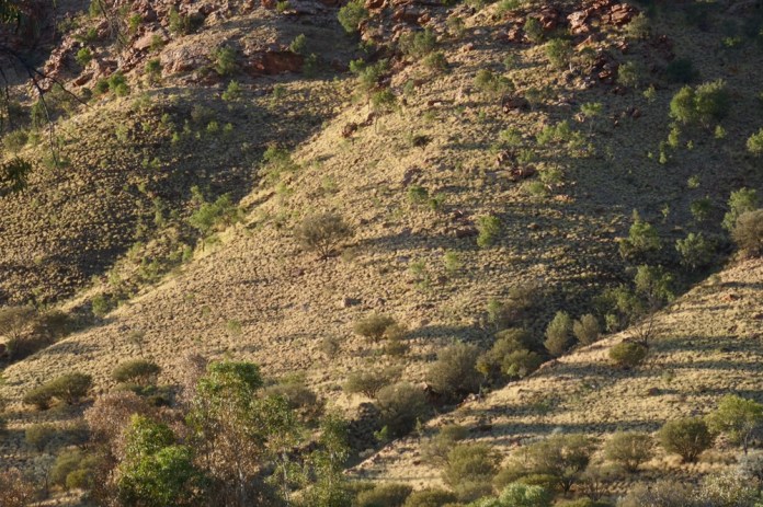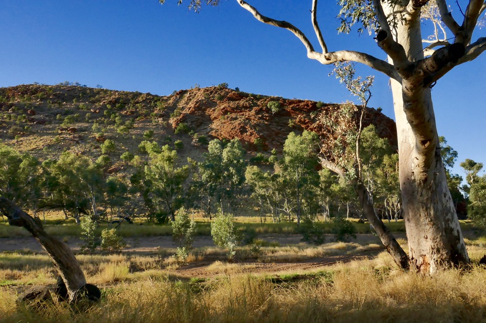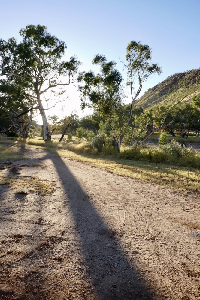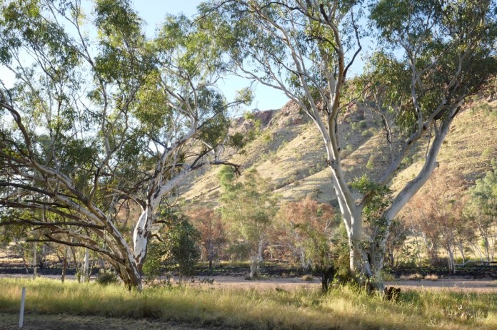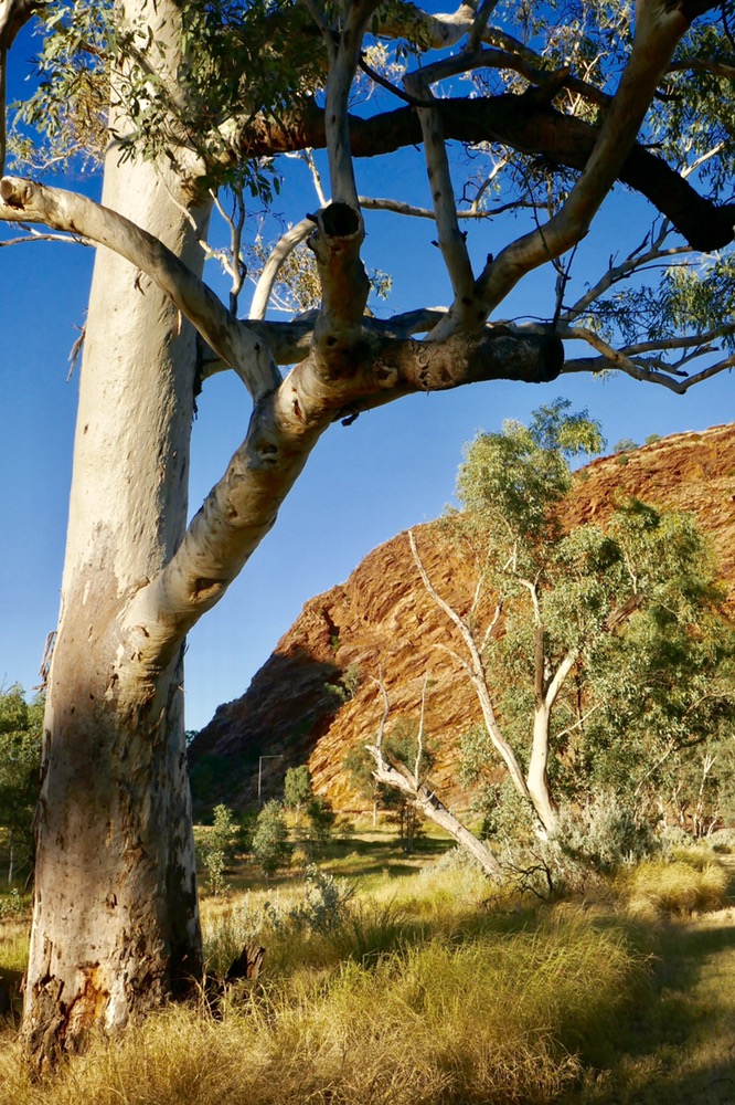 I went walking Tuesday night and then this morning, for the hour of sunset and sunrise, along the nearly dry Napperby Creek. It was about 30 meters wide when it was in flood earlier this year following the unusually high rainfall in January and February. It’s now mostly dry, sandy walking. There are a few lingering dark pools, mostly full of madly breeding mosquitos and insects. Yet sometimes they give wonderful reflections of the trees and grasses of the creek bed. The sandy floor of the creek has many undulations formed by the flow of water and eddies produced around islands, trees and shrubs. The ghost gums and river gums look especially beautiful at the extremes of the day, their multicoloured bark highlighted in patches by the oblique golden rays of the setting or rising sun. There are many birds enjoying the shade and water; zebra finches, ring necked parrots, galahs, cockatoos, budgerigars, crested pigeons, and even a wedge tail eagle was perched in a tree above me. It flew off, lumbering into the air with big lazy flaps of its immense wings; it must have been spooked by the sound of me trudging through the sand.