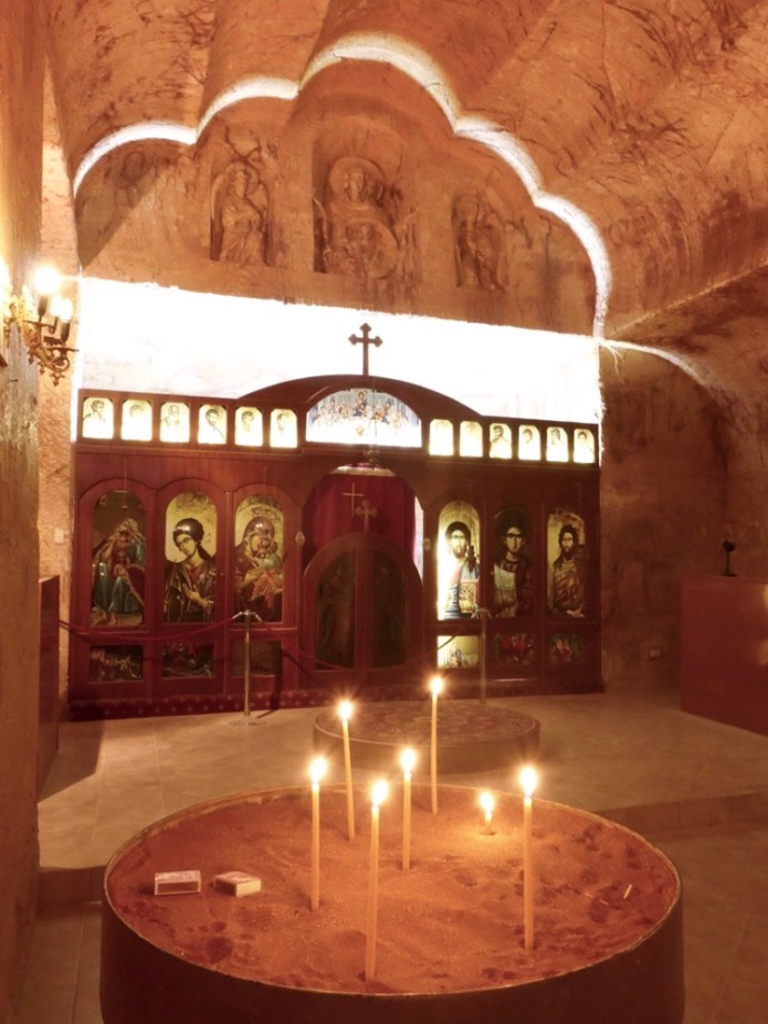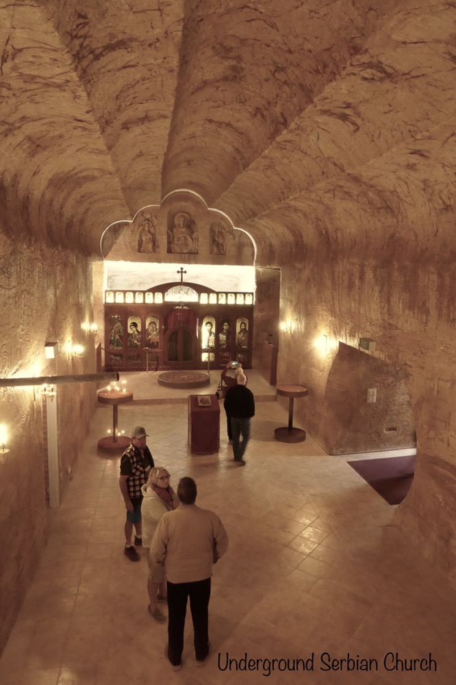 Our penultimate visit was to the Serbian Church. This is also a dugout as are most of the many churches here in Coober Pedy. It is a serene home of prayer and community, the parishioners are now to old to stand for the two hours of an orthodox service. On the walls are five sculptures by an early member of the church. They are religious. They are are of Christ, Saints and the man in saint of the Serbian church. He died soon after he completed them, still a young man and clearly a gifted sculptor.