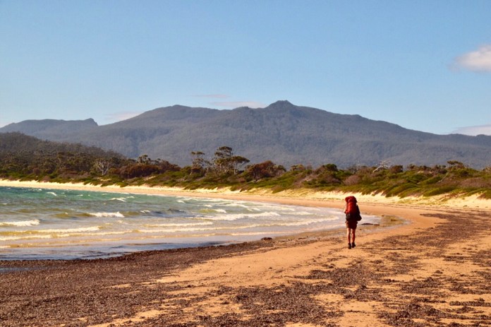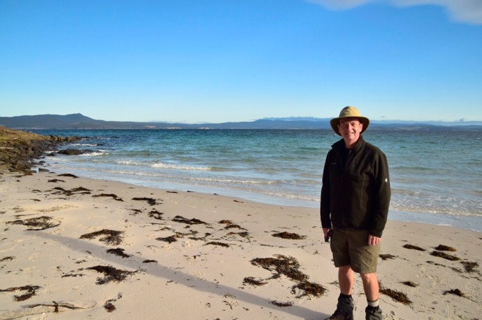 We moored at Chinamens bay, only a few meters from the beach. We all removed our boots, then holding them up, we splashed into the water, and waded quickly to Maria Island. Jai and Ella brought the packs ashore. After drying off wet feet and putting our boots back on, we walked a short distance up the beach, before crossing the isthmus to Ocean beach. We had lunch sitting in the sand overlooking this wonderful stretch of coastline. There were gentle waves of pristine sea water. The water here is especially clean because the continental shelf is only a few kilometres away and flushes this coastline all the time. It’s hard to calculate depth, as it’s so clear, a meter looks much the same as two or three meters.