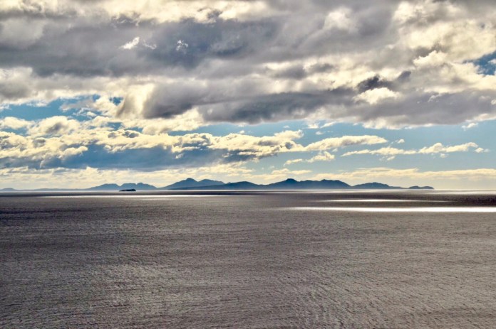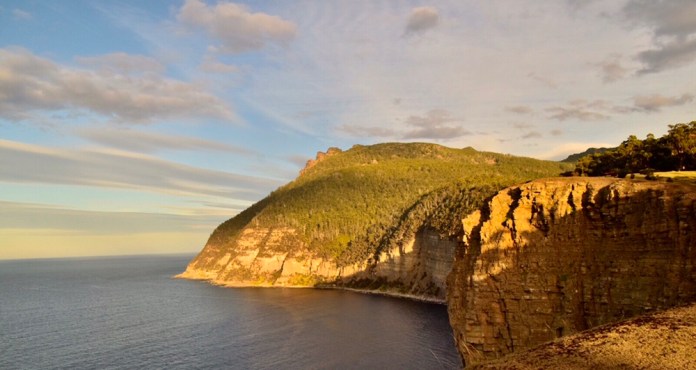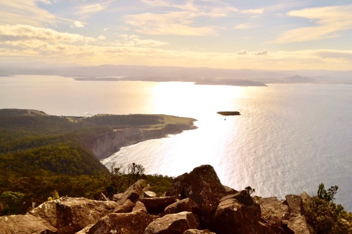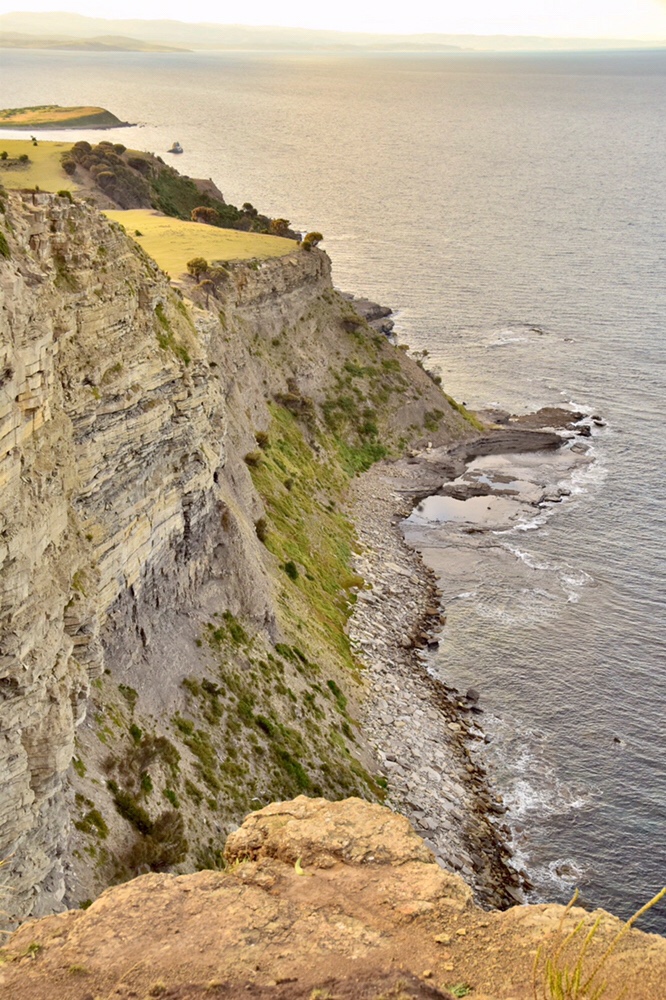 The track is about twenty meters from the cliff. Wombats munch contentedly. The surf can be heard crashing at the cliff base. We entered forest, then climbed up wards quite gently until coming to a scree field. The Hobart Walking club has scored a track which zig zags up this scree. They have put in some more solid footings but the track is not easy. It’s about four hundred meters and it’s steep. Then the track winds it way onto much bigger boulders. The plants typical of alpine tasmania such as mountain plum pine now take over from the banksias lower down. I got to within twenty meters of the top when I decided that was high enough for me. Too much vertical! Any way I took the opportunity to enjoy the view. High up on my eeyrie, I could see the light of the setting sun shimmering in a wide band on the water, the blue dusky shape of mainland hills and coast, the northern point of Maria Island and il de nord, a small island just off the tip of Maria Island. It was a very beautiful and peaceful view despite the prospect of a descent down scree, which didn’t turn out to be all that bad. It’s always quicker going down, which suited me. The light was softening as we walked back. We passed a few walkers going up, carrying torches, hopefully reliable ones.