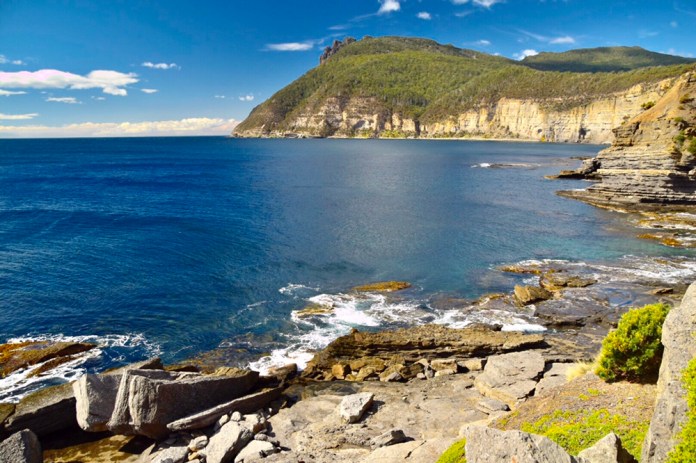 In the morning, I woke early and took off for an hour before breakfast to take a few photos around Darlington before breakfast. There is a campground below the house, many other restored buildings are there to visit including the coffee palace, which is now an interactive museum, laid out as a dining house. After breakfast, Laura, Philip, Campbell, Anna and I walked to the convict built reservoir. Mature gum trees, and mixed forest surrounds the track. The reservoir is still, clean collection of water. We continued to the fossil cliffs. These cliffs are filled with sea shell fossils, about 290 million years old. We explored this wonderful area before carrying on back for lunch. We had bubbly and fresh rolls before heading back across the water to Triabunna. It was a great deal rougher going back but no problems.