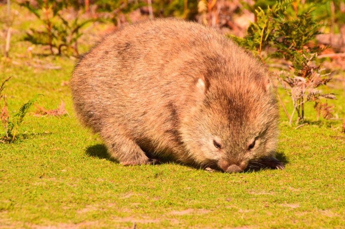 Today, we sat by the outhouse, inside it’s not all that interesting. While I was in the loo a tiger snake travelled near the group. Wombats were totally uninterested in the snake and us. The wombats here are a cross breed between the pale, almost blond original wombats and imports from the mainland. So some are blond, “ surfie” wombats while other resemble very fat quolls only with dark not white smudges in their fur. They mow the grass. All three thousand of them!