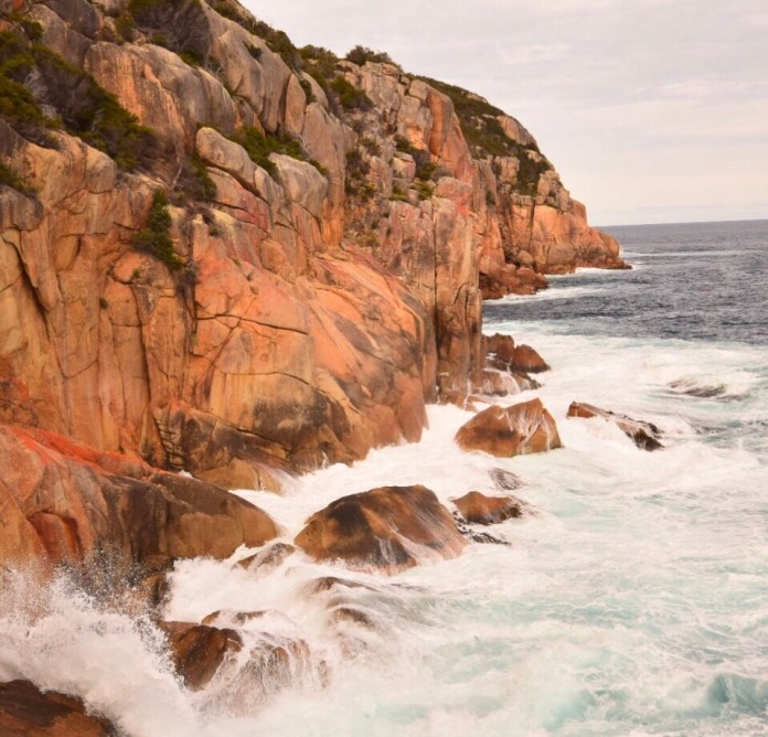 The afternoon options for walks were either Robys Farm or Haunted Bay. John and Moya went with Jai to the abandoned farm. I went with Ella and the others to Haunted Bay. It’s name comes from the eerie echoes of penguins as heard by the whalers who were once based there. The walk goes steadily upwards, through forests of banksia, gum trees, and bracken. Then there is a reasonably steep descent to the rocky shoreline of the bay. Here you can see the southern tip of Maria Island. Even in this gentle swell, the waves crashed over the rocks. It would very spectacular in a southern storm! The rock is orange and red, it’s the only area of basalt on Maria Island. It’s very reminiscent of Wilson’s Prom, and Freycinet. Most of the rest of the island is either well cropped lawn ( courtesy of the three thousand wombats), forest or mountains made up of dolerite. Dolerite is the tough scaffold of most of Tasmania, and Maria Island is no different.