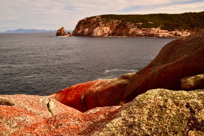 At Triabunna we helped the guides and driver, get our packs off the bus, then boarded a motor boat. The water was calm and the crossing uneventful but for seeing a pod of Common Dolphins. There would have been ten at least, their smooth dark grey bodies swimming in the wide blue water between us and the coast.