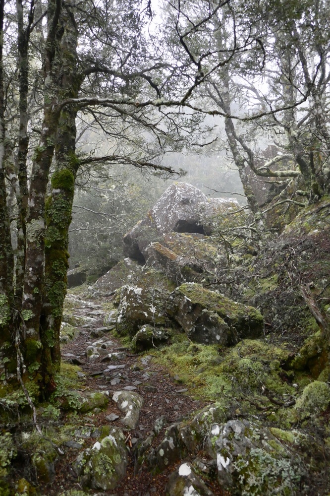 The plateau is covered by snow grass, cushion plants, rocket and herb fields. Ponds and streams woven within the landscape. A solitary pencil pine was silhouetted by the fog. The hut is well provisioned with bunk beds, blankets and cooking utensils. After lunch, we walked the short distance to the lake. It seemed so vast, it’s opposite bank hidden by the prevailing cloud.
