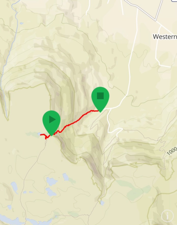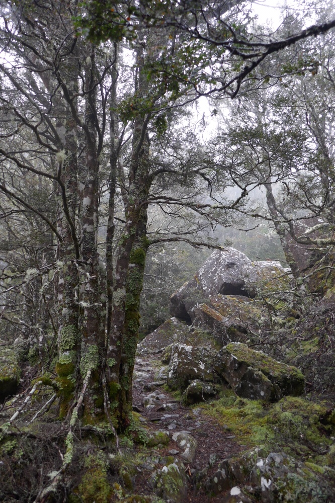 The track winds up the slope, the steps on the rocky track needed care but did not present too severe a technical challenge. Then after crossing a rocky creek bed, water chugging beneath us as we clambered over them, the route became more difficult. This was only a short interlude before arriving at the cairn marking the culmination of the track.