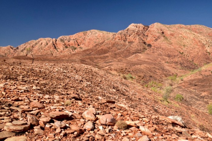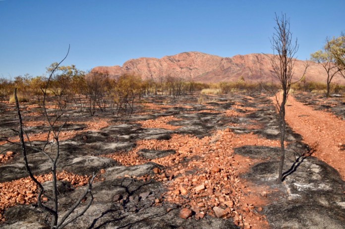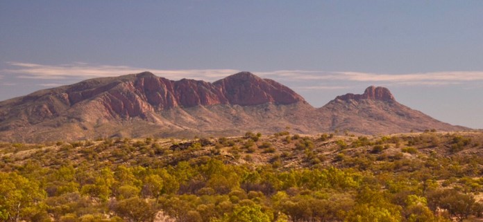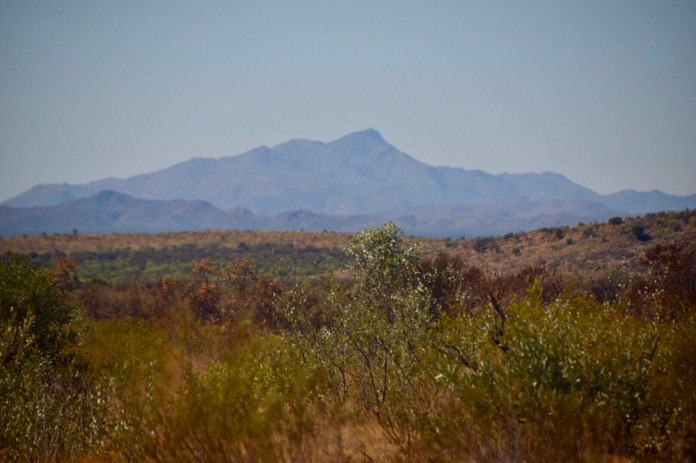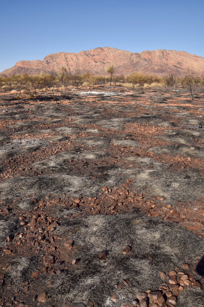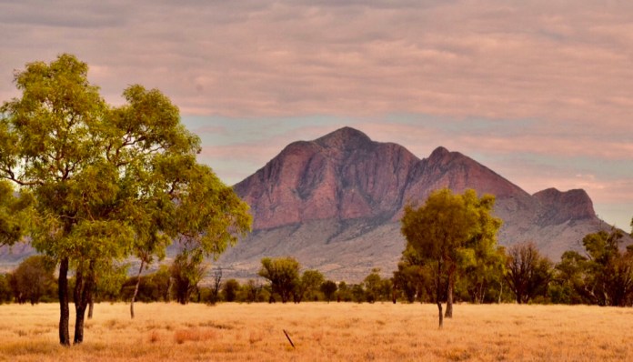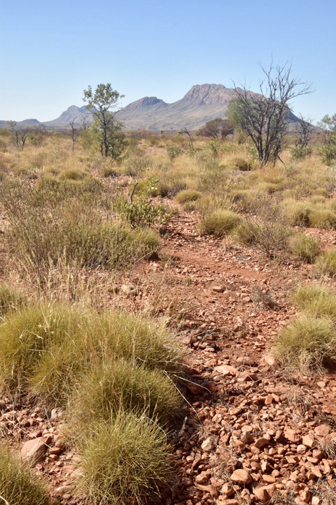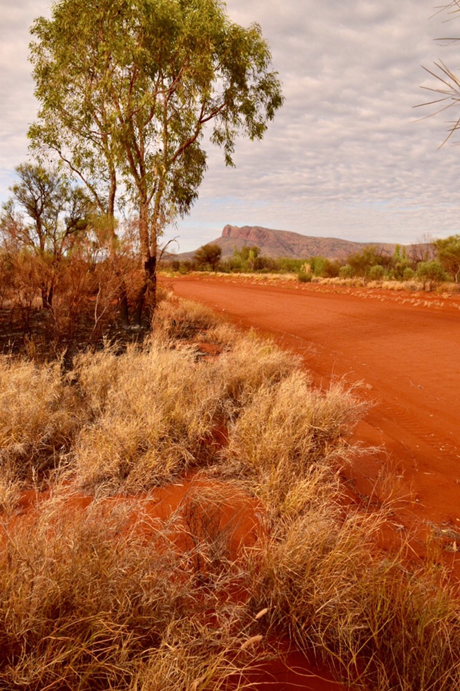 As I run south, I see the vast span of ranges start to glow from the crests down to their flanks, a coating of morning light. What could a light beam see as it passes over this sparsely treed plain? It would see the dilapidated houses of Papunya, some blue, some green, rusty cars perched on blocks, dusty bush tracks circling the town then radiating like spokes for hundreds of kilometres to Kintore or Glen Helen and if it paused right above the community, there are roads with deep craters in the bitumen.