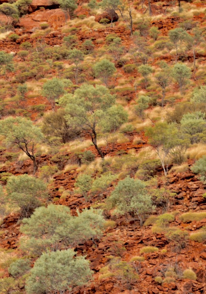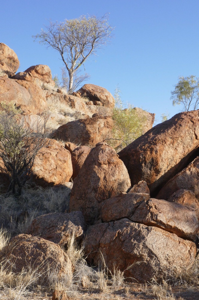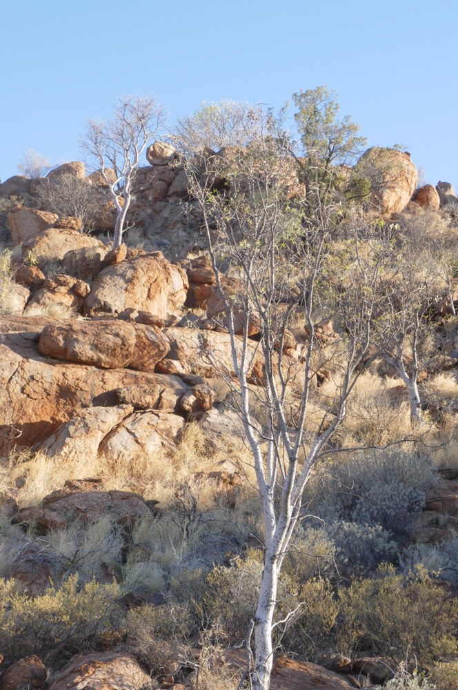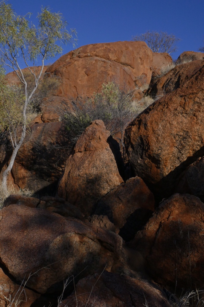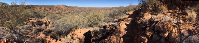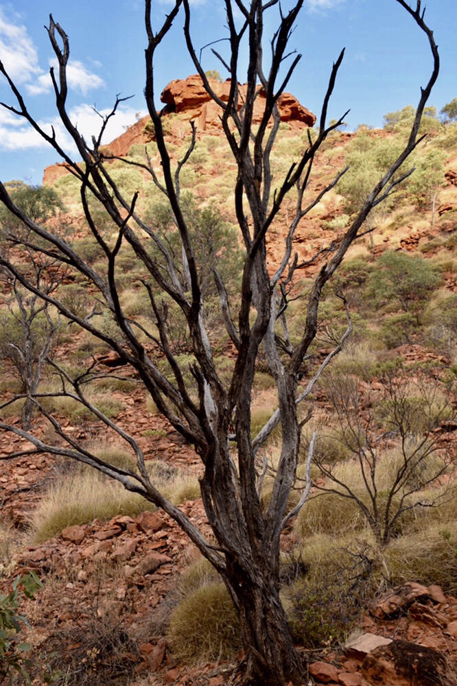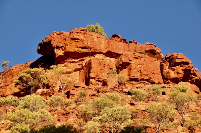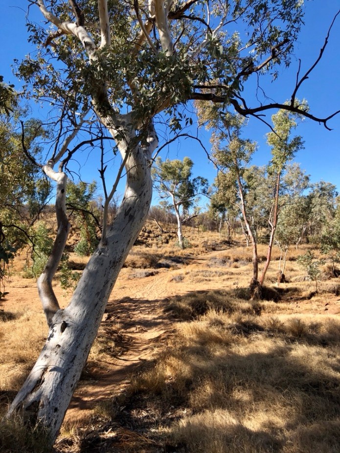 Wrigley Gorge is part of the extensive track network centred at Telegraph station. There are mountain bike tracks, walking tracks and some combined tracks including the one to Wrigleys Gorge. The wind was cool and pleasant, as we all set off. It was a mass of people at the start but the crowd soon separated out and for most of the track I was by myself with merely the susurrations of my fellow walkers ahead and behind. The land is arid and twists and turns along dry river beds, up and over rocky cliffs and finally arrives at Wrigleys Gorge. River gums nestle in a narrow valley. Most of the walkers elected to take a shuttle bus back but I had enjoyed the walk too much to do it just the once.
