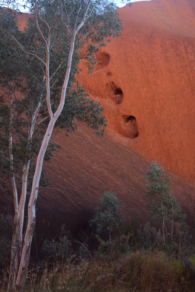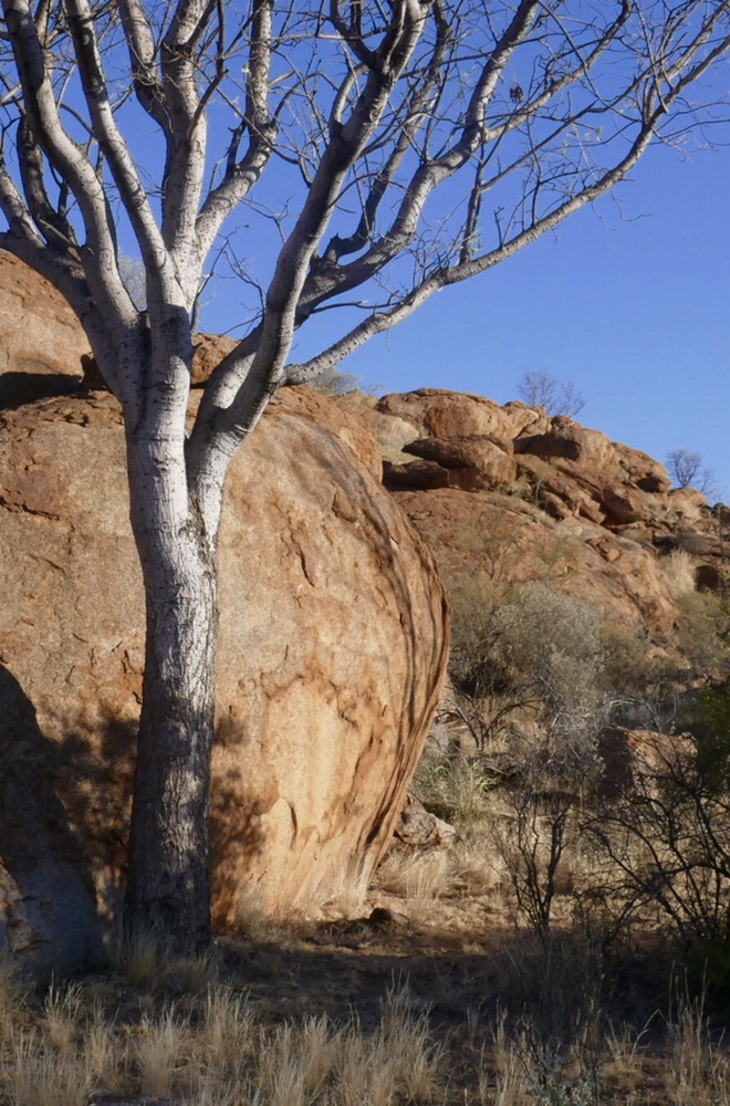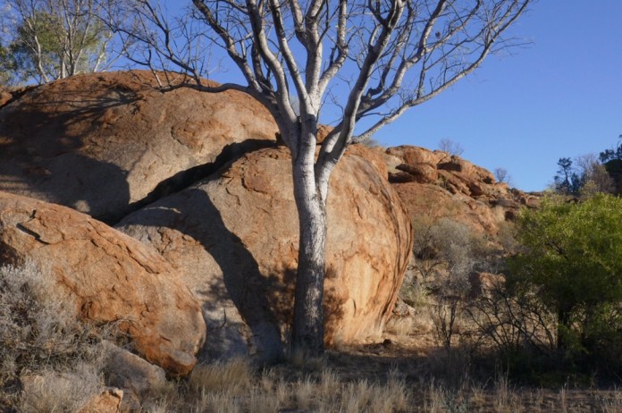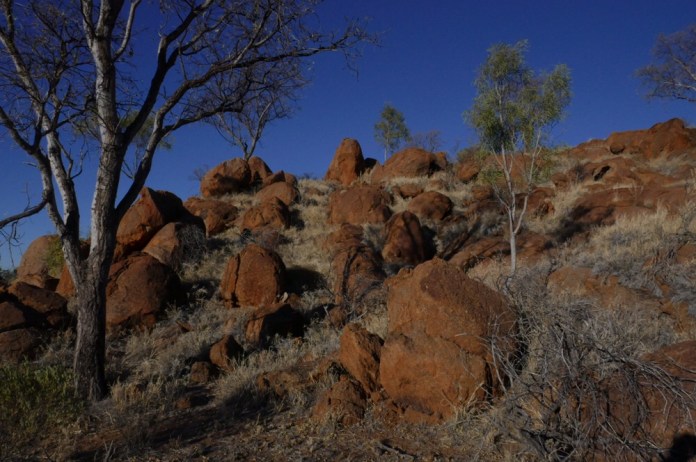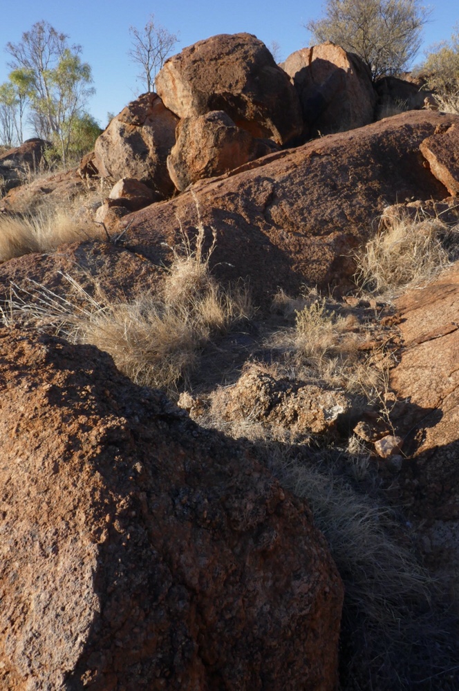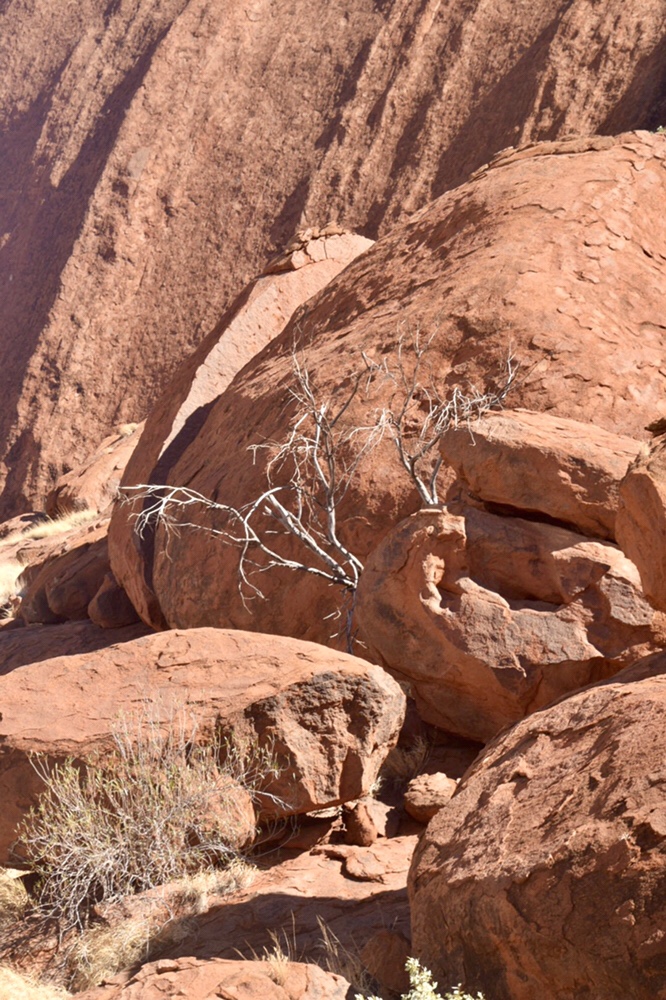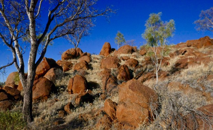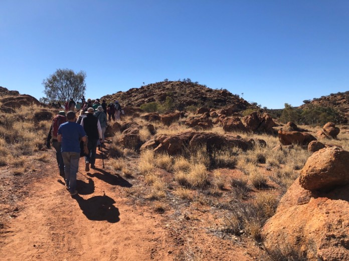 Wrigley Gorge is part of the extensive track network centred at Telegraph station. There are mountain bike tracks, walking tracks and some combined tracks including the one to Wrigleys Gorge. The wind was cool and pleasant, as we all set off. It was a mass of people at the start but the crowd soon separated out and for most of the track I was by myself with merely the susurrations of my fellow walkers ahead and behind. The land is arid and twists and turns along dry river beds, up and over rocky cliffs and finally arrives at Wrigleys Gorge. River gums nestle in a narrow valley. Most of the walkers elected to take a shuttle bus back but I had enjoyed the walk too much to do it just the once.