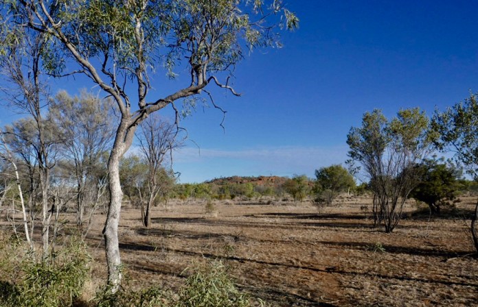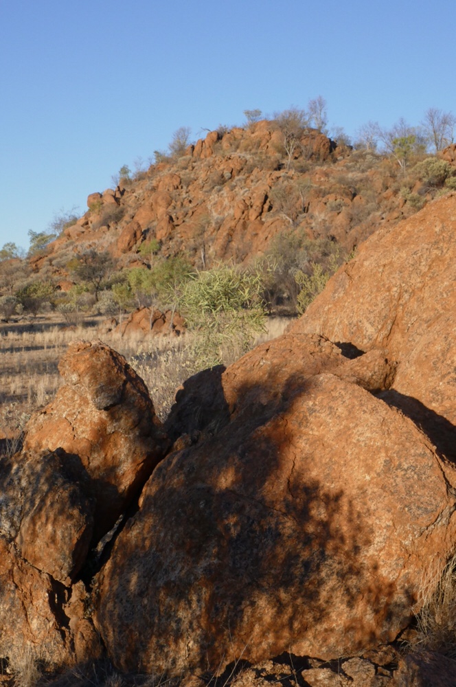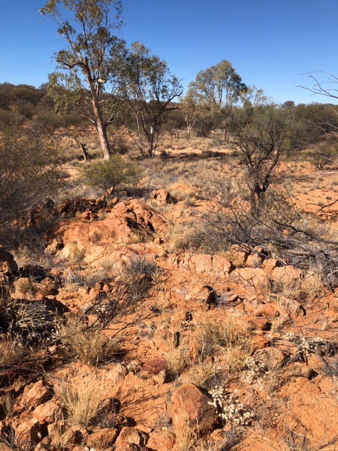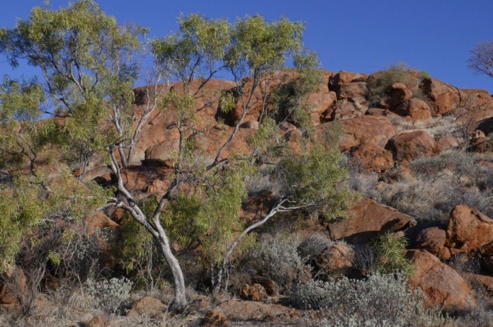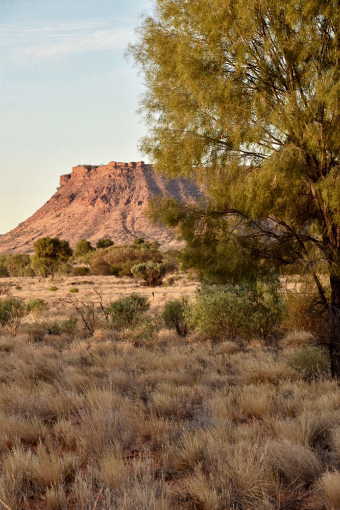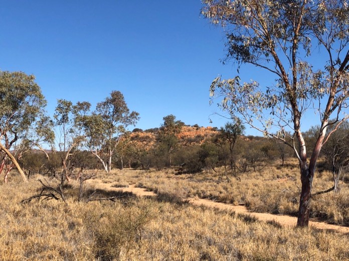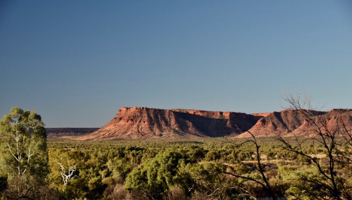 There are some fine views from the Ernest Giles track. Desert oaks, acacias, dry river beds, hills and always that crisp blue sky silhouetting the ridge lines spotted with a few trees. The rich colours, the orange, reds and splashes of white rock with a foreground of forest.