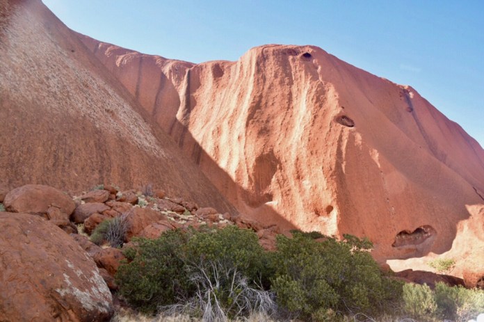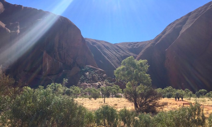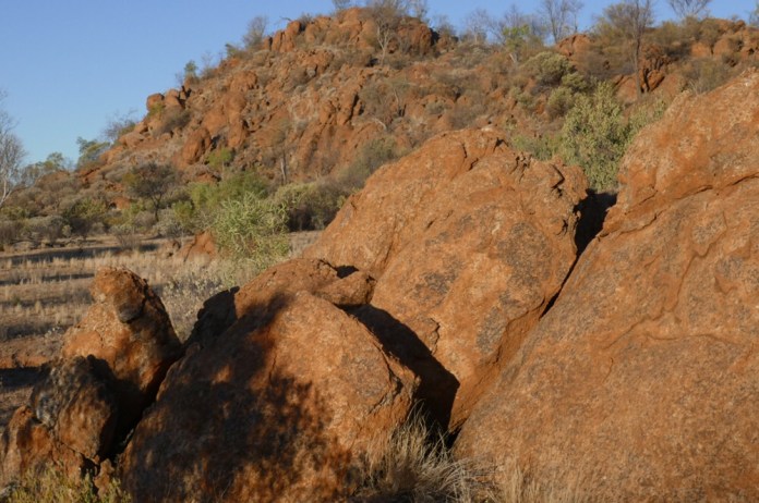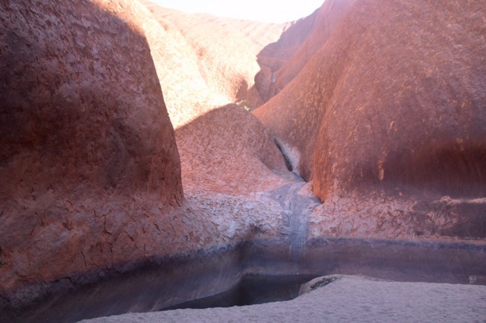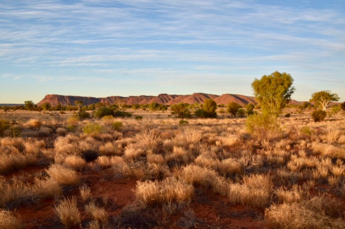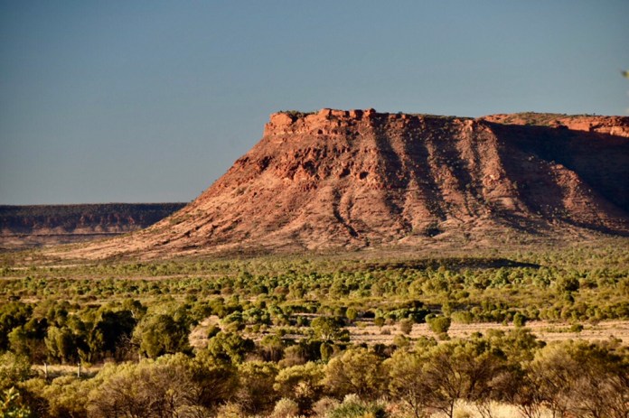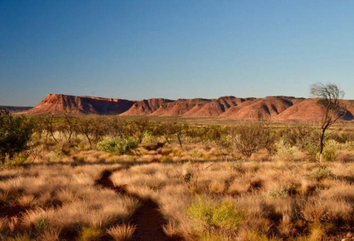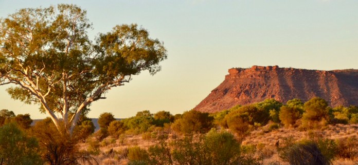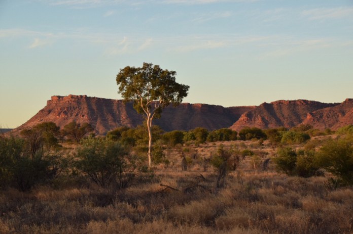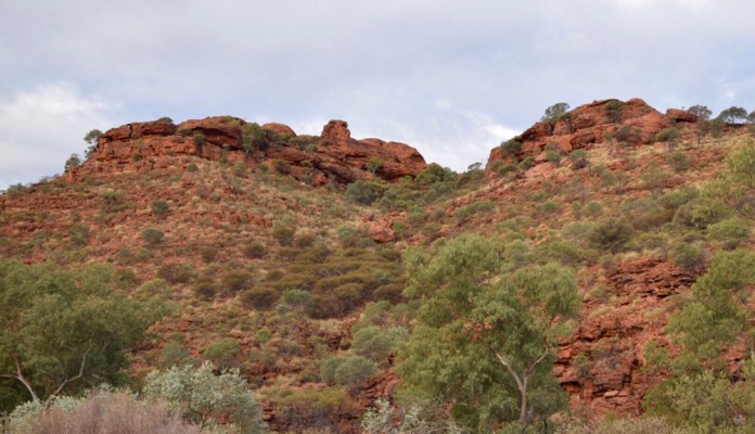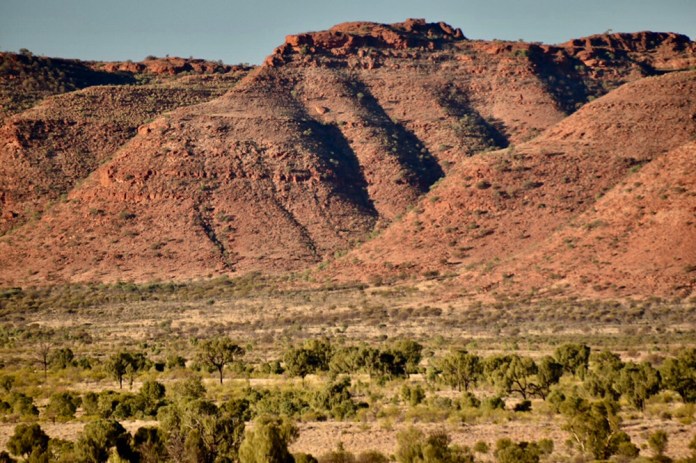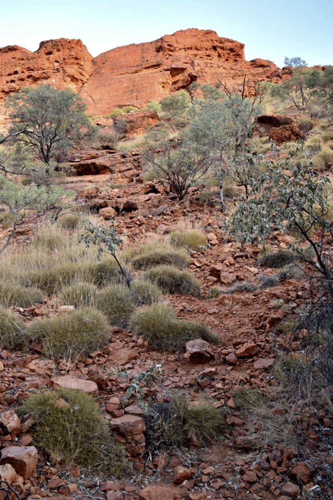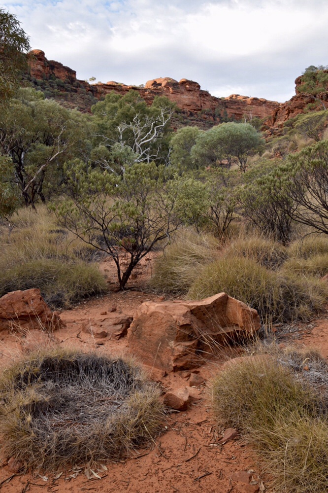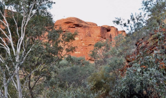 After work, there was not much time before dusk for any long walks but there was the opportunity to do some pleasant shorter walks. I walked the Rim track which goes for 45 minutes, around the resort. You can hardly see the resort buildings. The track offers many fine views of the Carmichael range, all the more vivid and colourful in the light of the setting sun, it’s rising orange glow abruptly above the plain of sand, buffer, spinifex and desert oaks. I walked a track near the clinic along a sandy access road. And also drove to Kings Canyon itself and selected the short Kings Creek walk. Gum trees, river gums, and birds are the highlights, the wagtails, the parrots sparkling colour through the trees in their noisy flights. It’s a primeval experience, the rocks, gullies and cliff tops ancient beyond human time.