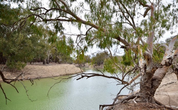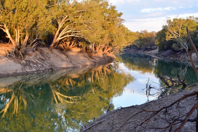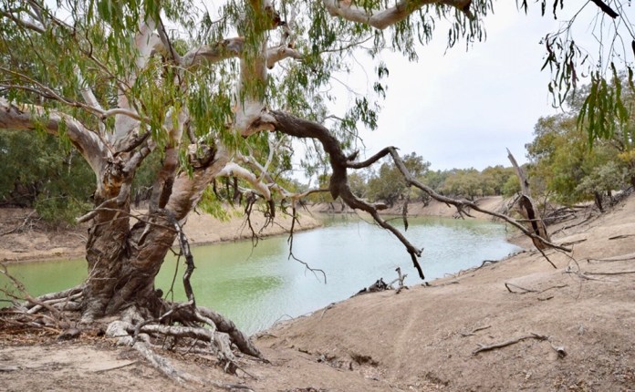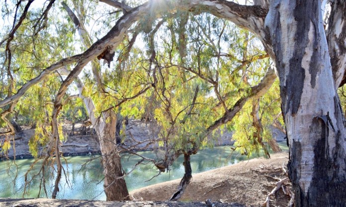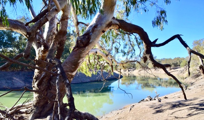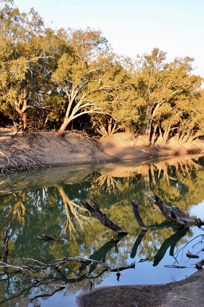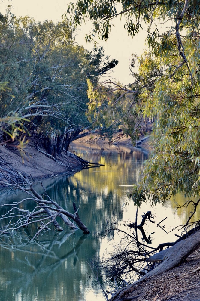 Each morning of our three day stay I would walk along the Darling River all the way up to the bush camping area. I saw the river in different moods; the warm orange light and stillness of later afternoon, the fresh light glittering trees of the opposite bank reflected in the river of morning and the windy swaying trees and rippling water of mi day. I passed an old shearing shed of coolabah and corrugated iron walls and roofing. There were the shearers quarters, small green painted cottages with bedside made up, television and kitchen facilities. There are not many sheep wandering the pastures. If pastures conjures up an image of verdure, of waves of lush green grass with sheep and lambs cavorting in the sunshine, forget it. There is no grass, none for nearly twelve months. All feeding is from hand delivered hay, lying in blocks of straw behind metal fences. There is enough water for the sheep to drink but not nearly enough to irrigate or use sprinklers to make this land truly productive again. Goats trot about, oblivious to the harsh landscape. A decent size goat earns a farmer like Gary, $60 a head now. Gary has moved most of his stock to another property and like most of the farmers in western NSW and QLD, he is loath to sell his sheep because when the drought finally ends from where would he buy more sheep? In most droughts large areas of the eastern seaboard are spared, well enough to enable restocking but not this time as the dry extends not only in time but in geographic extent. He is pretty stoical about the whole thing but there is a sense of his frustration with large businesses who monopolise water to a scandalous level.