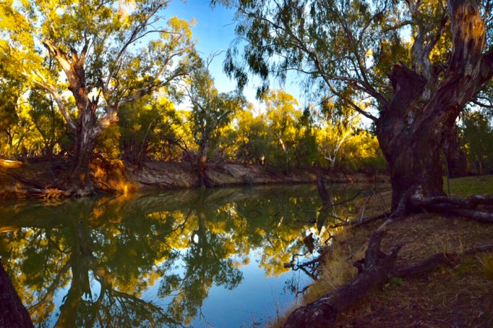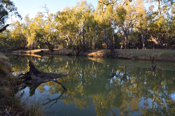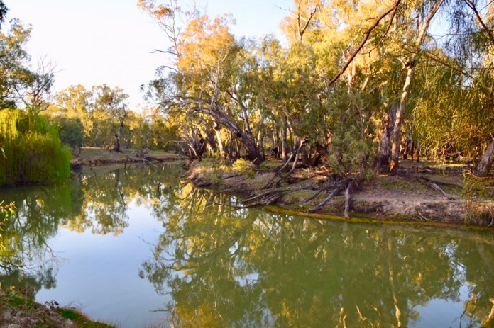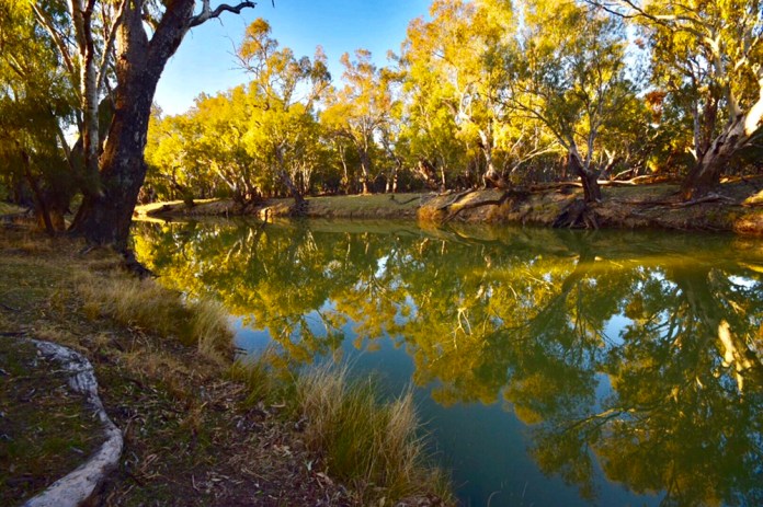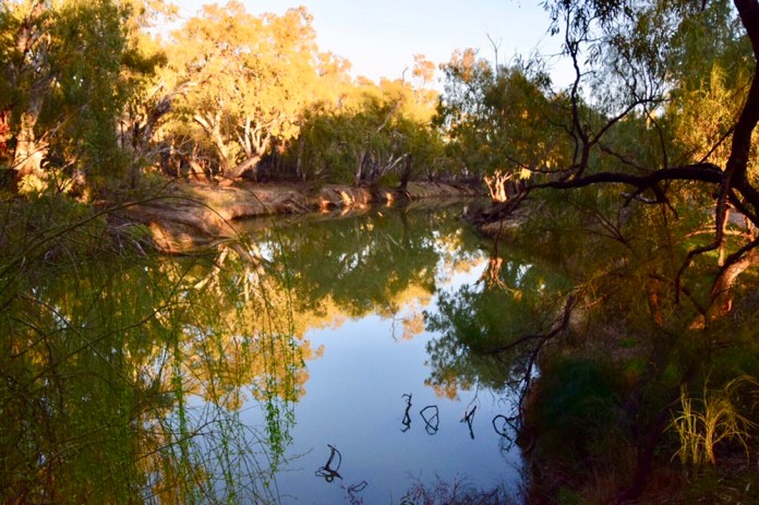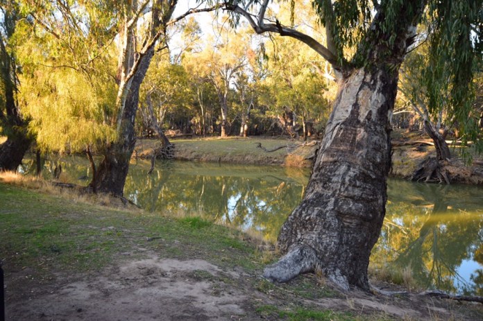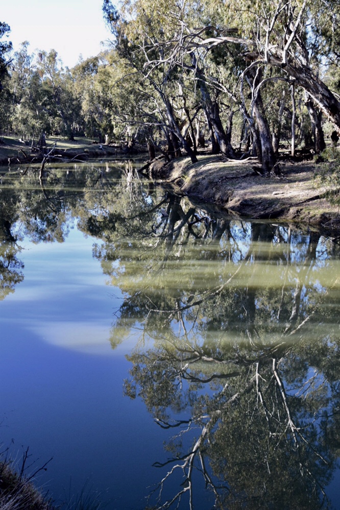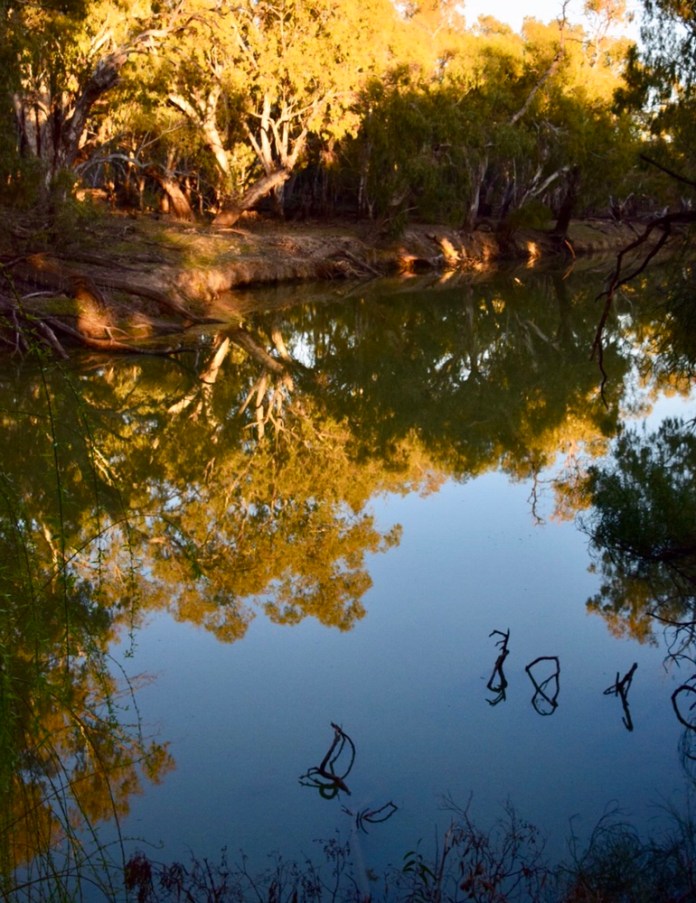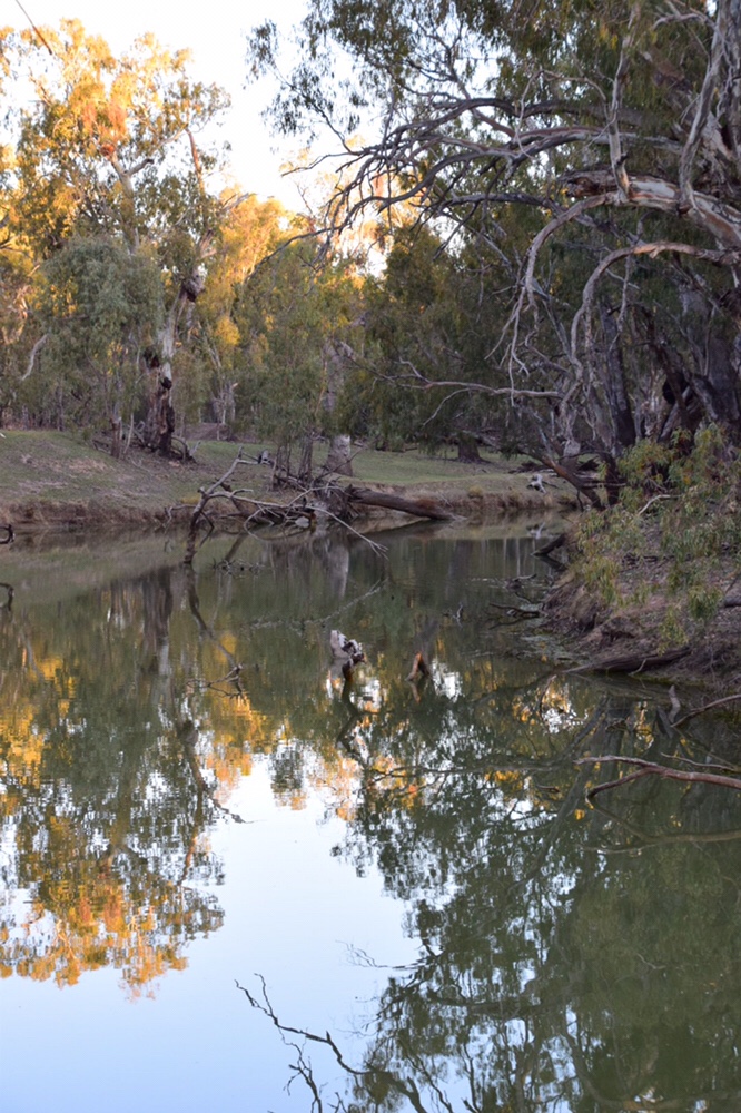 We drove from Rose Isle to Billabourie. This is a station on the Lachlan river and it’s a mixed farm. It’s about forty kilometres from Hillston. Josh is a young miner from Cobar who arrived at Rose Isle with his wife and young son. He told us about this farm stay. It’s a pretty spot by the river. We parked the camper trailer adjacent to and overlooking the river. I played my guitar in the afternoon while Jennifer read. No luck with a telescope as the trees, the river gums and coolabahs, blocked unhindered access to the sky. A very relaxing afternoon.