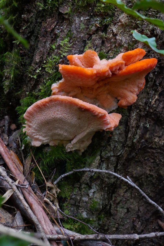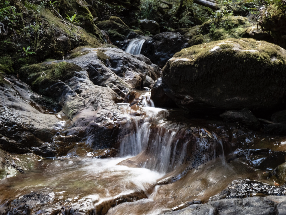It was a short walk along a rocky beach, hence the name Granite Bay. The surf covered the sandy part of the shore near the water’s edge. We had to clamber like lobsters with our walking sticks in place of pincers, balancing on the slippery rocks. At the end of the beach is a waterfall which was not all that impressive owing to minimal rain. I clambered up the rock face with some help and then it was barely a hop and a step to the campsite. This is perhaps my favourite camping area of the entire walk, with abundant tea trees, plum trees, and celery top pines. Later on, Alan and I visited a small waterfall upstream of the other waterfall that plunges onto the beach.