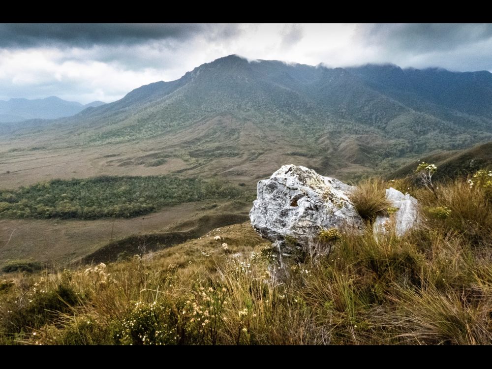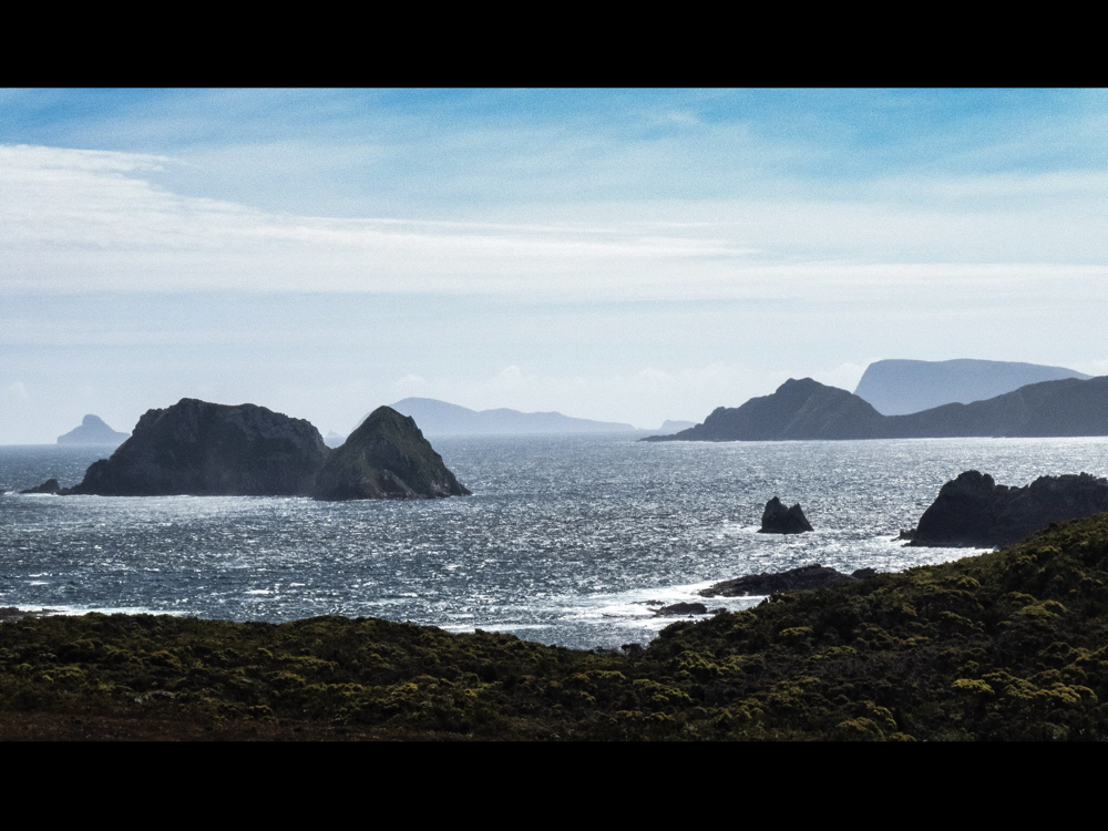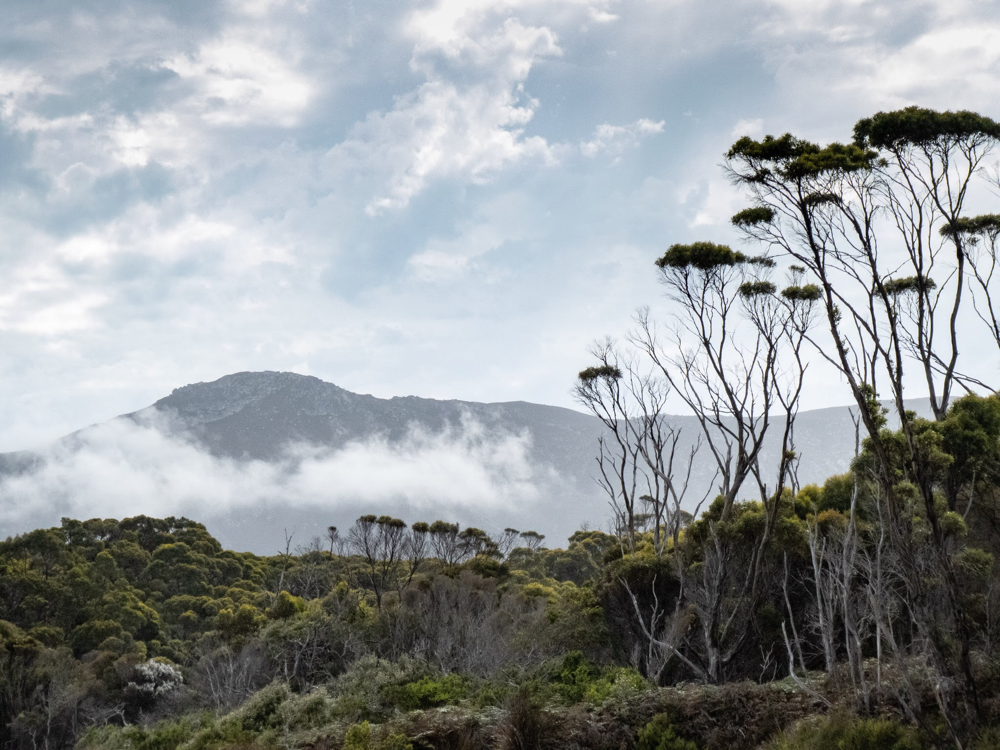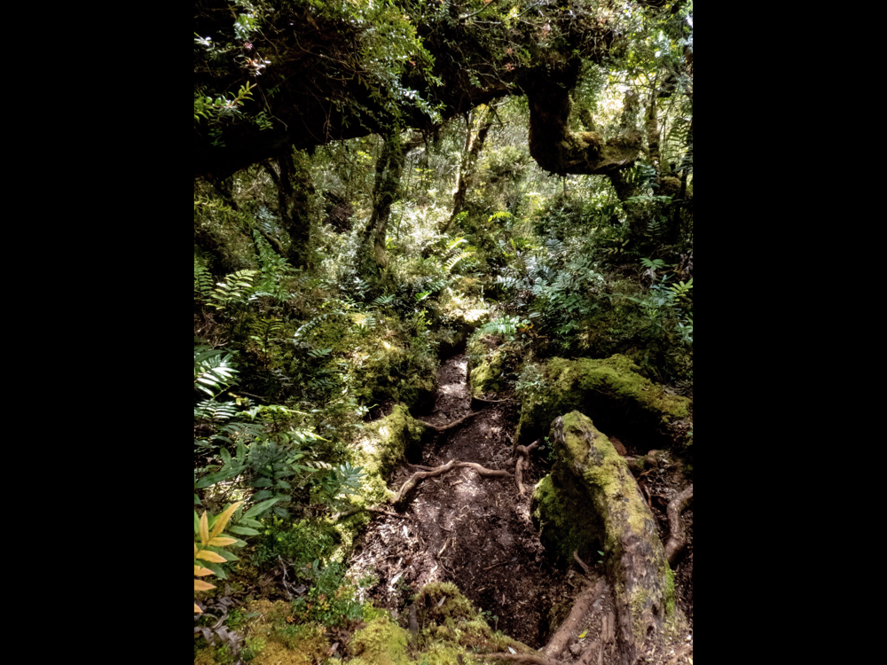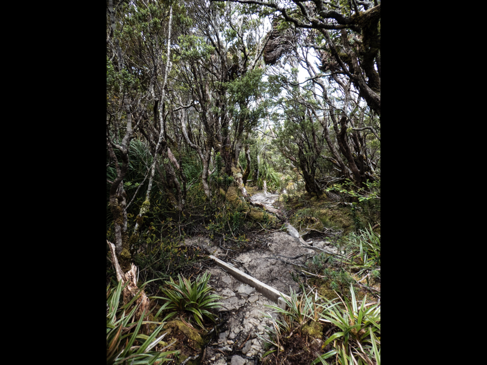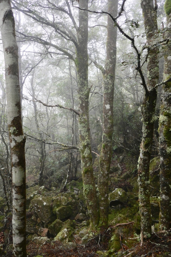 The track winds up steeply through forest, the track alternately rocky and muddy in stages. It’s a grunt, a slog rather than technical mountaineering. We left the tree line, entering the sole preserve of shrubs and grasses. As I climbed these were increasingly lower and more stunted. Around me the wind shrieked louder and louder. While behind me, the clouds looked increasingly threatening and dark, obscuring distant views of the coast, and the nearby mountains and valleys of yesterday’s hike. There were the tell-tale signs of rain, the grey thin streaks of water bending in the wind which was steadily rising more and more as we ascended. Rarely, a portion of the skies would clear and sunlight stream in to illuminate a tiny portion of the landscape. To the south was the Southern Ocean with its surf entering Cox Bight; to the west the majestic Spica hills, and far to the south there were the many islands of the Matsuyker group. I did not know that Sue and Tony, my friends, were sitting at Louisa Bay and thinking of me as I climbed into the teeth of a gale. Then mists, wind and cloud jostled the mountains and I could see nothing more of what was now far below me.