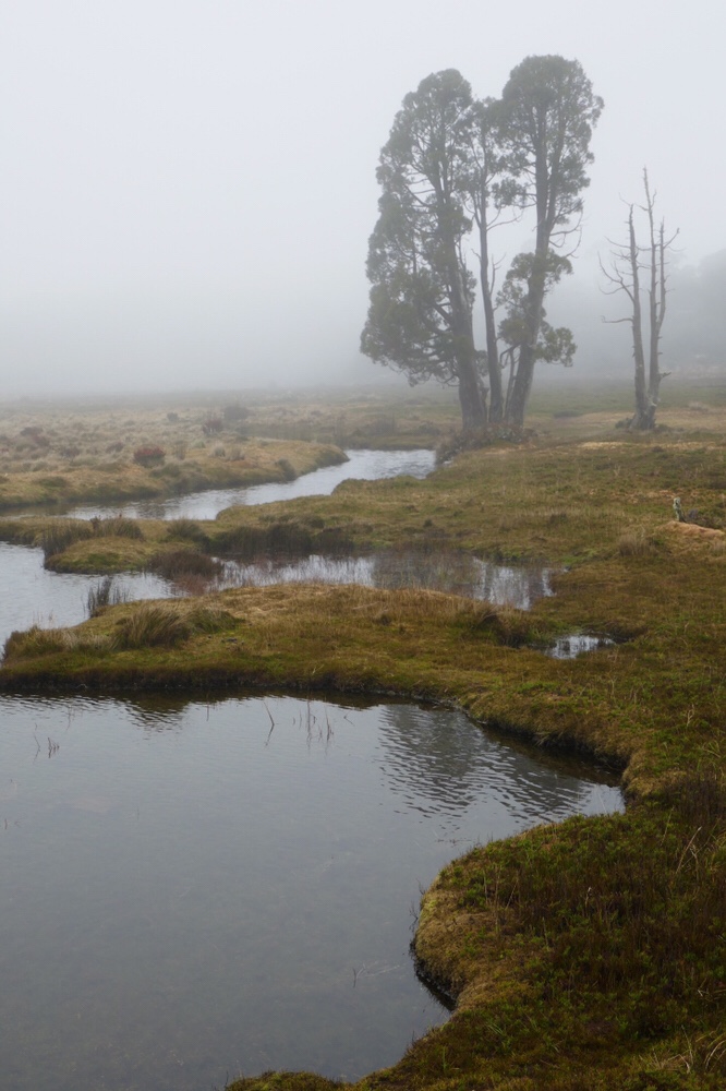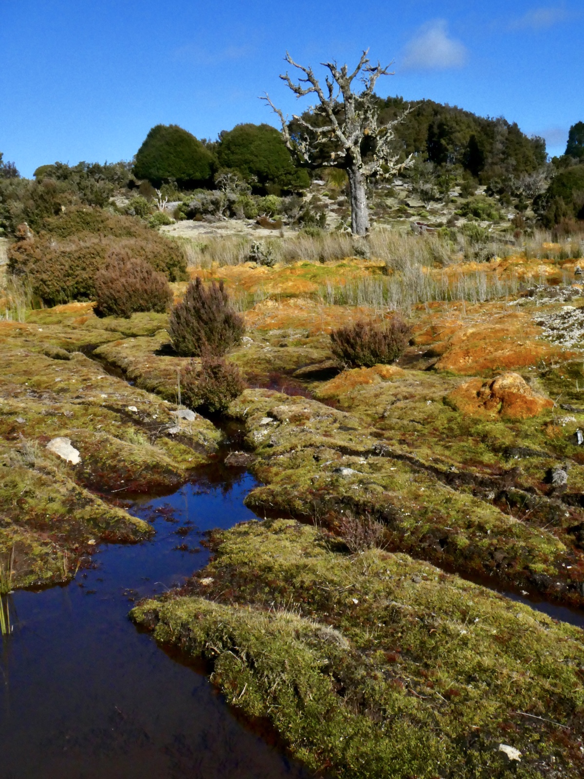 We left the coast, losing sight of water and waves, walking on tracks, some muddy, some very muddy, through plains of button grass and heath. Here at last we met the serious mud for which this walk is famous (or is that infamous). I have not described the extensive lengths of track that had mud some 20 cm deep but here some bogs a metre or more in depth and were met with no warning. Nom plopped downwards in front of me as if she was riding a fast elevator straight down. She adeptly lurched to the right placing herself against the more solid edge of the track. Alan helped hoist her out. Luckily her boots stayed on; boots can be sucked off in the process of being extracted from the sucking mud.