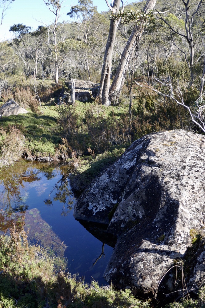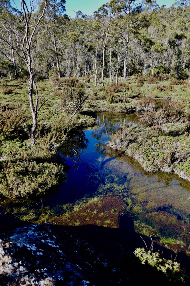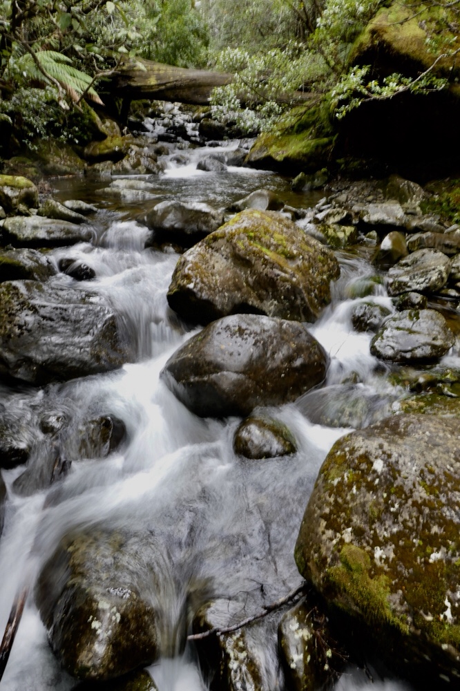 We walked 18 kilometres today and boy, was I tired. I walked down the short track to the river and took many photographs. I followed the river around its bend climbing over branches and balancing on rocks. The water is deeply tannin stained by the tea trees that line the valley and river edge. Like nearly all the water here, it requires no filtration or cleaning. Only at one spot (South East cape rivulet) was the drinking water somewhat brackish and I emptied it as soon as I could to replace it with fresh stream water.