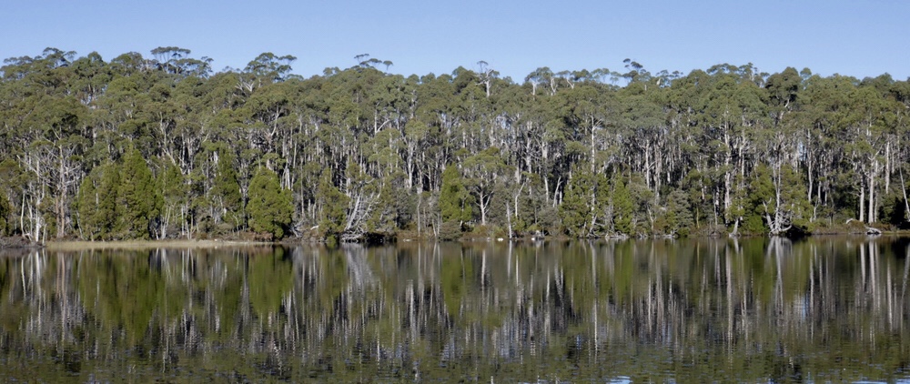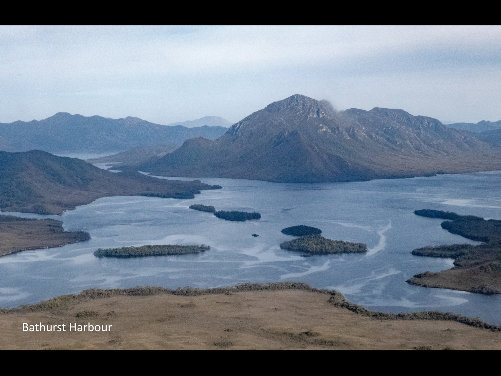 The plane skirted Mt Picton; great buttresses of rock erupted through bare, slopes, all stark and featureless above the dense forest situated below its tree line. Then we saw Bathurst Harbour. It has been barely 45 minutes since we departed Cambridge. The harbour is huge and our destination, Melaleuca, sits on one of the southern arms. Islands dot the harbour. The solitary air strip looks as if a giant pale cream paint roller was run along the ground leaving a narrow white strip. As the plane turns and spirals down, the mountains and ranges all around spin crazily around, until the craft adroitly levels again, and the strip lies in front and just below the nose.