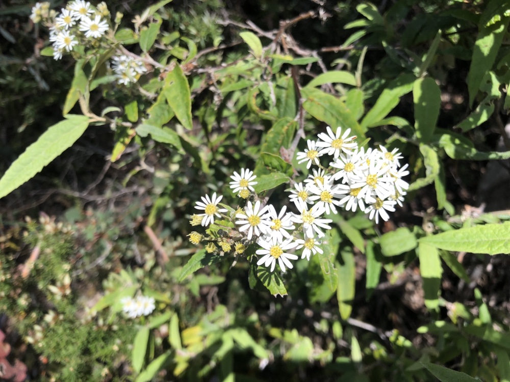 The track dried out considerably as the highest point was reached. The other walkers were waiting under a canopy of tall eucalypts. They were talking about seeing a large tiger snake on the track. I never saw a snake on the entire walk which does not bother me one bit. After a snack and a drink, I hauled my pack back on, and headed down the track. It was a beautiful walk, a track winding its way gently downhill amongst tall straight mountain gums, between ferns and scattered native trees. Then the track emerged suddenly into splendid sunshine before carrying along a boardwalk to the lunch spot; the route sinuously twisting in a landscape of dense heath and small native trees.