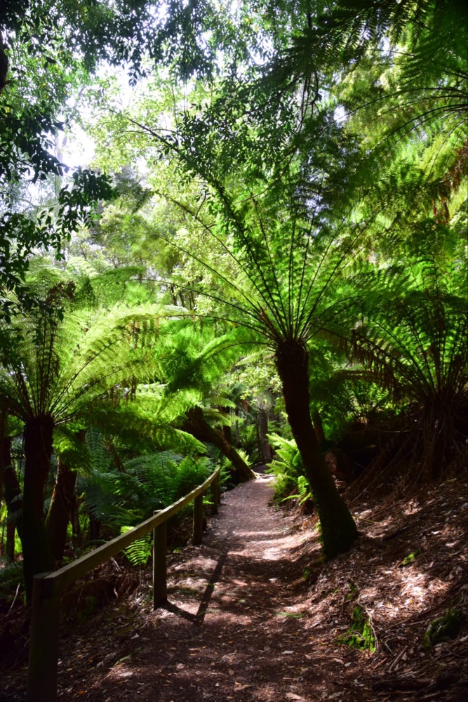 The track wove its way up and down through forests of tall eucalypts and ancient tree ferns, their litter of shed leaves and fallen fronds making this steep track deliciously soft underfoot. The fronds of the many ferns hanging above shone with golden auroras of light from the setting sun. I was simultaneously tired in one sense but refreshed in another; it is strange how two such contrary feelings can exist side by side. Now, the walk meets a steep uphill section, then turns beginning a gentle downhill meander that seemed to be take me near the beach, so close I felt I was about to arrive, then it drifted away, time and time again this happened before finally I arrived at the beach.