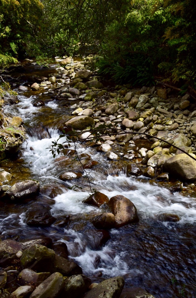 I walked along the stony uphill section of the beach, past Lionhead rock and I would have carried on all the way to Cockle Creek given the ease of the walking. Earle tapped me on the shoulder and telling me I had walked right past the campsite. I had seen the steps leading up the site but carried on anyway. It was located very close to the stream where I had stopped earlier to drink. The timber stairs are solid and well built. The drop on either side of the steps is a few metres. I am a bit nervous of heights, but Nom sensing my concerns, had told me of a useful trick. Hold your poles in front of you and just in the periphery of your vison. The brain sees this as a wall and if you don’t dilly dally, the brain can maintain this illusion long enough to descend a staircase or steep, narrow slope or a narrow bridge.
