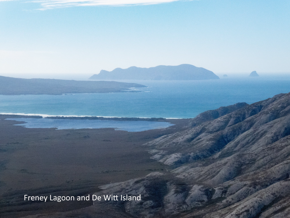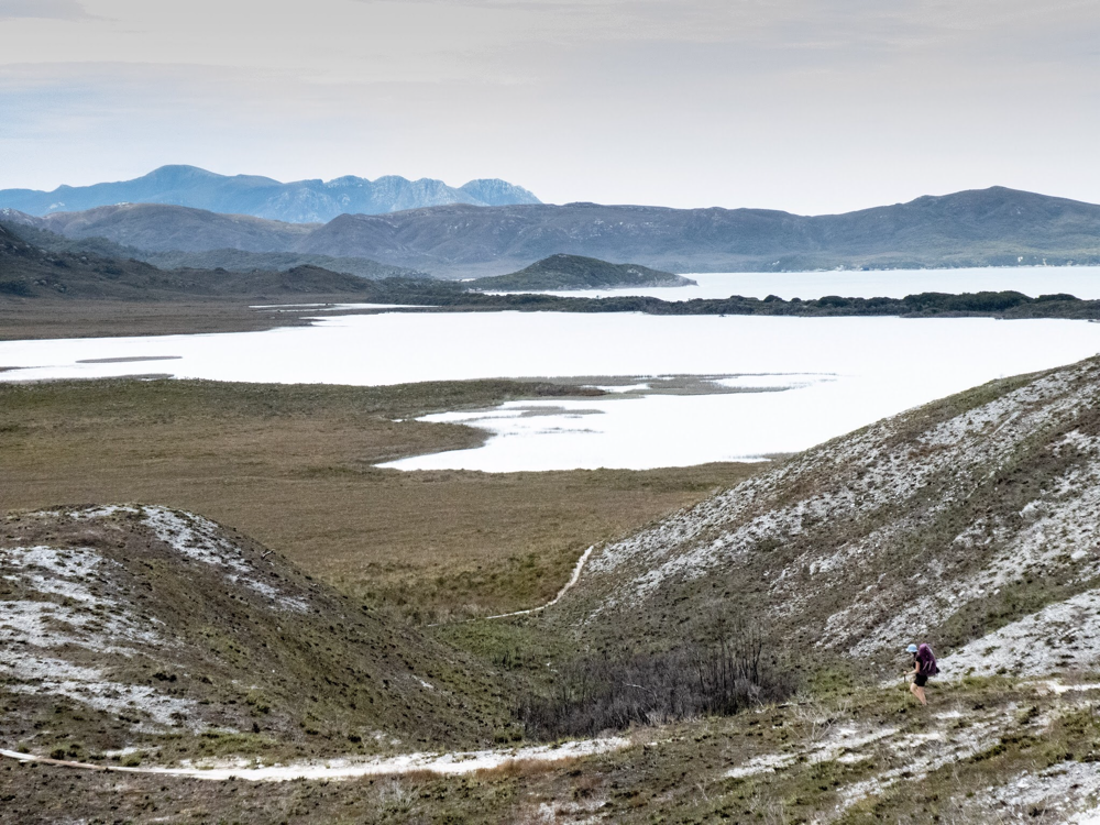 The track slews up and around the lower eastern slopes of New Harbour range. Freney lagoon is a brackish large body of water that lies behind the beach at Cox Bight. Freney lagoon was grey; a silver shimmer danced on its surface in marked contrast to the long lines of rolling white surf coming into Cox Bight from the Southern Ocean.