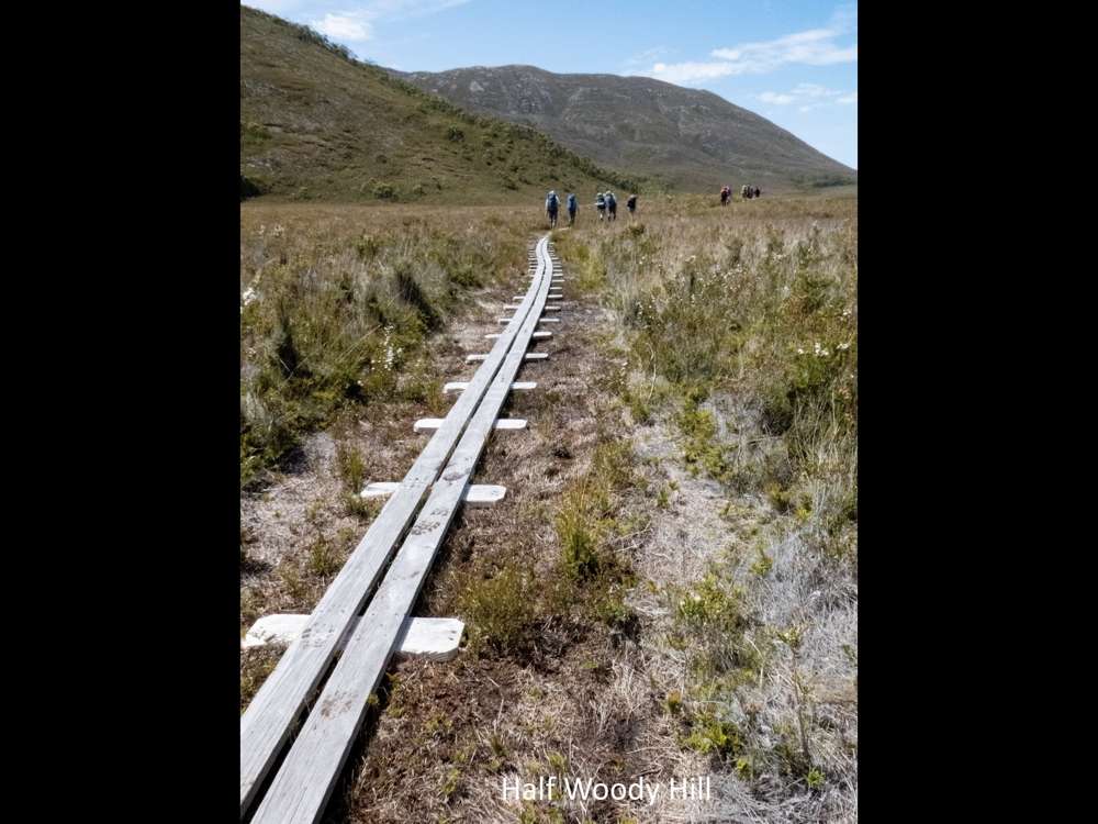 The boardwalks are few on this section of the walk. Typically, they consist of two parallel boards, 10 cm wide and 2 metres long; there is usually no chicken-wire (anti slip) covering them. This is not a problem in the dry conditions we have had on our walk but in the wet the timber can be very slippery indeed. I should mention that the weather conditions of this current walk are exceptional; dry, minimal rain, warm sunny days. Look it certainly makes for easier, more pleasant walking but the plants, especially ferns and shrubs looked stressed. They flourish in and are adapted for wind, cool weather and frequent rain, not these persisting sunny, hot and dry conditions. Even while I was walking this section, fires were kindling north of me, in the heart of the South West Wilderness Area.