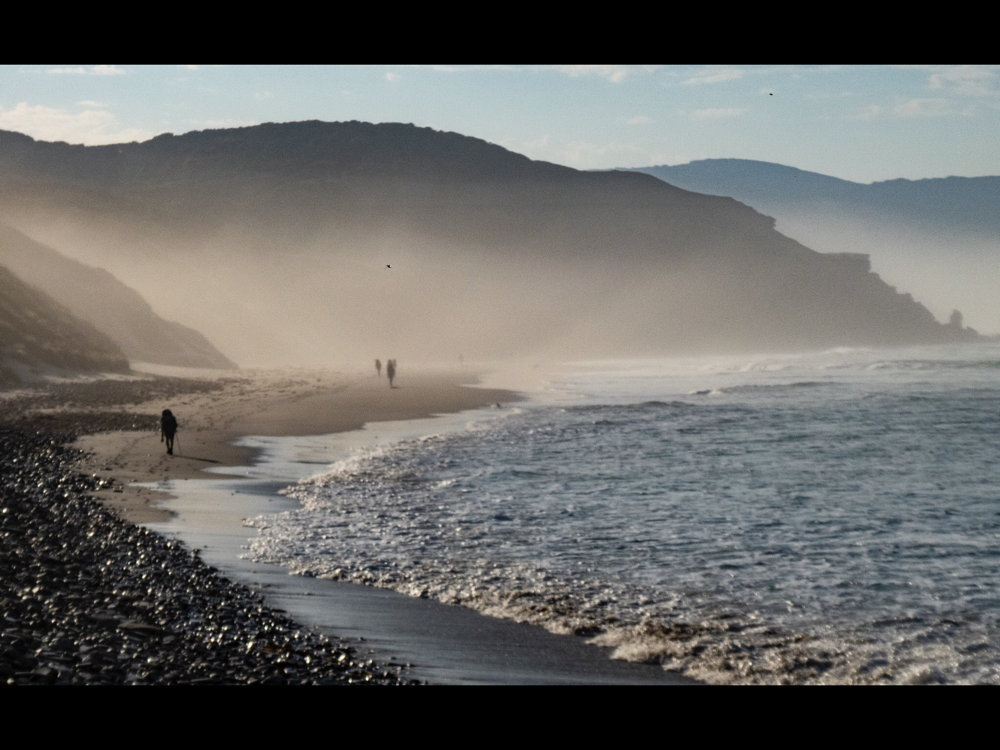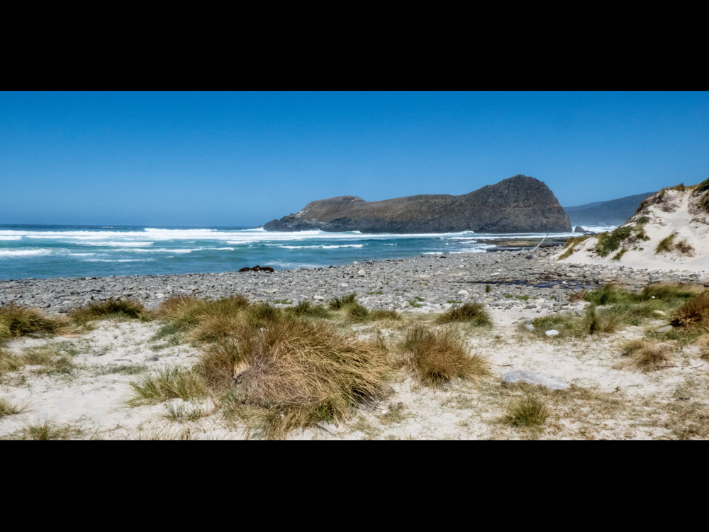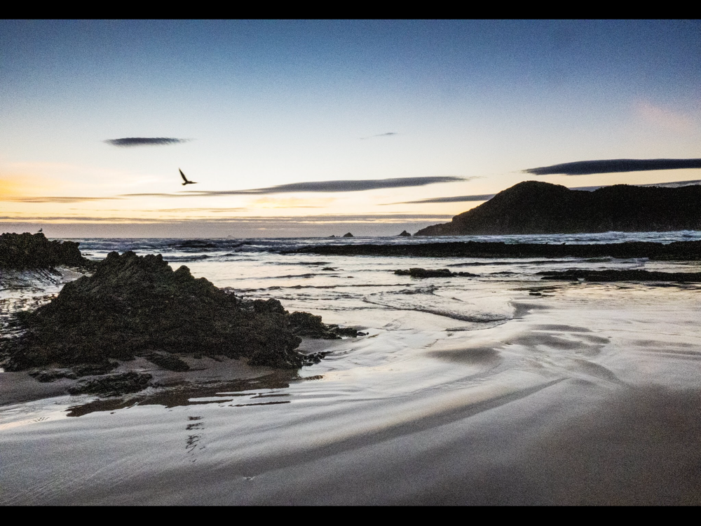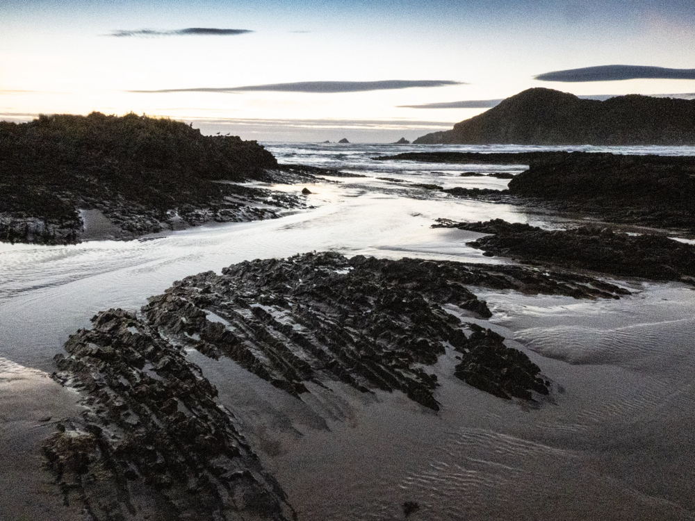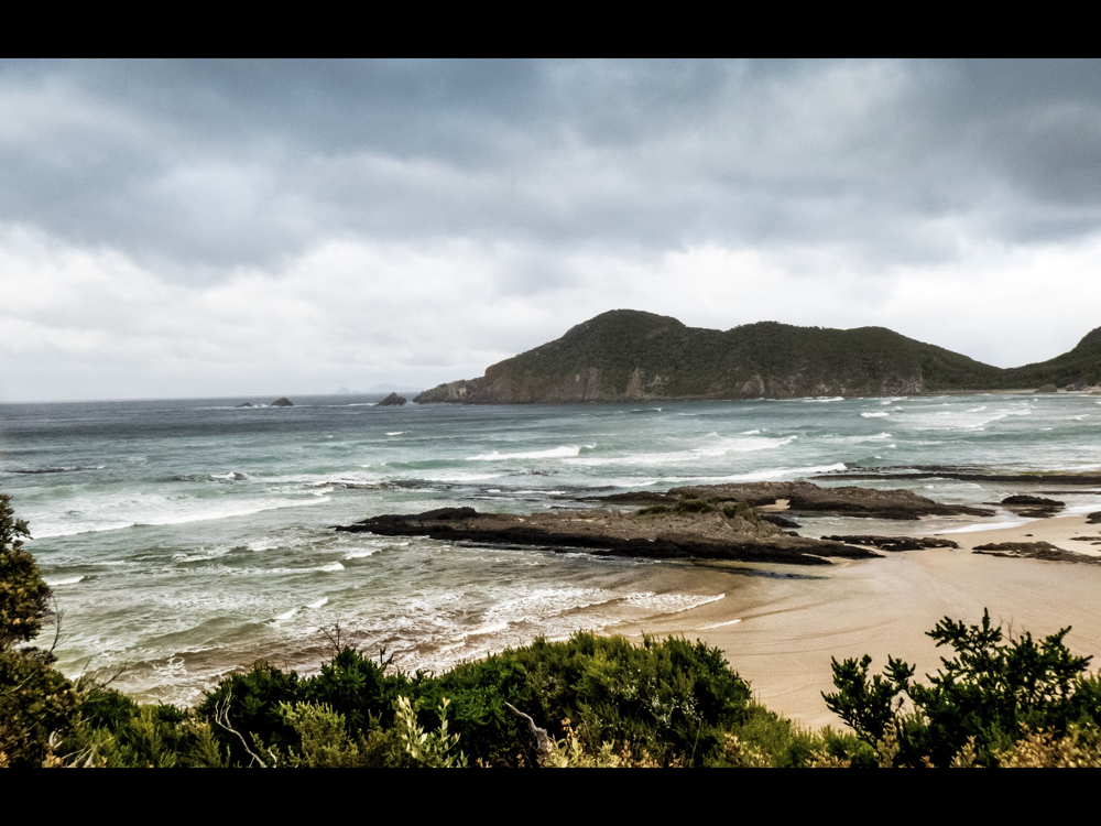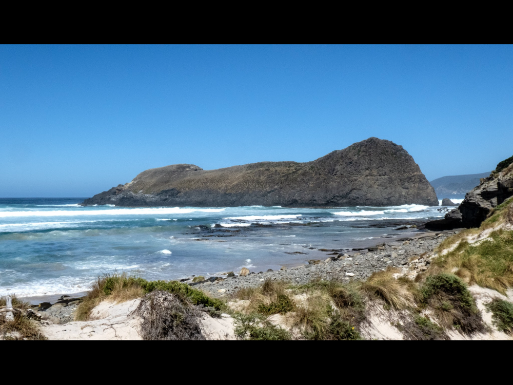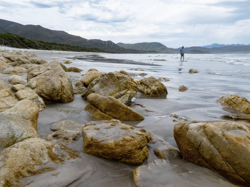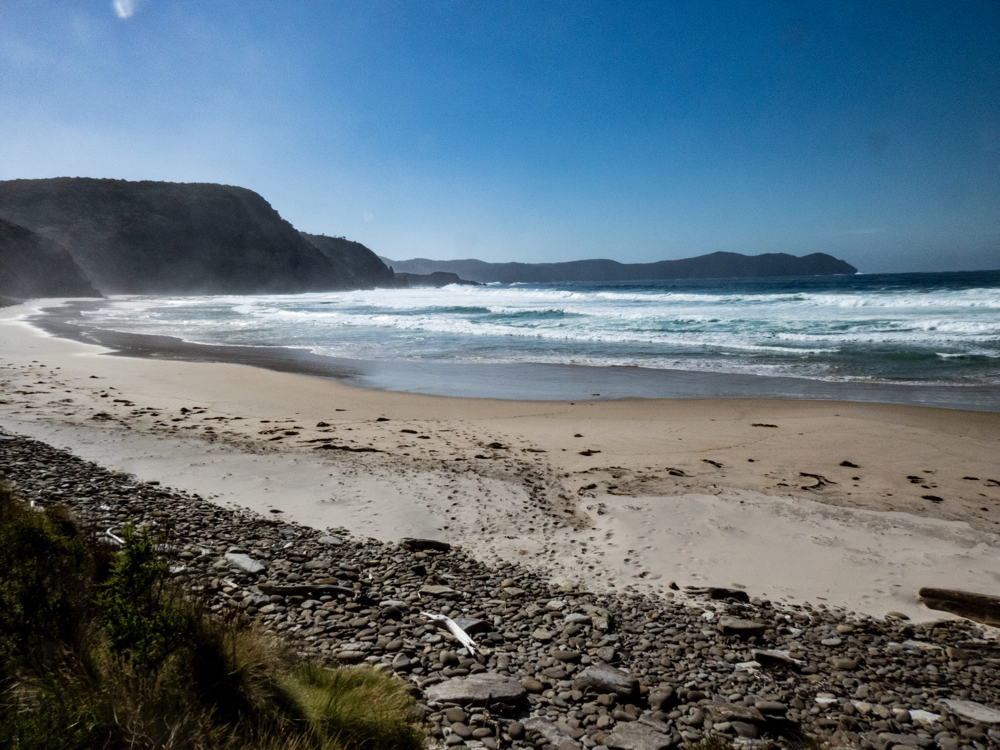 It is only a short walk along the beach to the campsite near Eric Point. The campsite is both beautiful and sheltered. After setting up my tent I walked along a sandy track back down to the beach. White sand within the reach of water darkens to metallic grey as surf transmutes and merges into repeating circles on the bank; wavelets ascend the shore then fall back, awash into the sea. This blisteringly clean beach and coast is magnificently back dropped by Eric Point and New Harbour range.