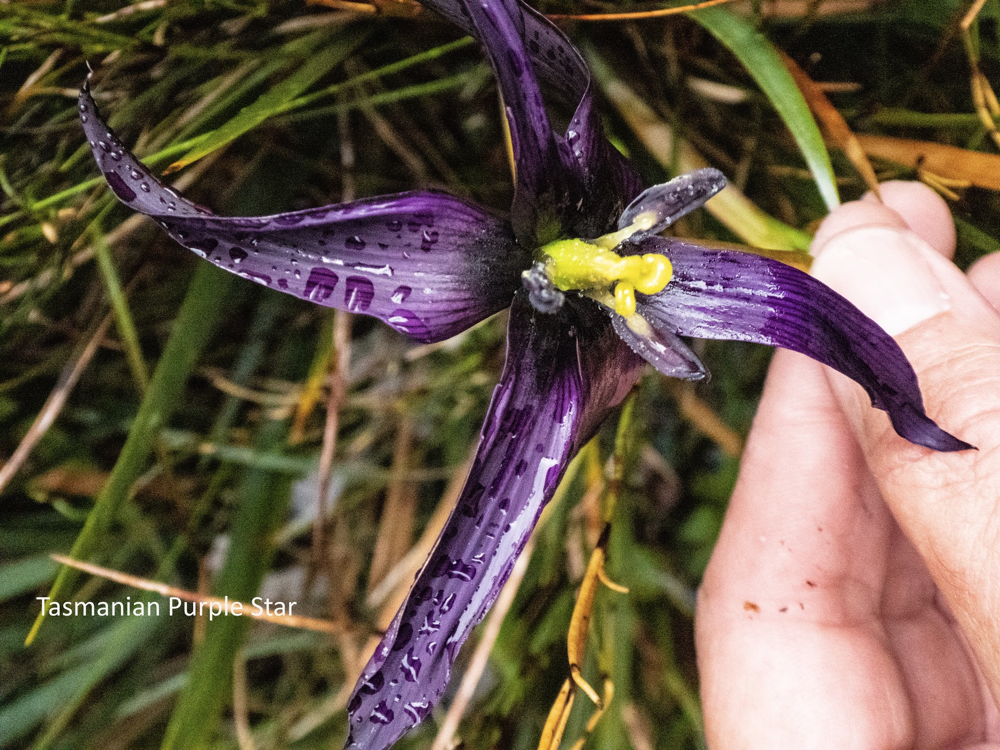 Nom and I found several flowers, including: a Tasmanian Star lily which for all the world looks just like an orchid – it’s a purple flower with long petals and a yellow stamen and style. I photographed this in rain and wind and somehow the shot worked. There were many other flowers including; other irises, Christmas bells with their cherry red bells, spider orchids which should be too delicate for these places but thrive here, and the brown and beautiful duck orchid. Orchids are the largest of all plant groups. They get their nourishment not from photosynthesis like most plants. They have symbiotic fungi that tap into other plants root systems and steal nourishment from them and then shares the stolen sugars and minerals with the orchid perched gaily above.